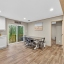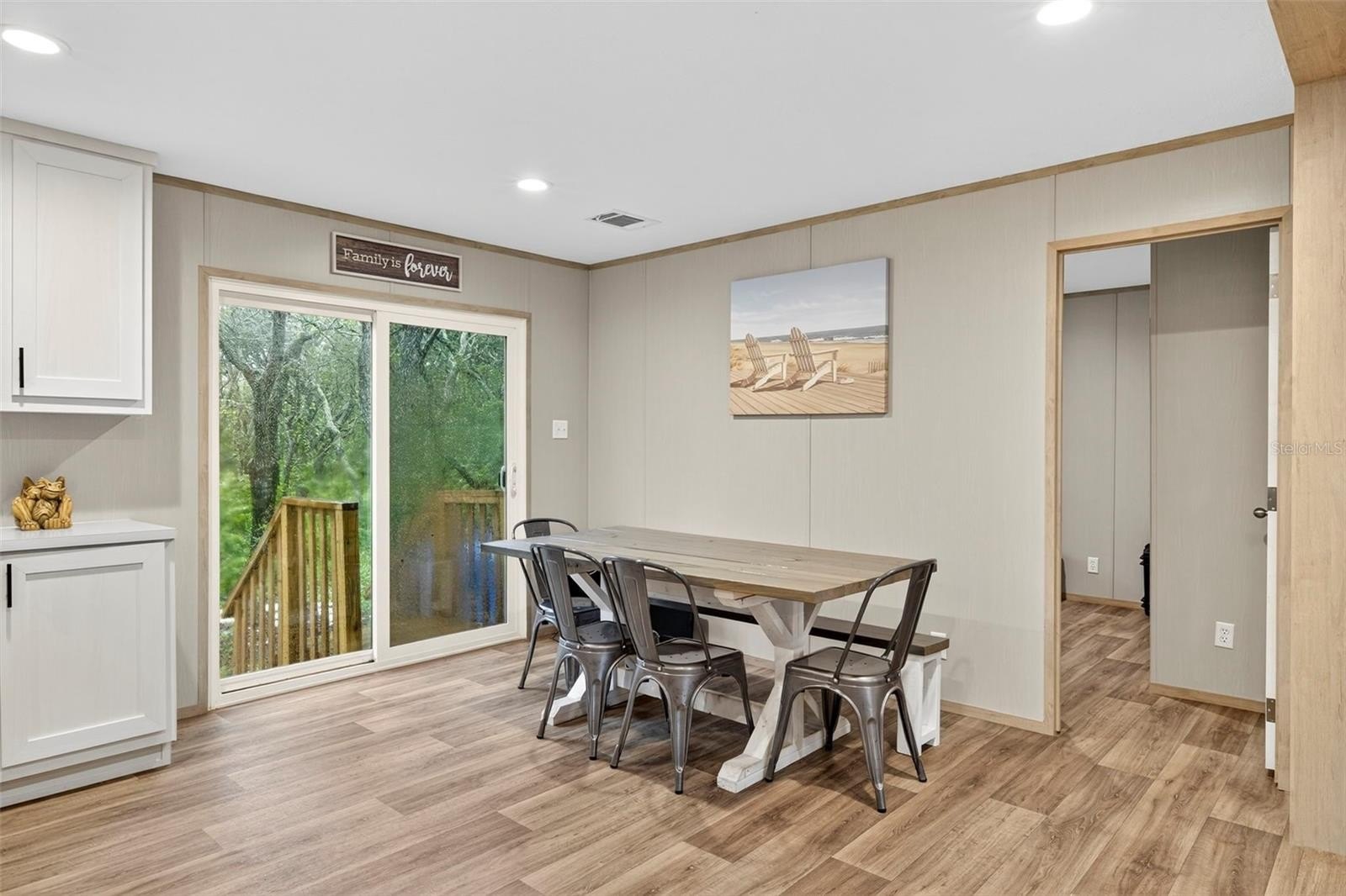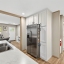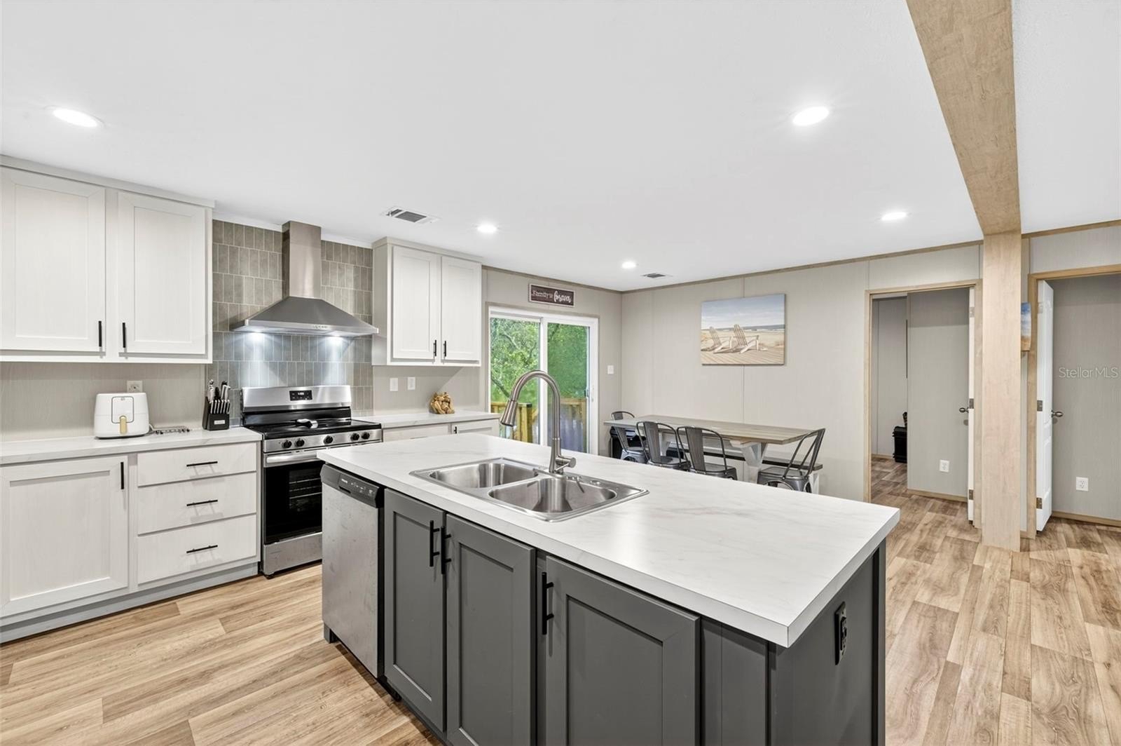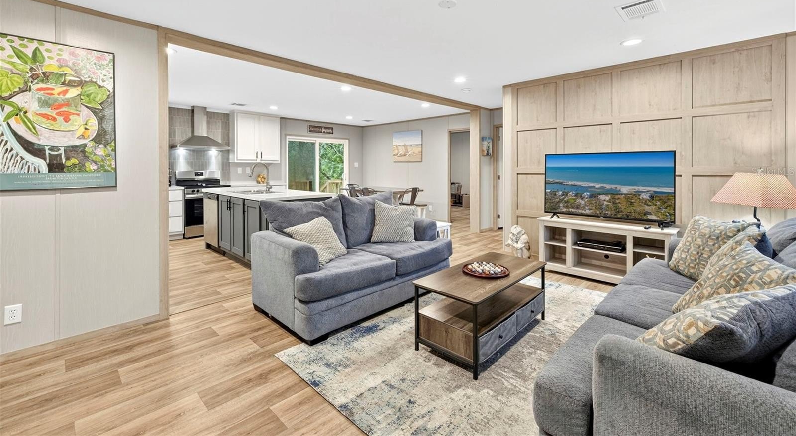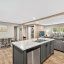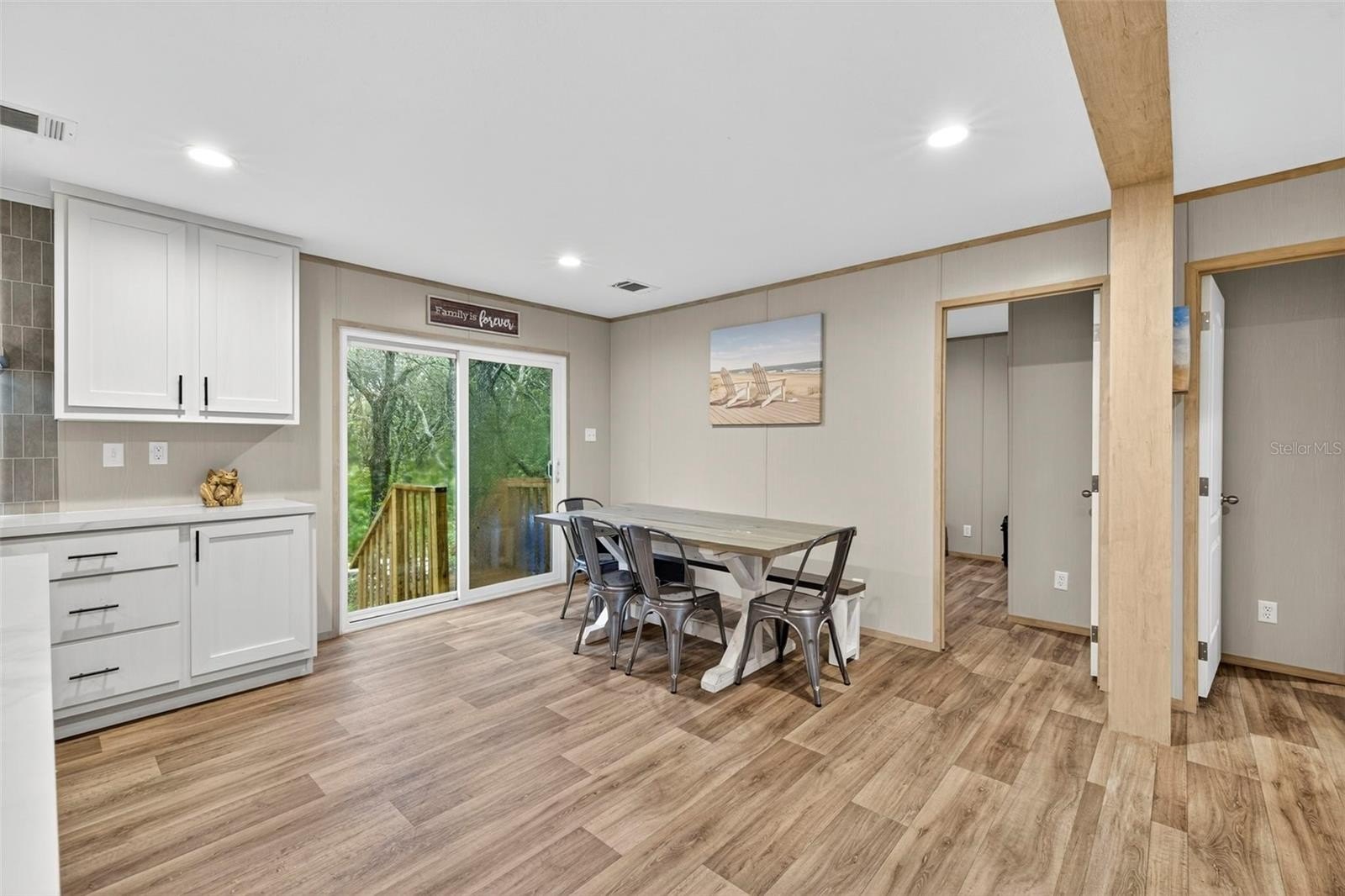The home is a 2024 Clayton De Soto model featuring an open layout with luxury vinyl flooring throughout. Recessed lighting and a bright, functional design create a comfortable atmosphere. The kitchen includes an island with seating for three, stainless steel appliances, and ample cabinet space around the refrigerator and cooktop. Sliding doors open from the dining area to the backyard, perfect for indoor-outdoor living.