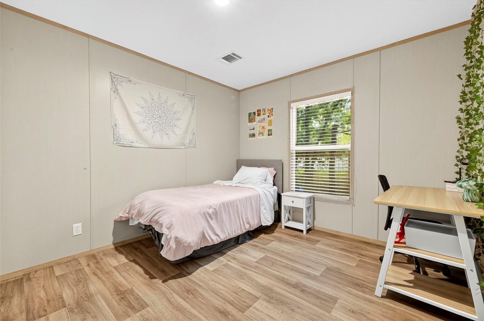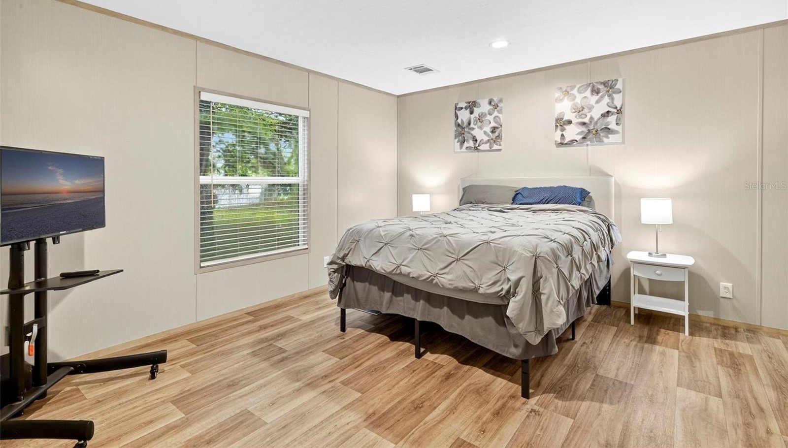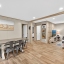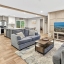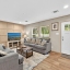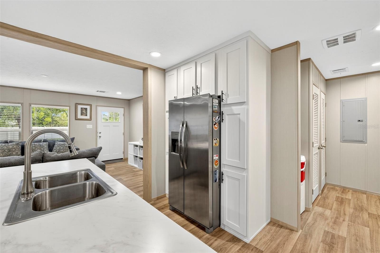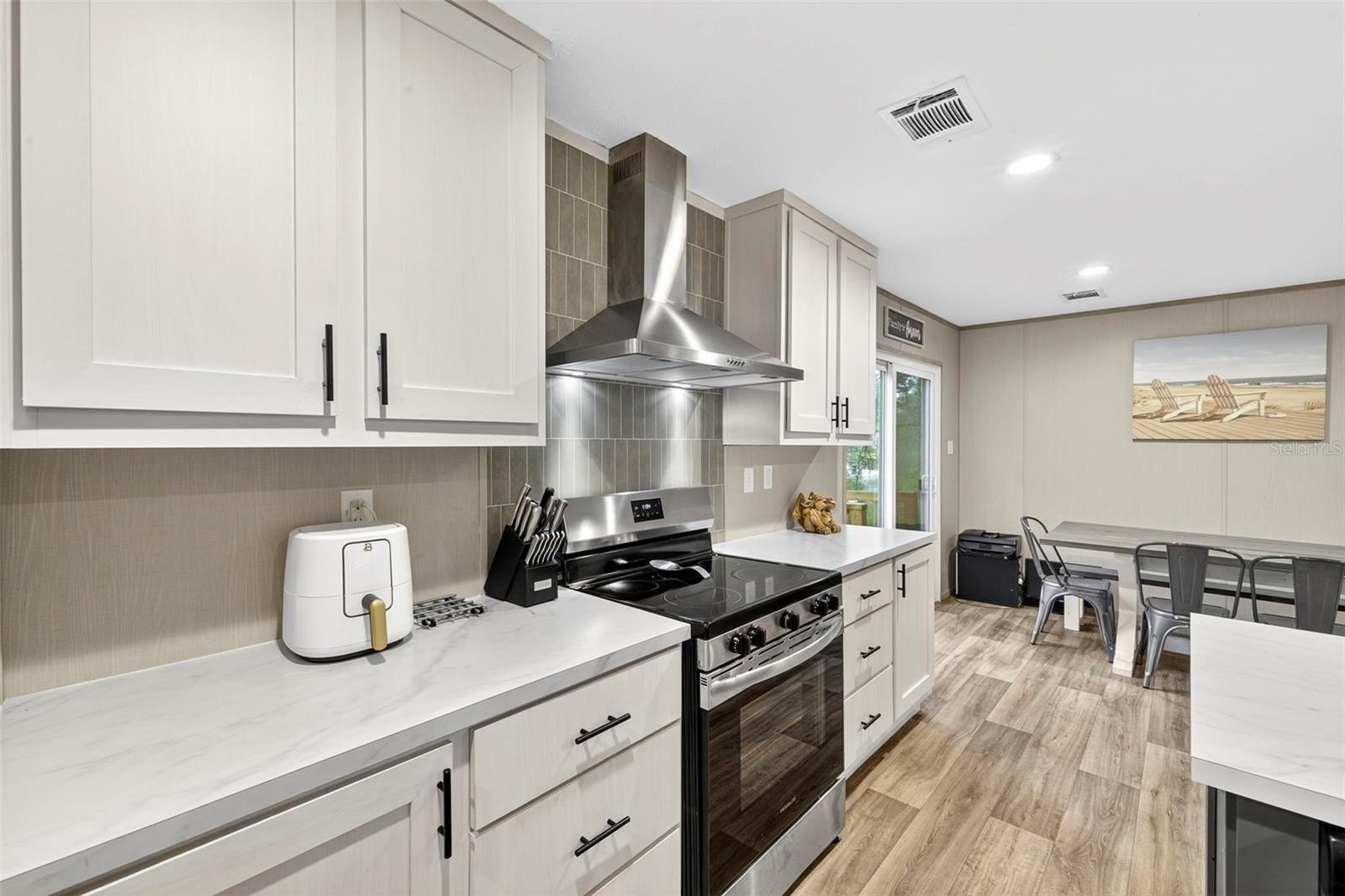 The home is a 2024 Clayton De Soto model featuring an open layout with luxury vinyl flooring throughout. Recessed lighting and a bright, functional design create a comfortable atmosphere. The kitchen includes an island with seating for three, stainless steel appliances, and ample cabinet space around the refrigerator and cooktop. Sliding doors open from the dining area to the backyard, perfect for indoor-outdoor living.