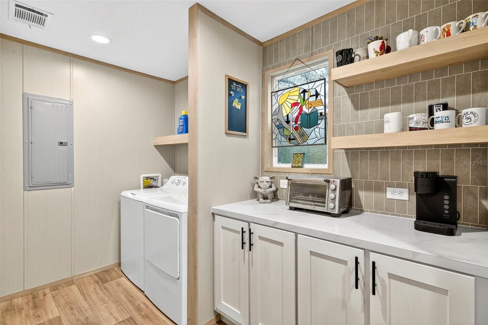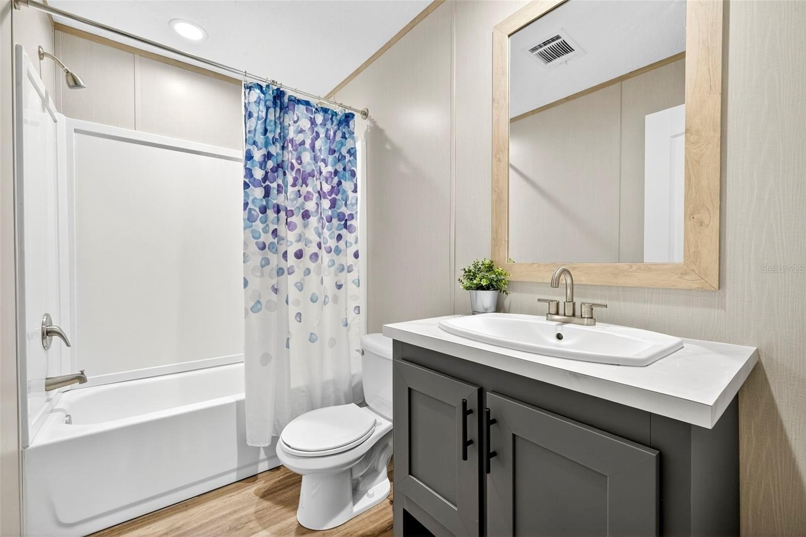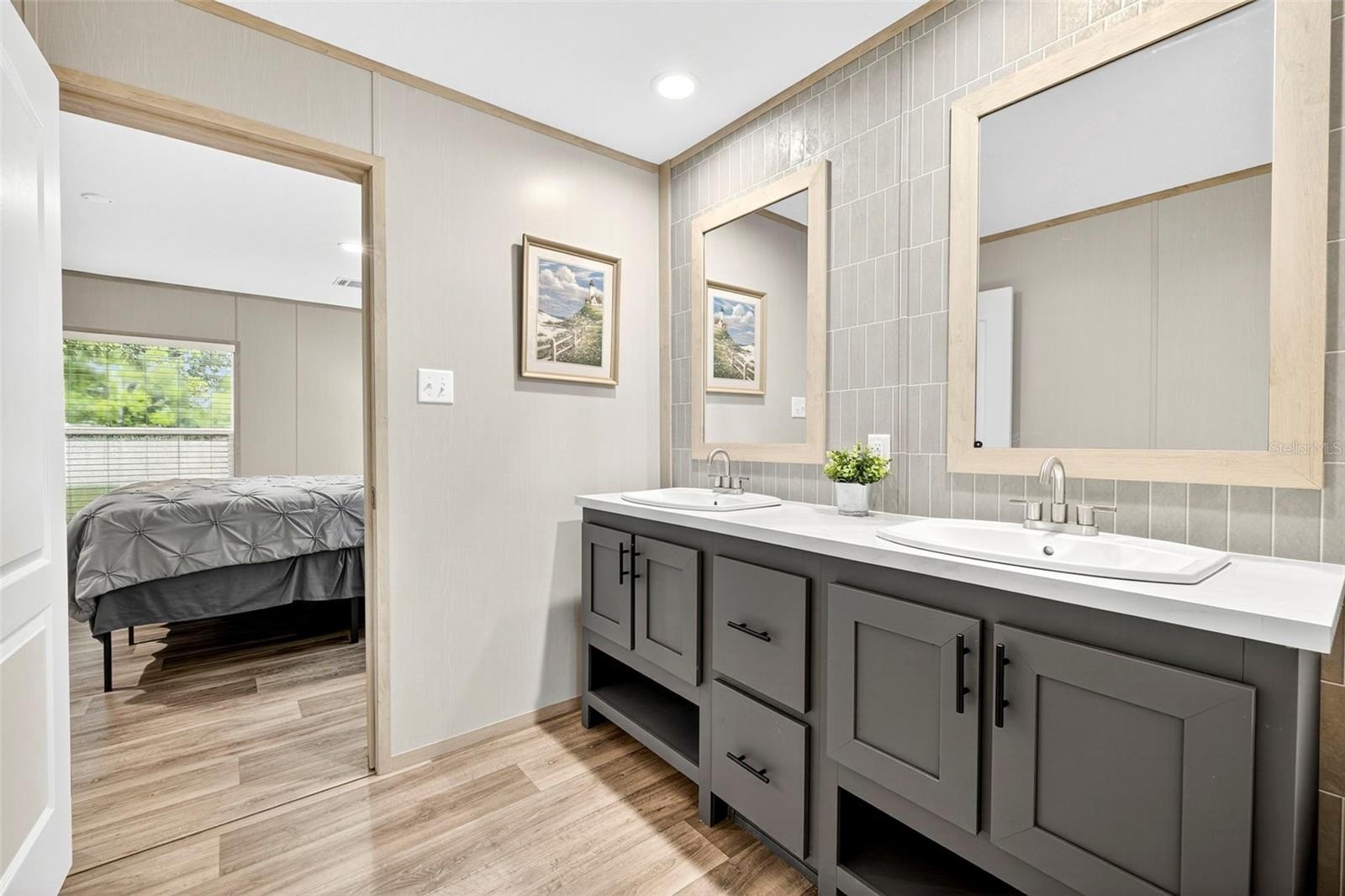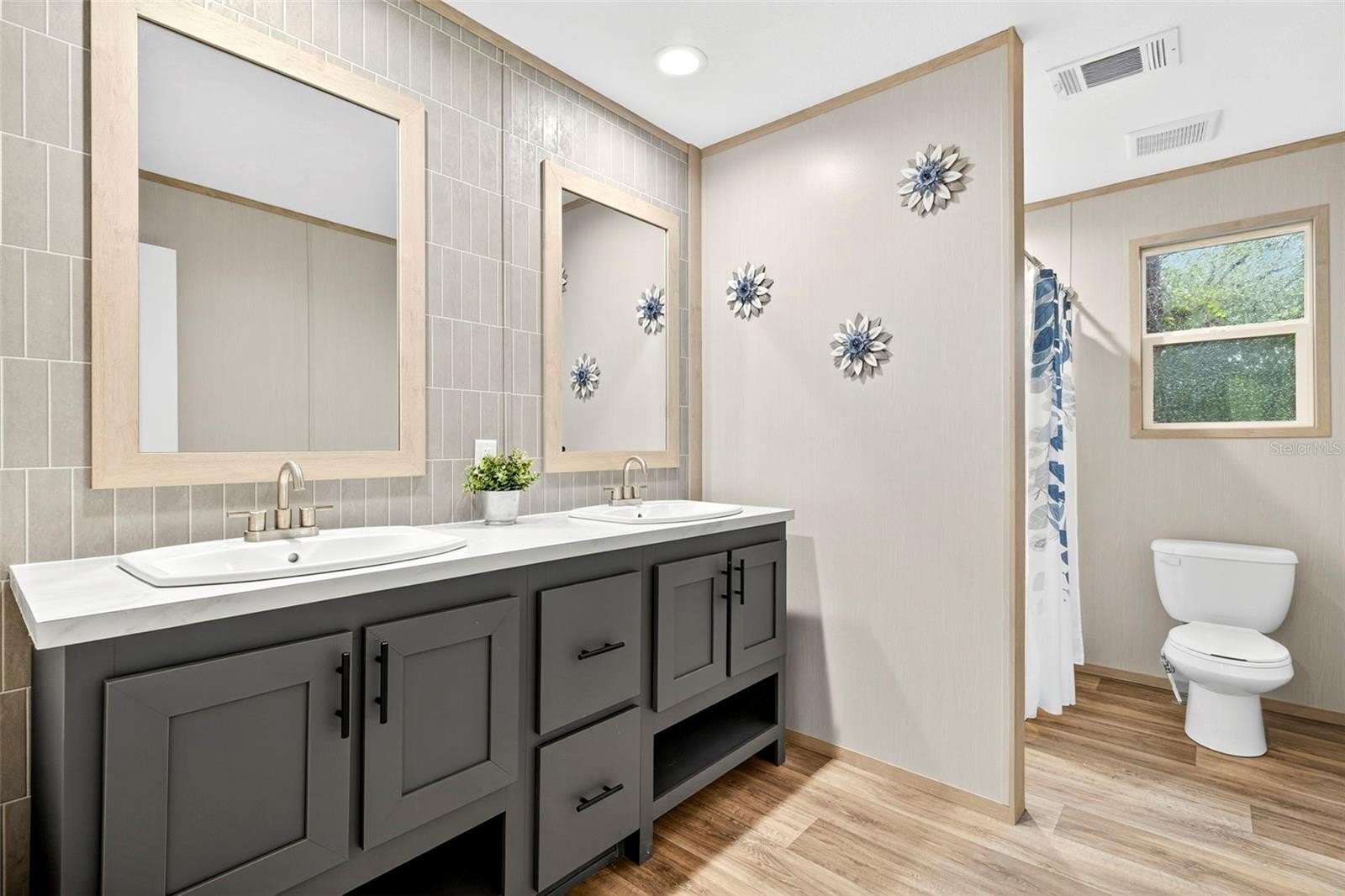 This residence offers three spacious bedrooms, including a primary suite with an above-average sized bedroom, bathroom with dual vanities, and a large walk-in shower. A modern laundry area with washer and dryer is also included.