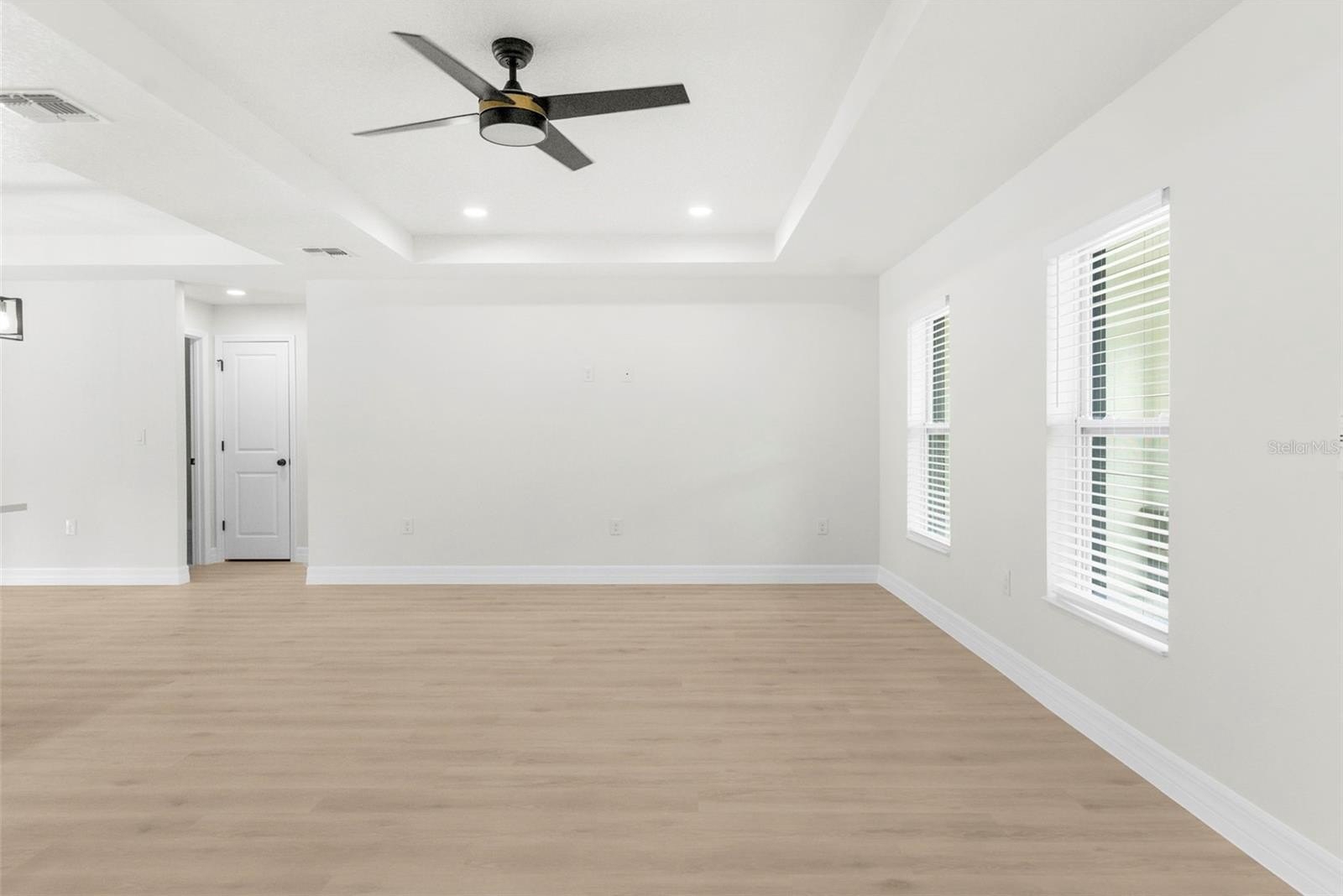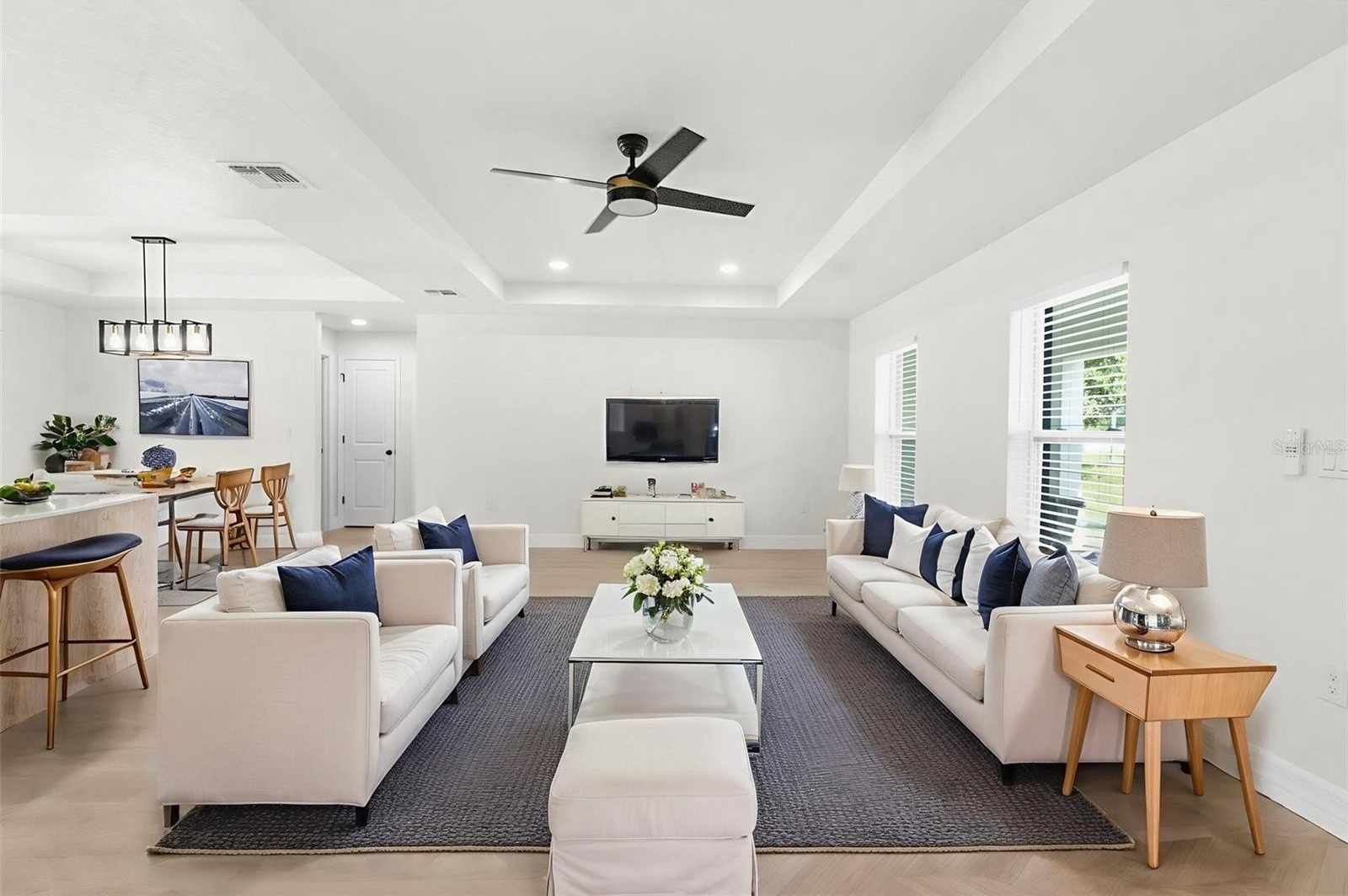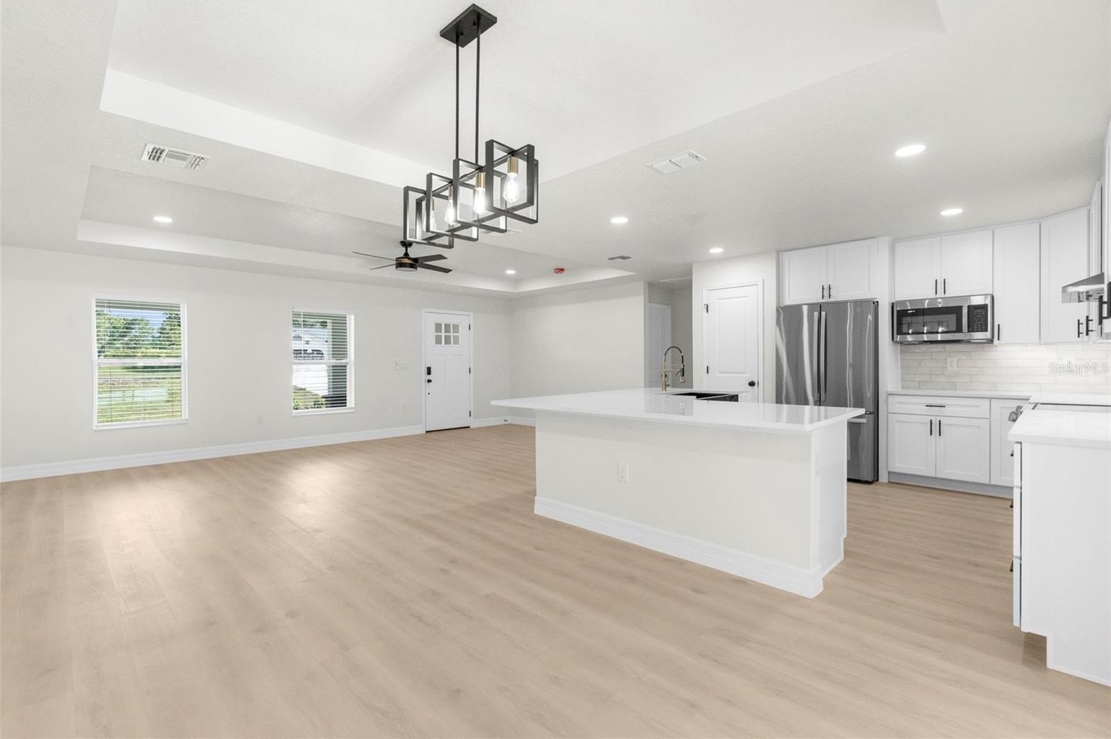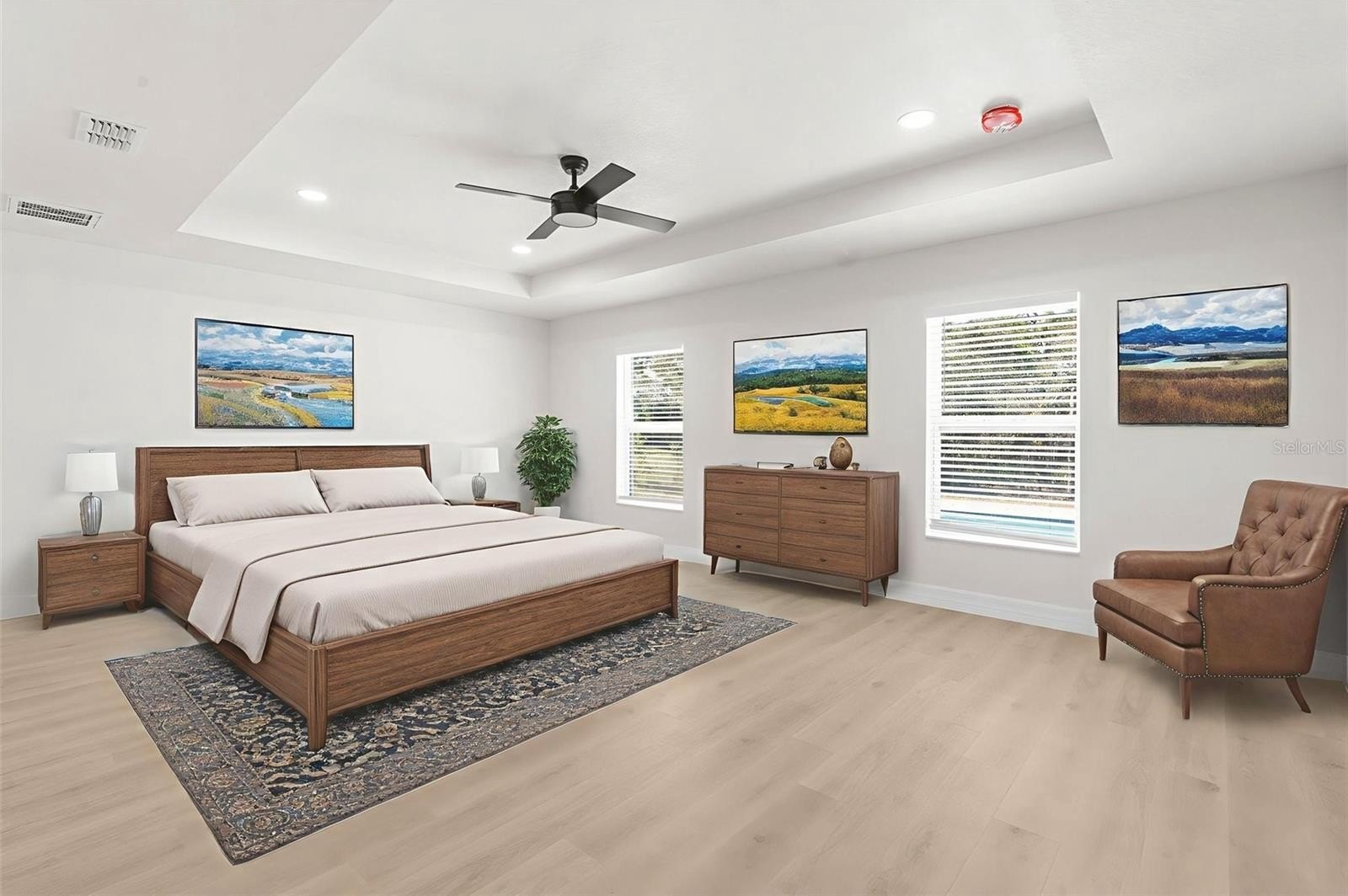 Showcasing designer details throughout, including soaring custom tray ceilings, luxury vinyl plank flooring with zero transitions, a chef’s dream kitchen with custom soft-close cabinetry, quartz countertops carried throughout the home, upgraded stainless steel GE appliances, a fully finished garage with epoxy floors, and so much more—blending style with functionality. The spacious master suite offers a spa-like retreat with a soaking tub, oversized walk-in shower, and an ENORMOUS custom closet system designed to impress.