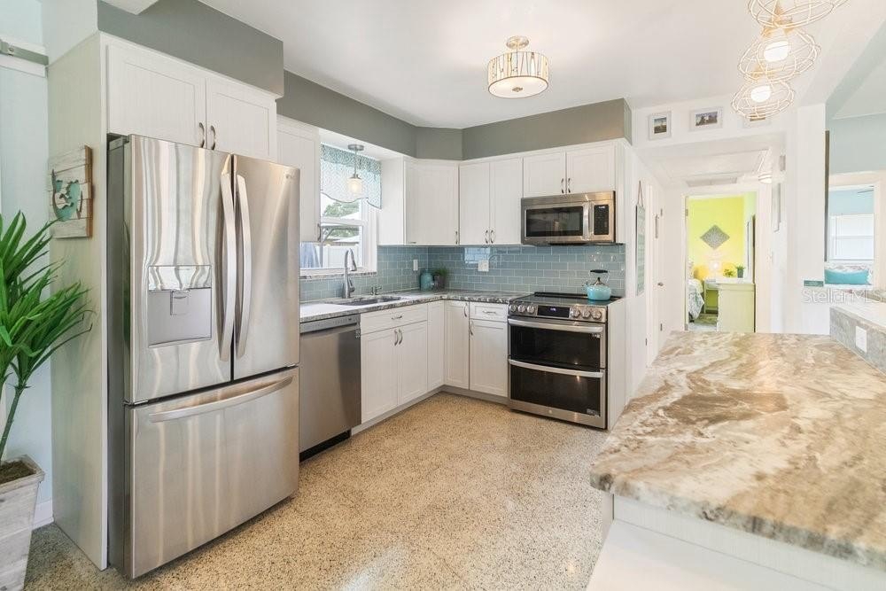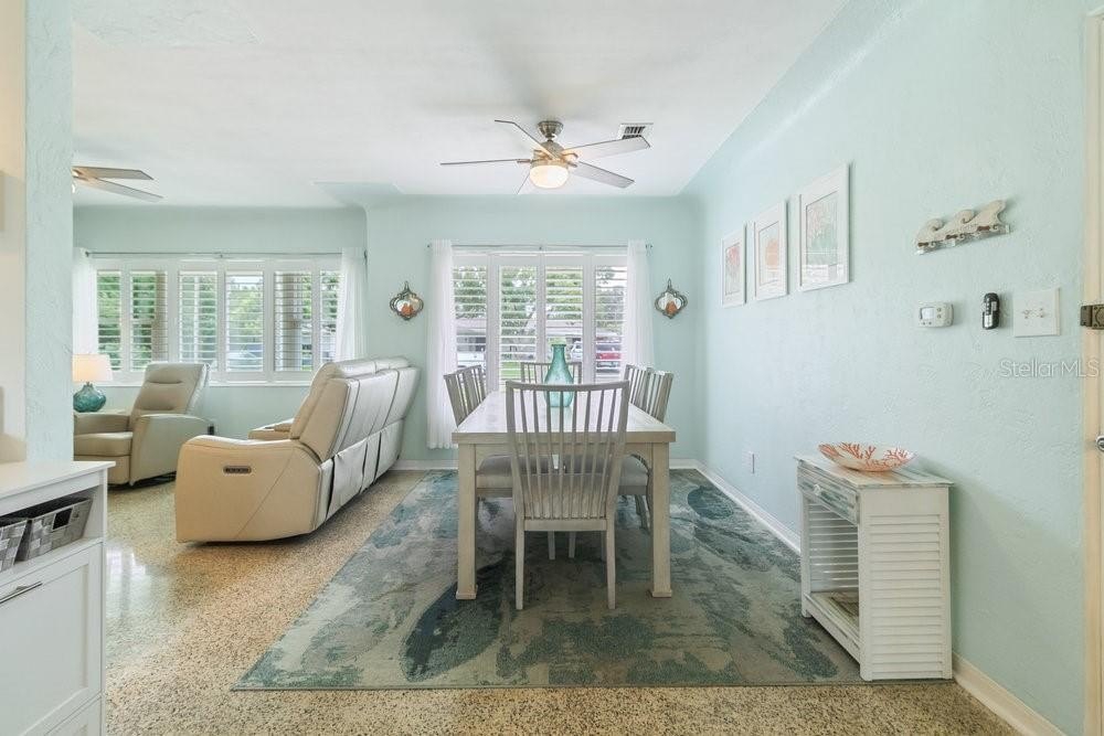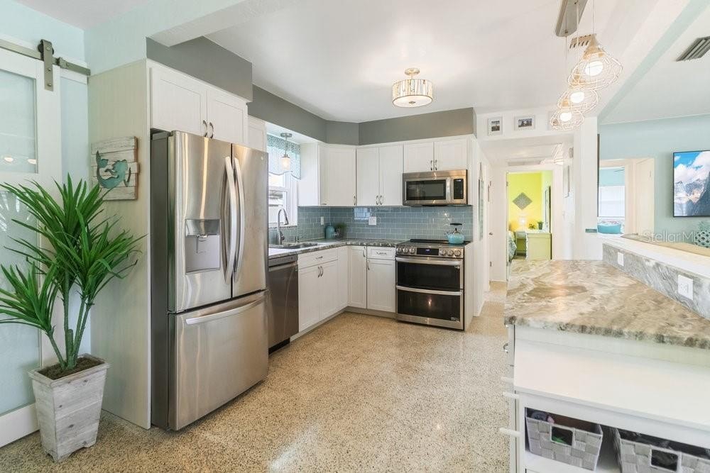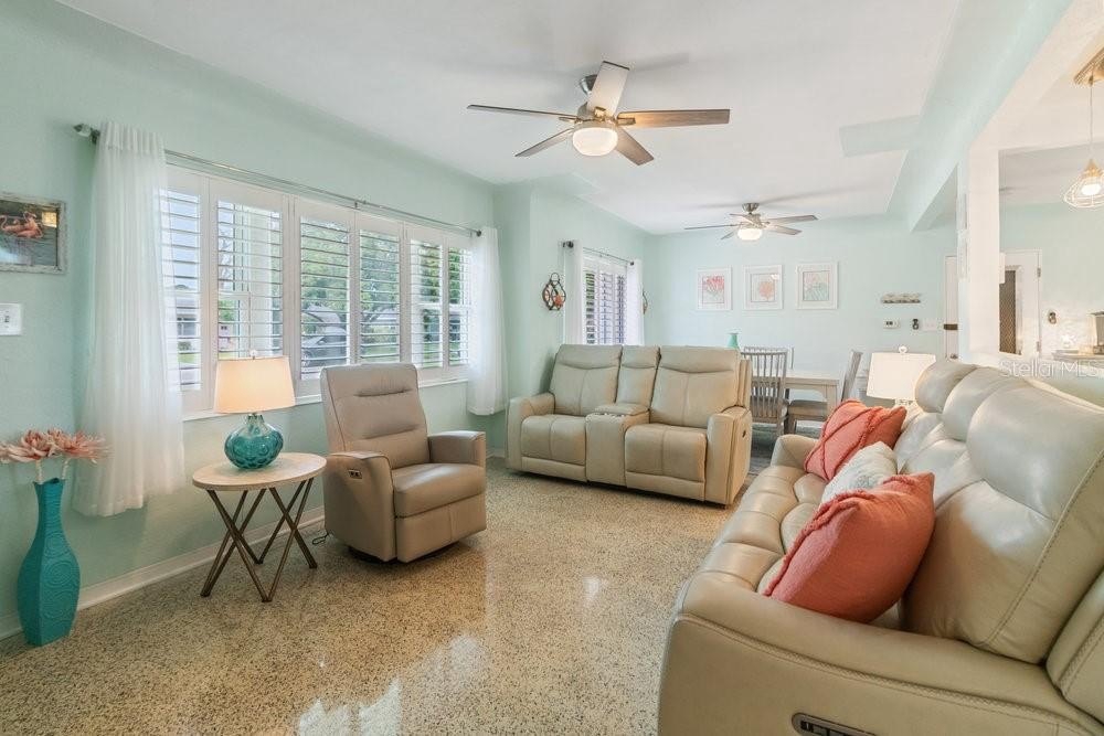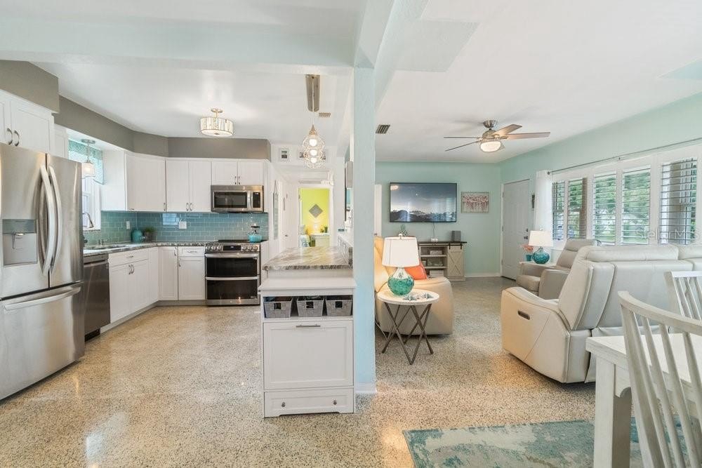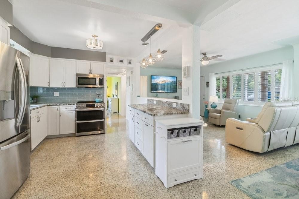 Step through the front door to find original terrazzo flooring throughout all common areas, including the kitchen, creating a timeless and durable finish. The kitchen underwent a full renovation in 2019 and showcases granite countertops, solid wood cabinetry, and stainless steel appliances—including refrigerator, microwave, dishwasher, and double oven range—all updated in 2023. Both the kitchen and guest bathroom were remodeled down to the studs, with the guest bathroom completed in 2018, ensuring a modern and move-in-ready experience. Custom plantation shutters add a refined touch throughout the home.