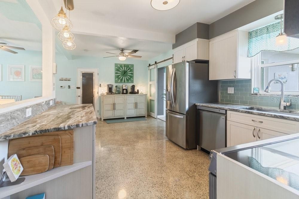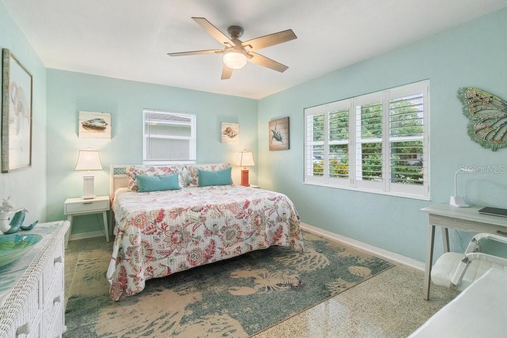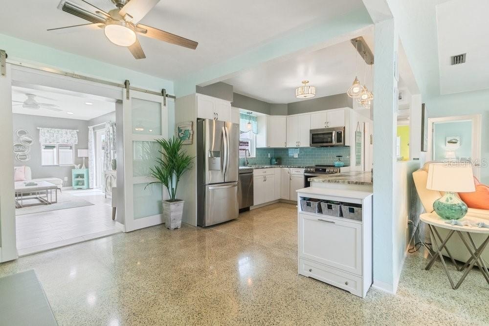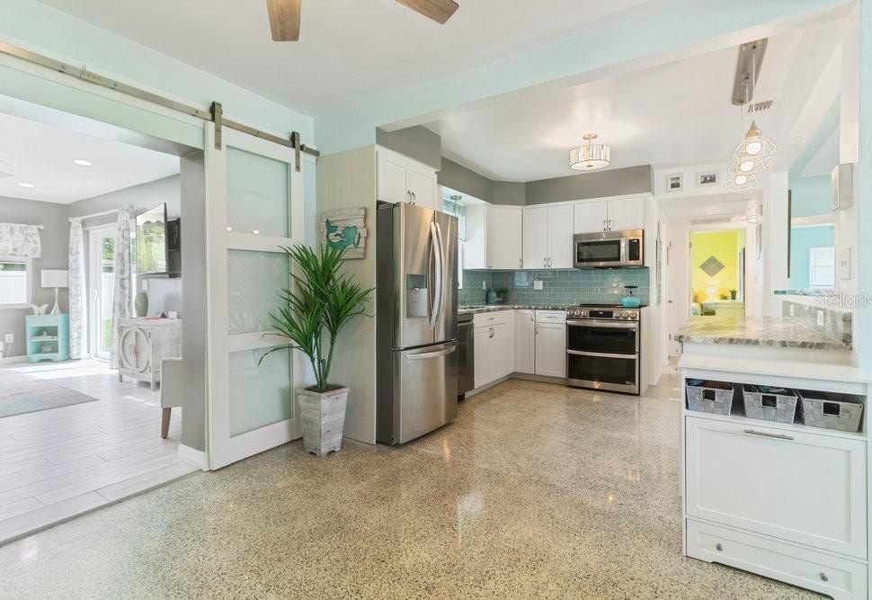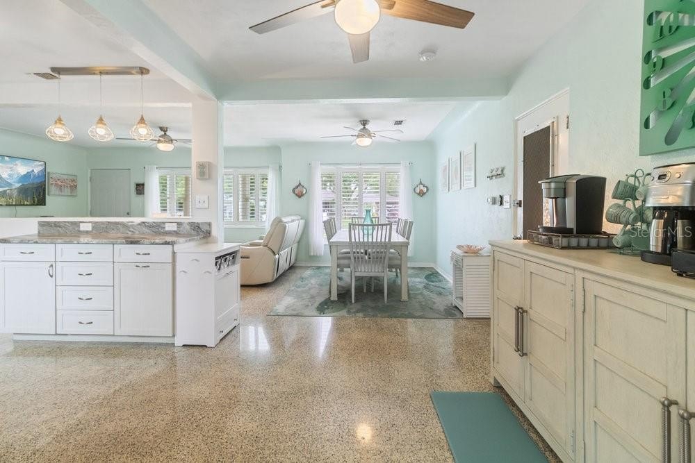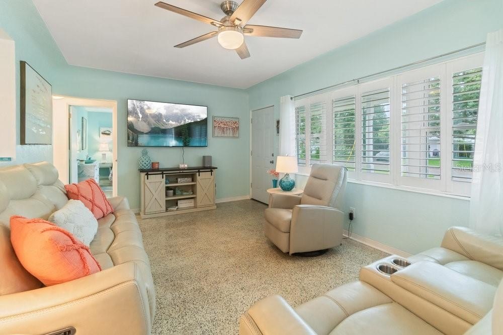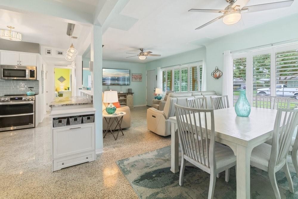 Step through the front door to find original terrazzo flooring throughout all common areas, including the kitchen, creating a timeless and durable finish. The kitchen underwent a full renovation in 2019 and showcases granite countertops, solid wood cabinetry, and stainless steel appliances—including refrigerator, microwave, dishwasher, and double oven range—all updated in 2023. Both the kitchen and guest bathroom were remodeled down to the studs, with the guest bathroom completed in 2018, ensuring a modern and move-in-ready experience. Custom plantation shutters add a refined touch throughout the home.