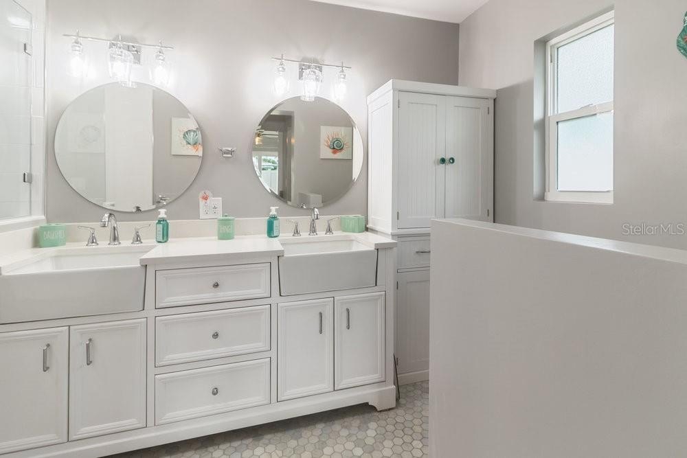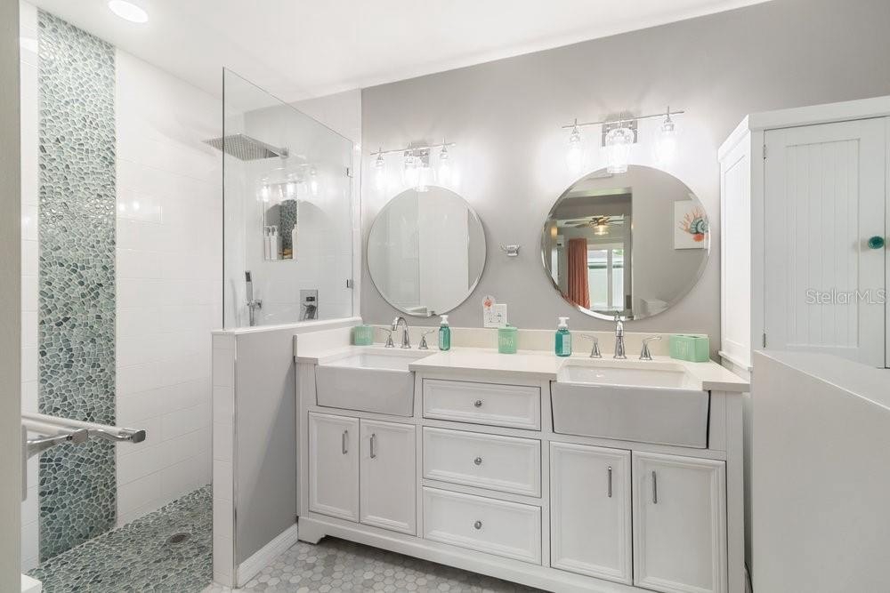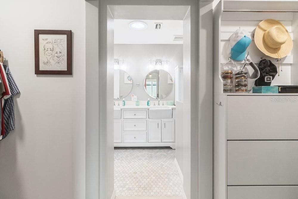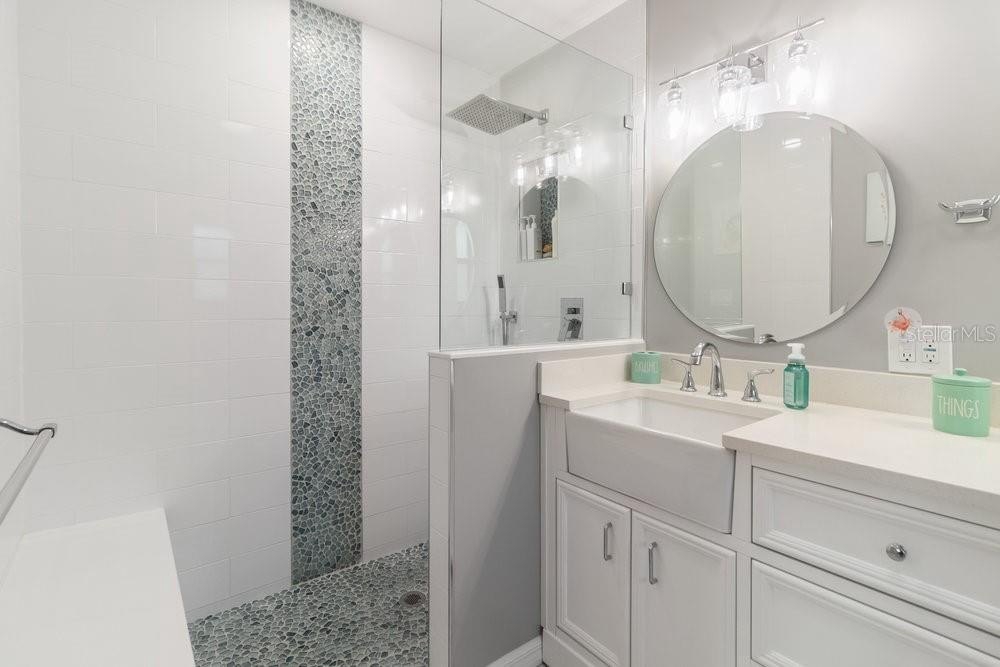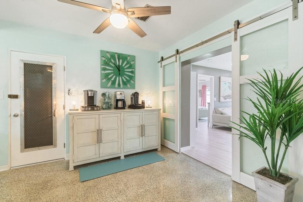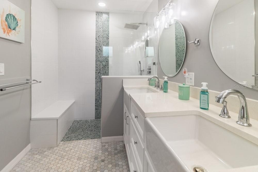 Step through the front door to find original terrazzo flooring throughout all common areas, including the kitchen, creating a timeless and durable finish. The kitchen underwent a full renovation in 2019 and showcases granite countertops, solid wood cabinetry, and stainless steel appliances—including refrigerator, microwave, dishwasher, and double oven range—all updated in 2023. Both the kitchen and guest bathroom were remodeled down to the studs, with the guest bathroom completed in 2018, ensuring a modern and move-in-ready experience. Custom plantation shutters add a refined touch throughout the home.