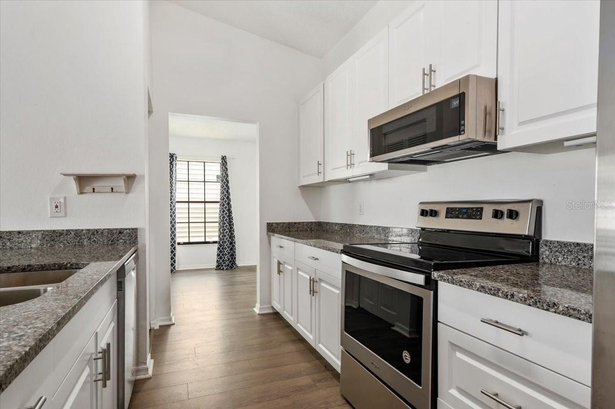 Step inside to discover a bright, open layout with soaring ceilings, laminate flooring, and abundant natural light throughout the main living areas. The modern kitchen shines with stylish cabinetry, stainless steel appliances, a granite eat-in breakfast bar, and ample space for casual dining and entertaining.