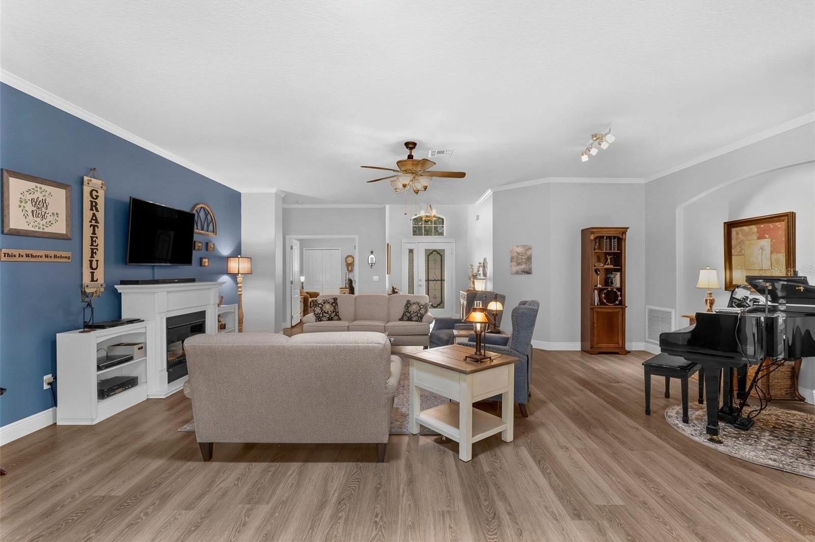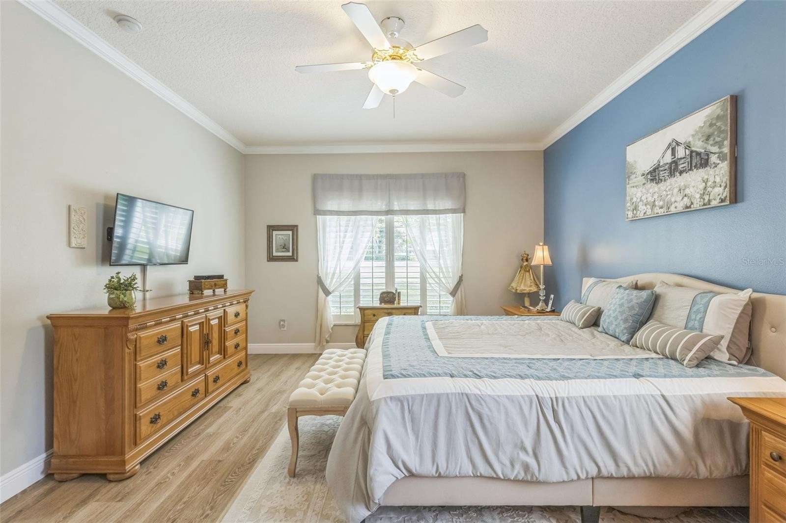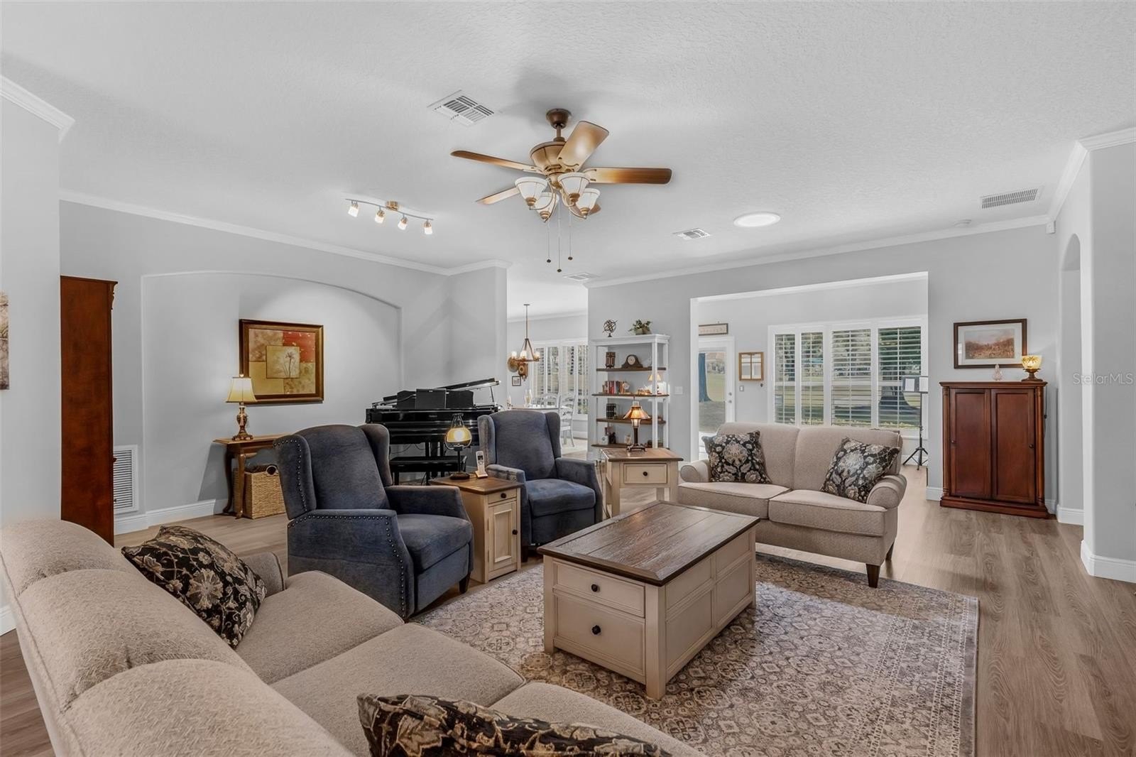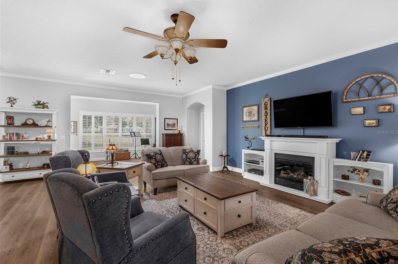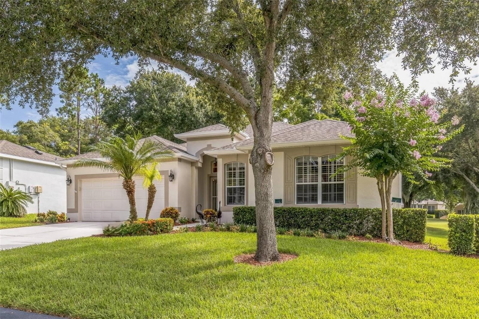 This St. James floor plan backing on the 10th tee of the Kings golf course is located on a beautiful cul-de-sac; certainly, a MUST See. This home welcomes guests as they enter through the attractive beveled glass front door into an open tiled foyer. The OPEN and SPLIT floor plan allows lots of space to gather and entertain with plantation shutters throughout. The Living room, dining, bedrooms have crown molding, 5 1/4” baseboards. The Family room has a view of the golf course. The Kitchen includes appliances, tile backsplash, granite countertops, under cabinet lighting, corner double pantry with motion detector lighting, tray ceiling and opens to a spacious dining nook. LVP flooring is throughout with tiled bathrooms and with multi shower heads, garden tub, dual sinks. Bedroom 2 is off the front of the home with a spacious closet and LVP flooring. Bedroom 3, (Office or Den) has a double door entry, closet and LVP flooring. The garage has updated poly flooring, lots of overhead storage, attic with a dropdown ladder. The roof was replaced in 2014, A/C 2022, water heater 2023, windows updated with new screens and ballasts in 2024. The HOA includes exterior painting every 6 years, reclaimed irrigation, exterior lawn service, basic cable and internet, attended main gate, use of all the amenities such as tennis courts, pickleball, basketball, shuffle board, hot tub, spa, pools, dance room, card room, computer room, library, arts and crafts room, fitness center, ballroom and much more.
