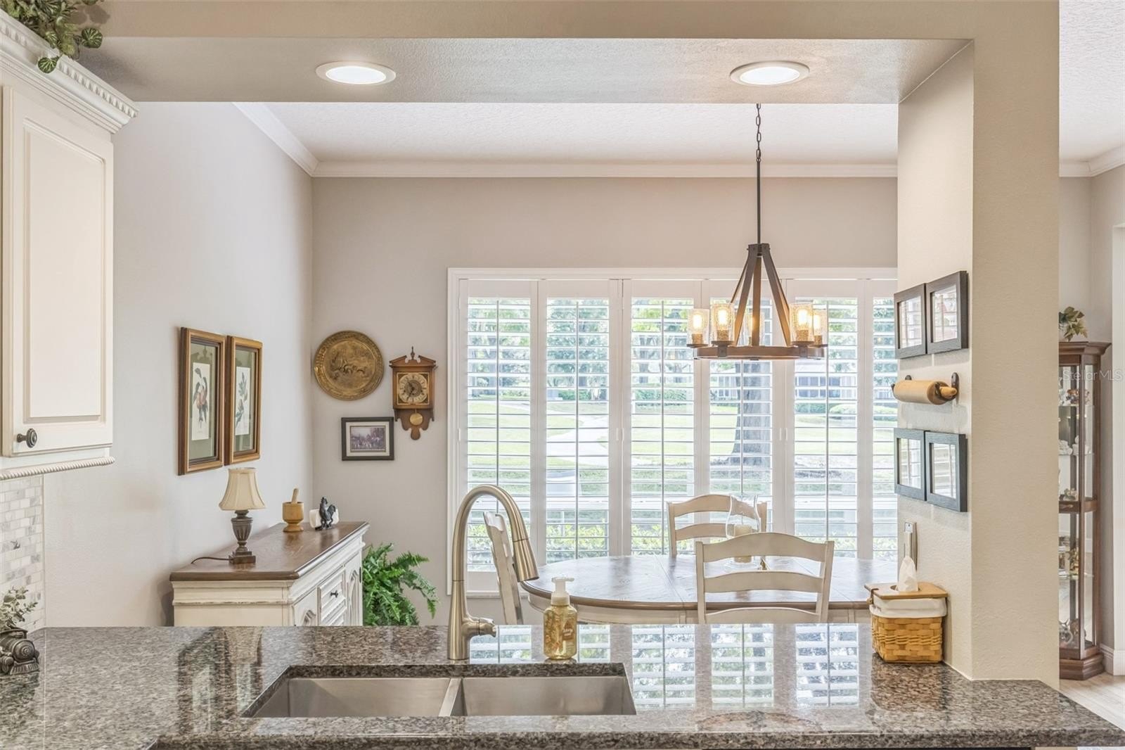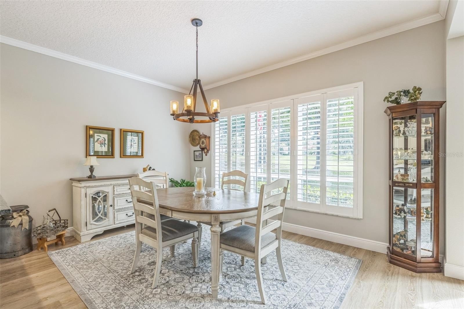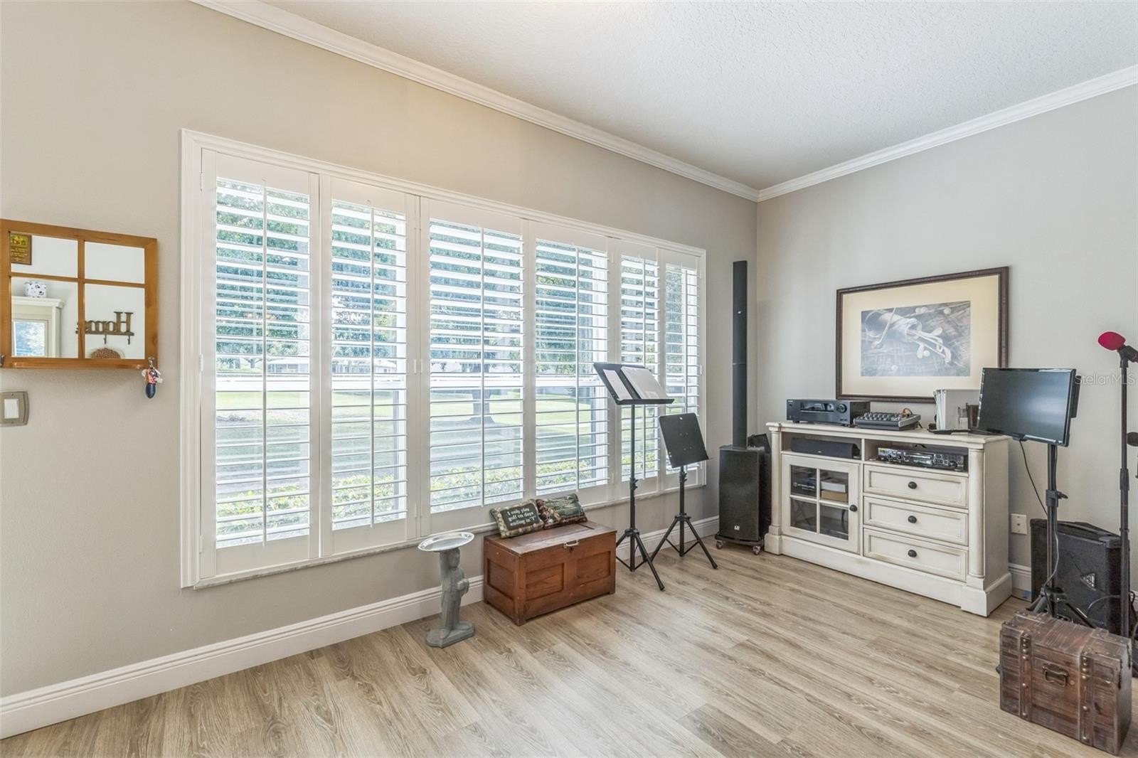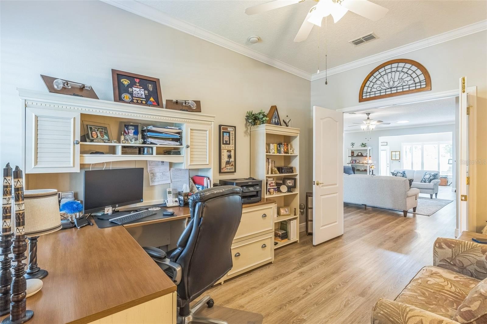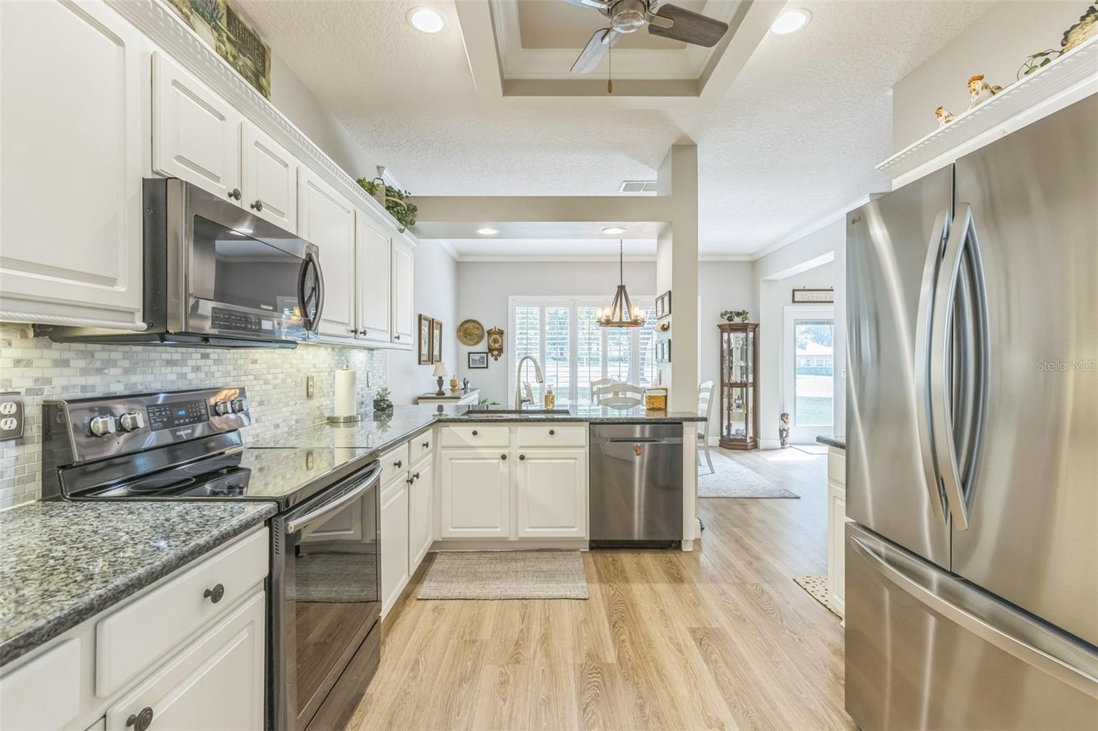 This St. James floor plan backing on the 10th tee of the Kings golf course is located on a beautiful cul-de-sac; certainly, a MUST See. This home welcomes guests as they enter through the attractive beveled glass front door into an open tiled foyer. The OPEN and SPLIT floor plan allows lots of space to gather and entertain with plantation shutters throughout. The Living room, dining, bedrooms have crown molding, 5 1/4” baseboards. The Family room has a view of the golf course. The Kitchen includes appliances, tile backsplash, granite countertops, under cabinet lighting, corner double pantry with motion detector lighting, tray ceiling and opens to a spacious dining nook. LVP flooring is throughout with tiled bathrooms and with multi shower heads, garden tub, dual sinks. Bedroom 2 is off the front of the home with a spacious closet and LVP flooring. Bedroom 3, (Office or Den) has a double door entry, closet and LVP flooring. The garage has updated poly flooring, lots of overhead storage, attic with a dropdown ladder. The roof was replaced in 2014, A/C 2022, water heater 2023, windows updated with new screens and ballasts in 2024. The HOA includes exterior painting every 6 years, reclaimed irrigation, exterior lawn service, basic cable and internet, attended main gate, use of all the amenities such as tennis courts, pickleball, basketball, shuffle board, hot tub, spa, pools, dance room, card room, computer room, library, arts and crafts room, fitness center, ballroom and much more.