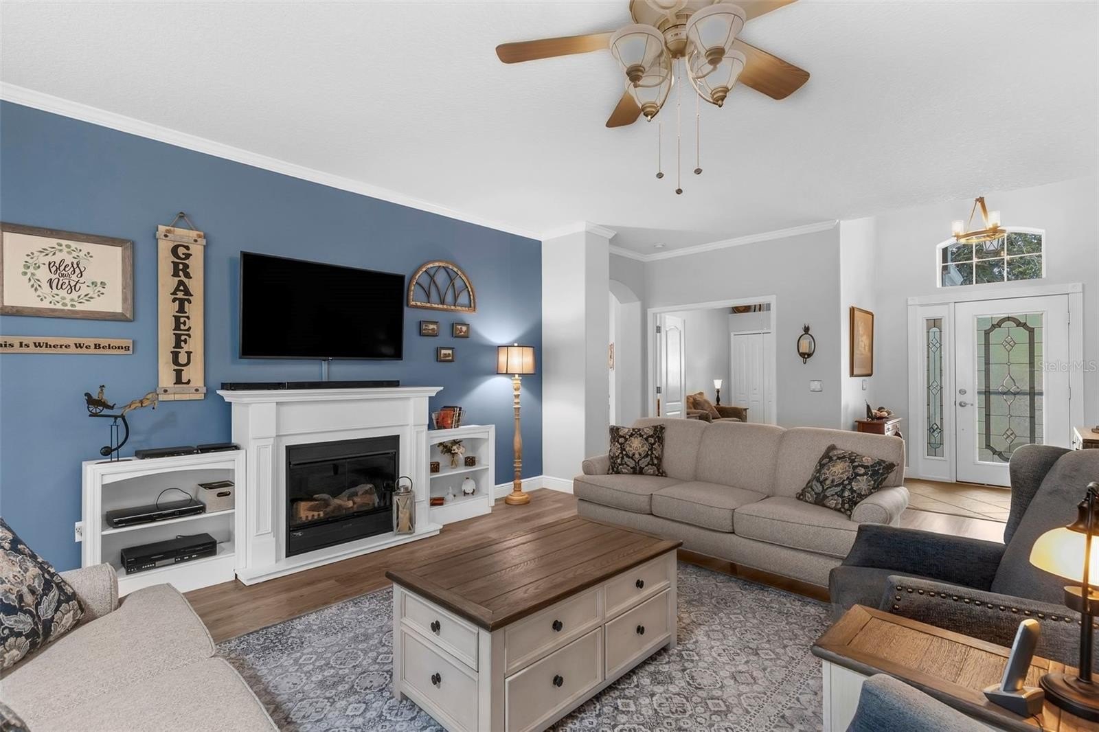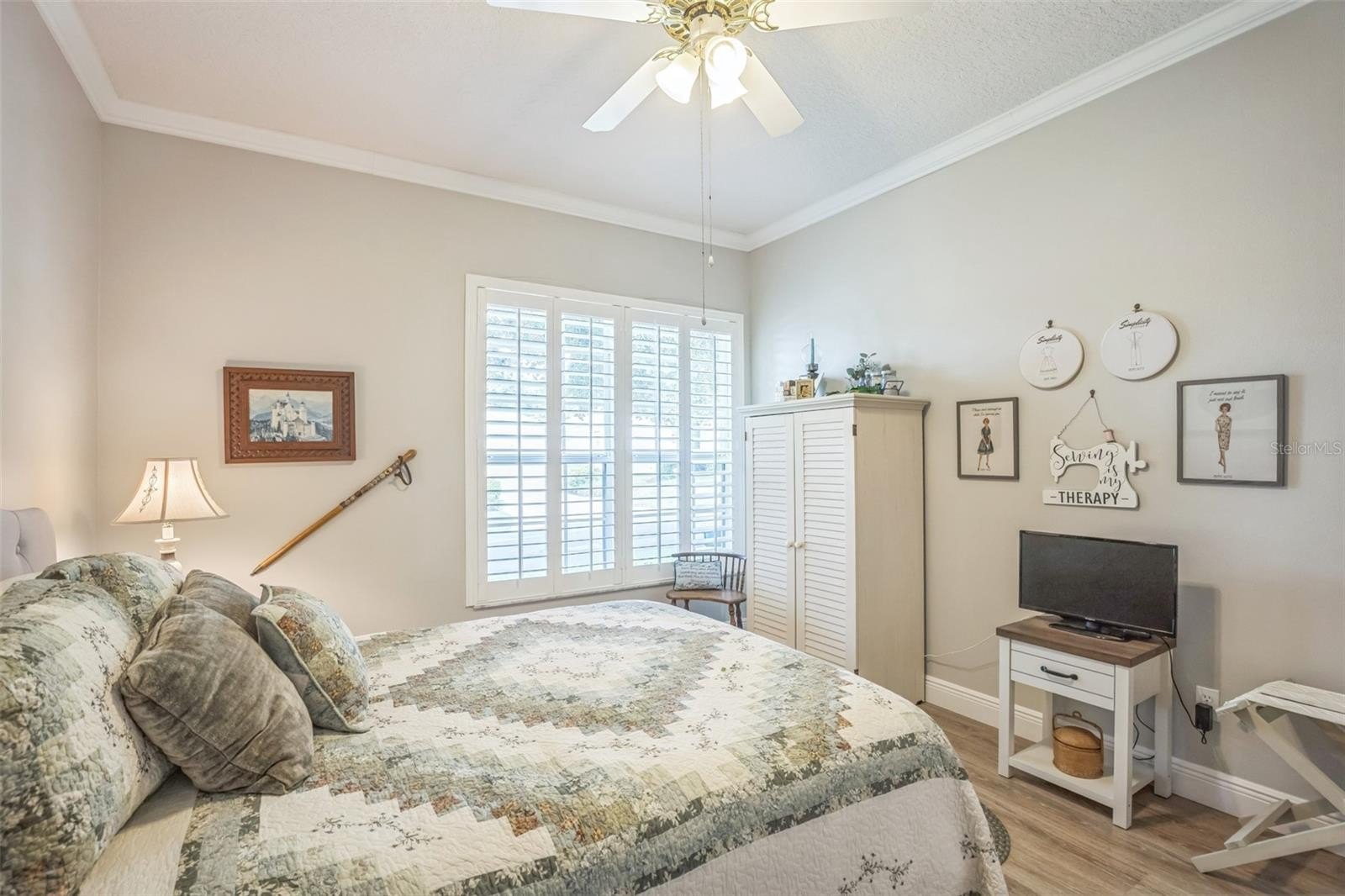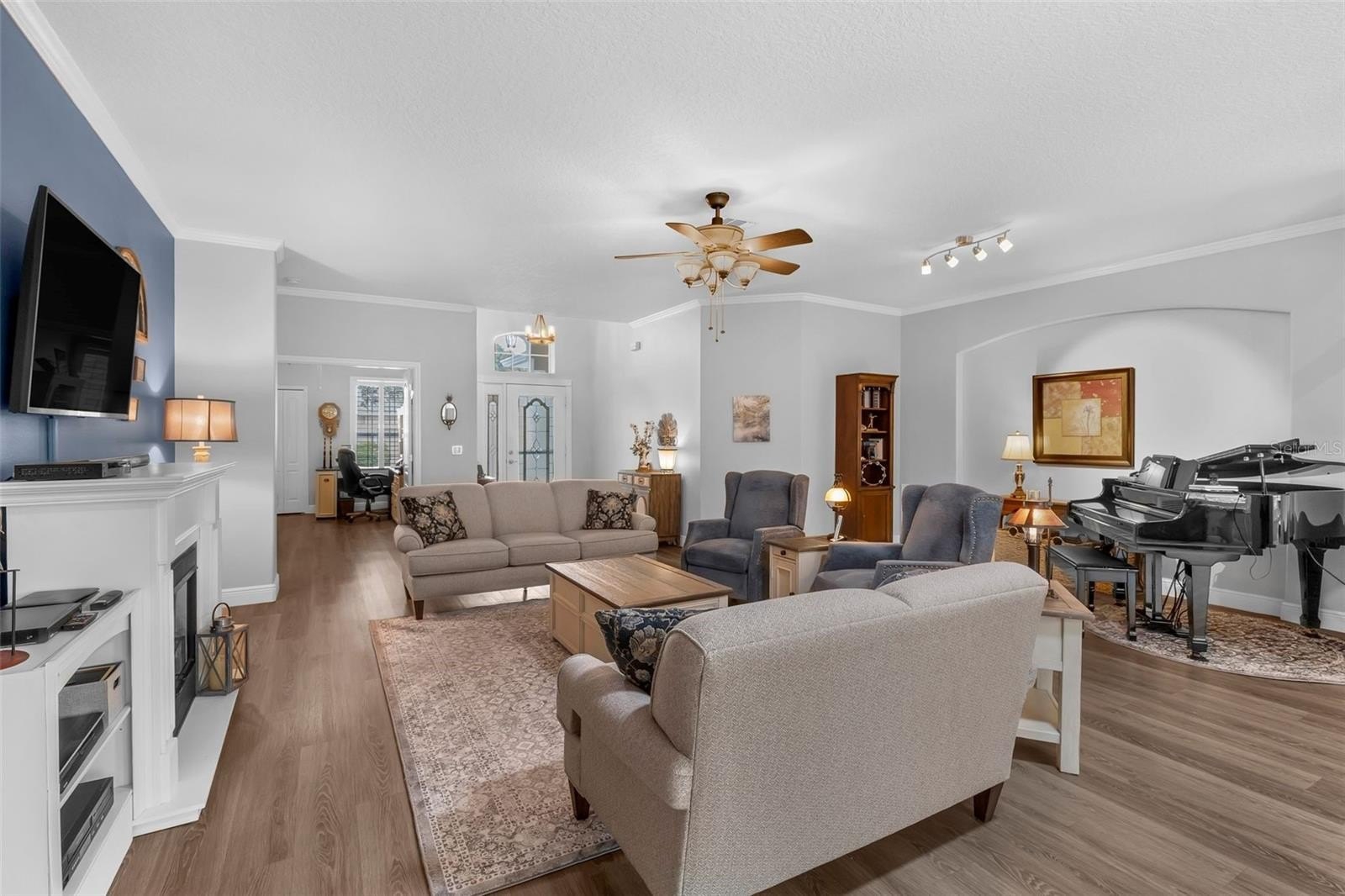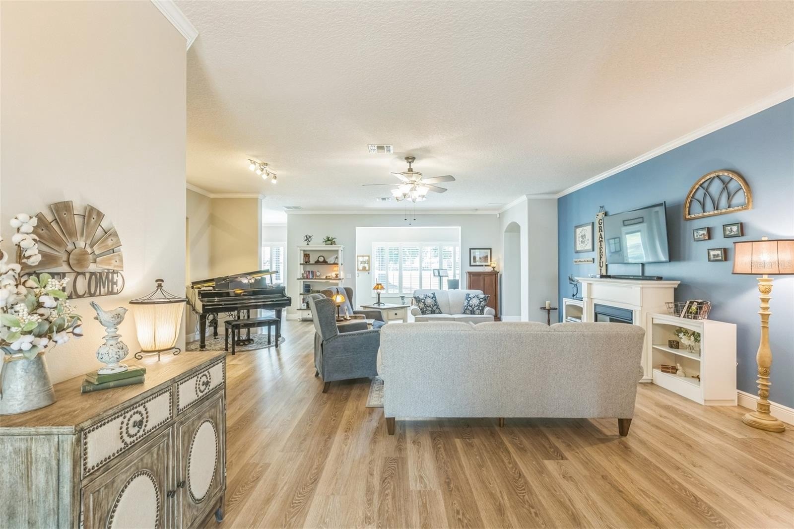 This St. James floor plan backing on the 10th tee of the Kings golf course is located on a beautiful cul-de-sac; certainly, a MUST See. This home welcomes guests as they enter through the attractive beveled glass front door into an open tiled foyer. The OPEN and SPLIT floor plan allows lots of space to gather and entertain with plantation shutters throughout. The Living room, dining, bedrooms have crown molding, 5 1/4” baseboards. The Family room has a view of the golf course. The Kitchen includes appliances, tile backsplash, granite countertops, under cabinet lighting, corner double pantry with motion detector lighting, tray ceiling and opens to a spacious dining nook. LVP flooring is throughout with tiled bathrooms and with multi shower heads, garden tub, dual sinks. Bedroom 2 is off the front of the home with a spacious closet and LVP flooring. Bedroom 3, (Office or Den) has a double door entry, closet and LVP flooring. The garage has updated poly flooring, lots of overhead storage, attic with a dropdown ladder. The roof was replaced in 2014, A/C 2022, water heater 2023, windows updated with new screens and ballasts in 2024. The HOA includes exterior painting every 6 years, reclaimed irrigation, exterior lawn service, basic cable and internet, attended main gate, use of all the amenities such as tennis courts, pickleball, basketball, shuffle board, hot tub, spa, pools, dance room, card room, computer room, library, arts and crafts room, fitness center, ballroom and much more.