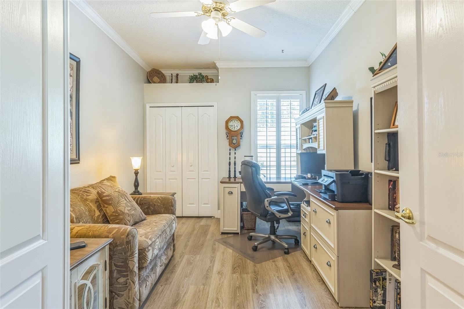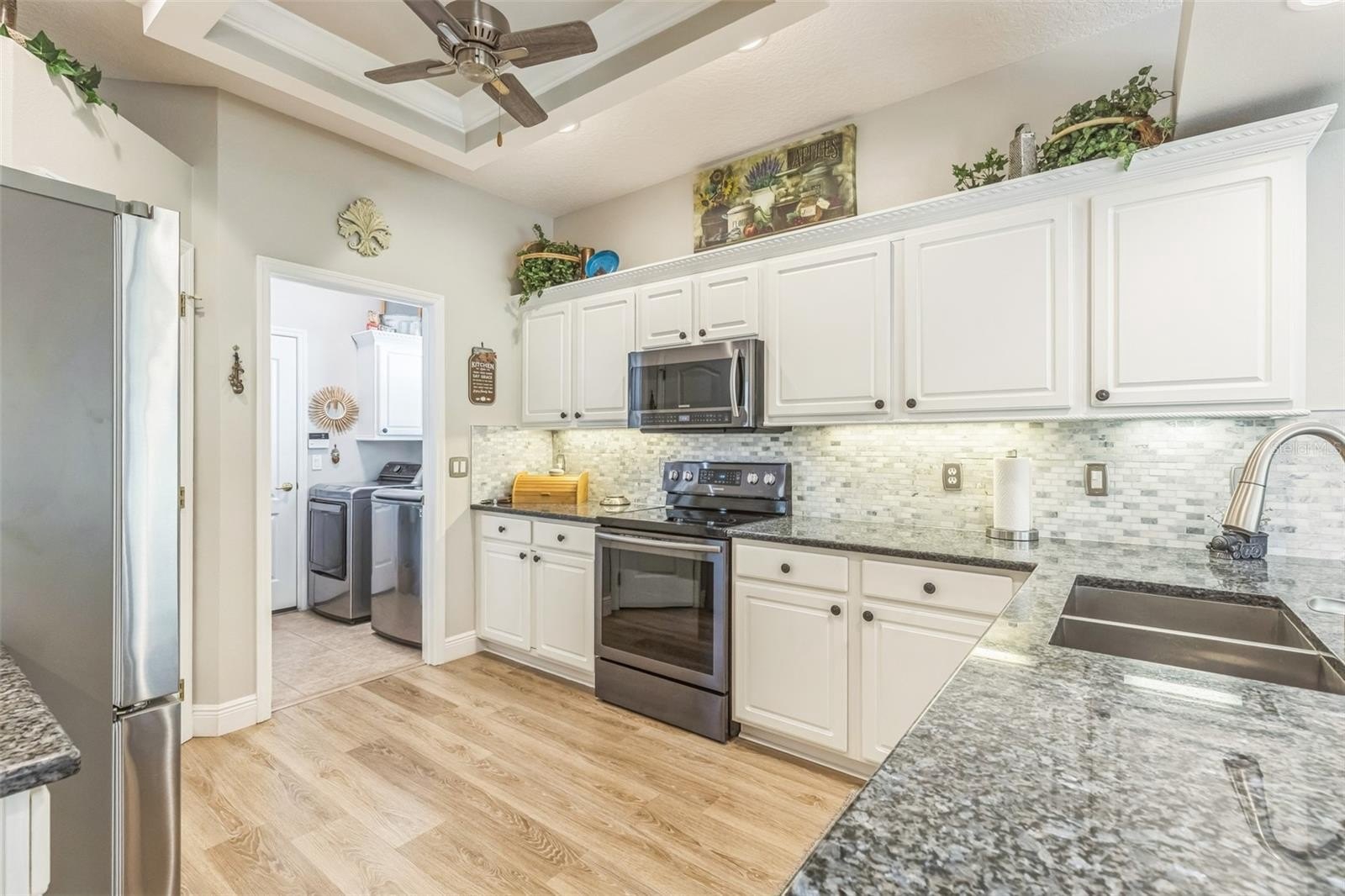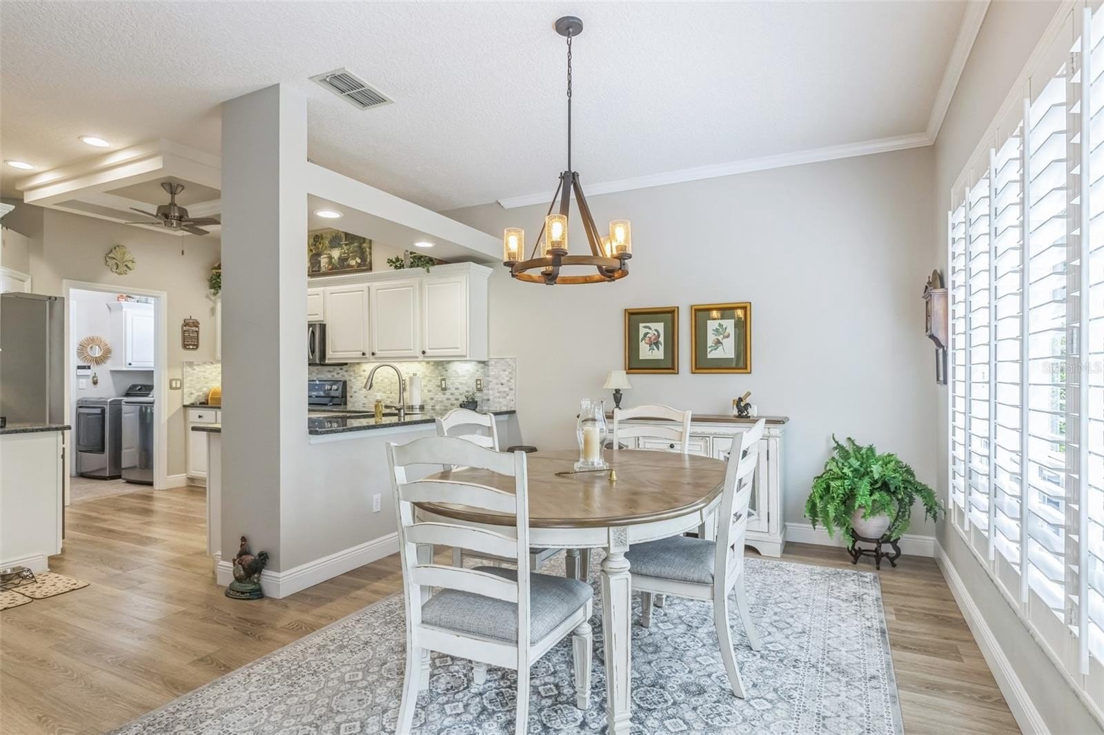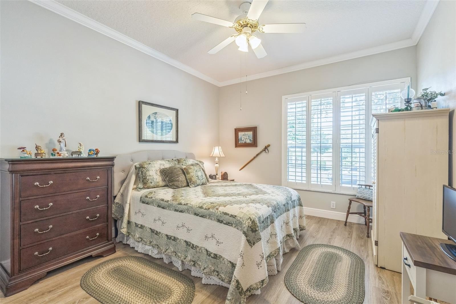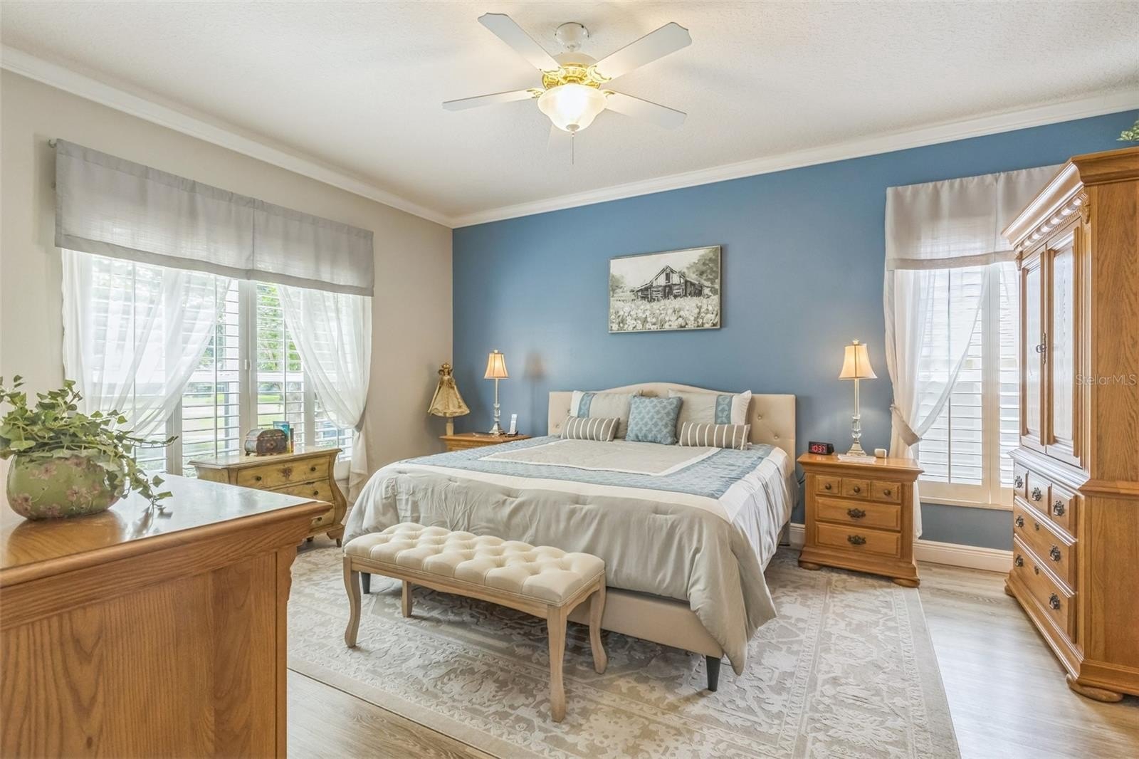 This St. James floor plan backing on the 10th tee of the Kings golf course is located on a beautiful cul-de-sac; certainly, a MUST See. This home welcomes guests as they enter through the attractive beveled glass front door into an open tiled foyer. The OPEN and SPLIT floor plan allows lots of space to gather and entertain with plantation shutters throughout. The Living room, dining, bedrooms have crown molding, 5 1/4” baseboards. The Family room has a view of the golf course. The Kitchen includes appliances, tile backsplash, granite countertops, under cabinet lighting, corner double pantry with motion detector lighting, tray ceiling and opens to a spacious dining nook. LVP flooring is throughout with tiled bathrooms and with multi shower heads, garden tub, dual sinks. Bedroom 2 is off the front of the home with a spacious closet and LVP flooring. Bedroom 3, (Office or Den) has a double door entry, closet and LVP flooring. The garage has updated poly flooring, lots of overhead storage, attic with a dropdown ladder. The roof was replaced in 2014, A/C 2022, water heater 2023, windows updated with new screens and ballasts in 2024. The HOA includes exterior painting every 6 years, reclaimed irrigation, exterior lawn service, basic cable and internet, attended main gate, use of all the amenities such as tennis courts, pickleball, basketball, shuffle board, hot tub, spa, pools, dance room, card room, computer room, library, arts and crafts room, fitness center, ballroom and much more.