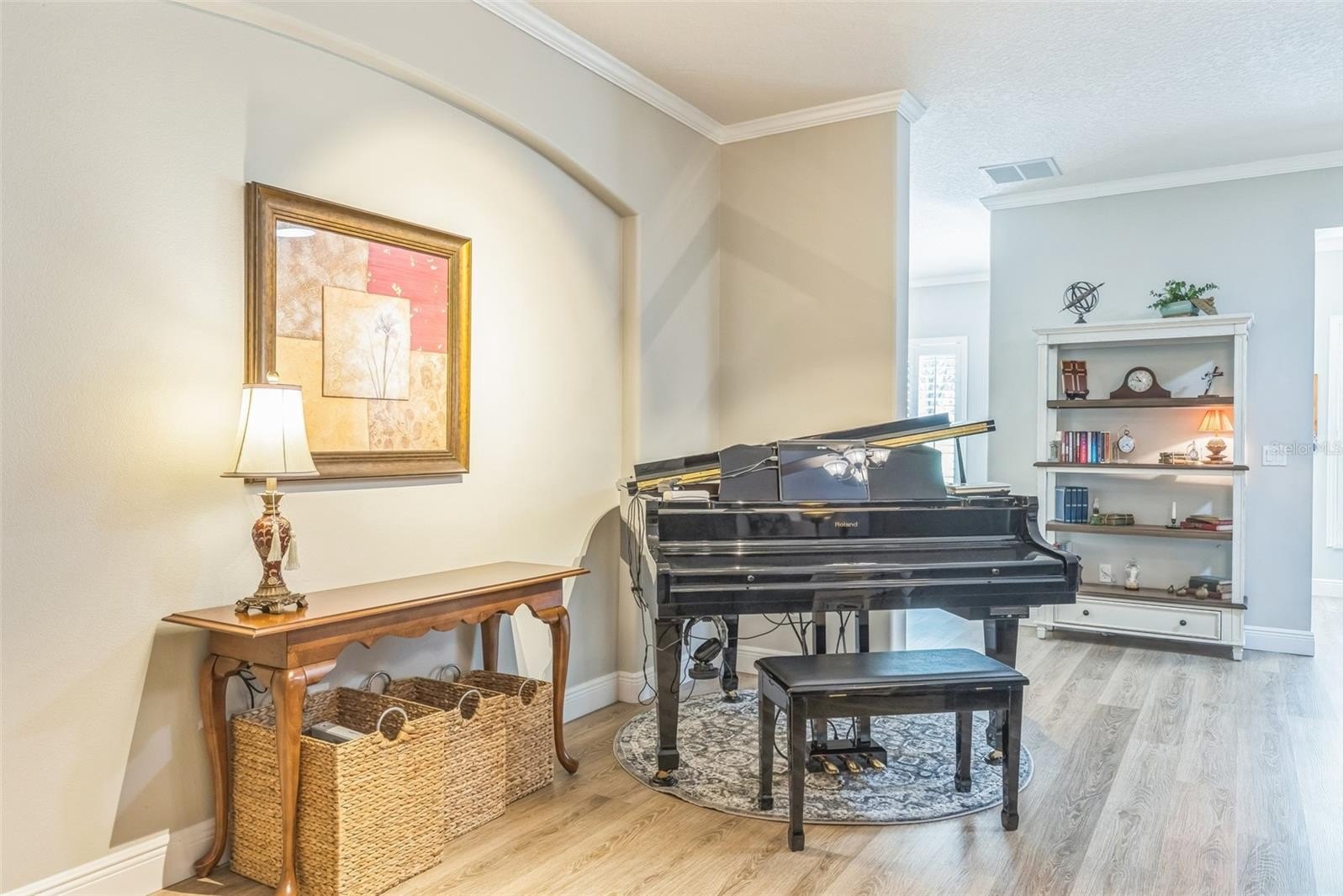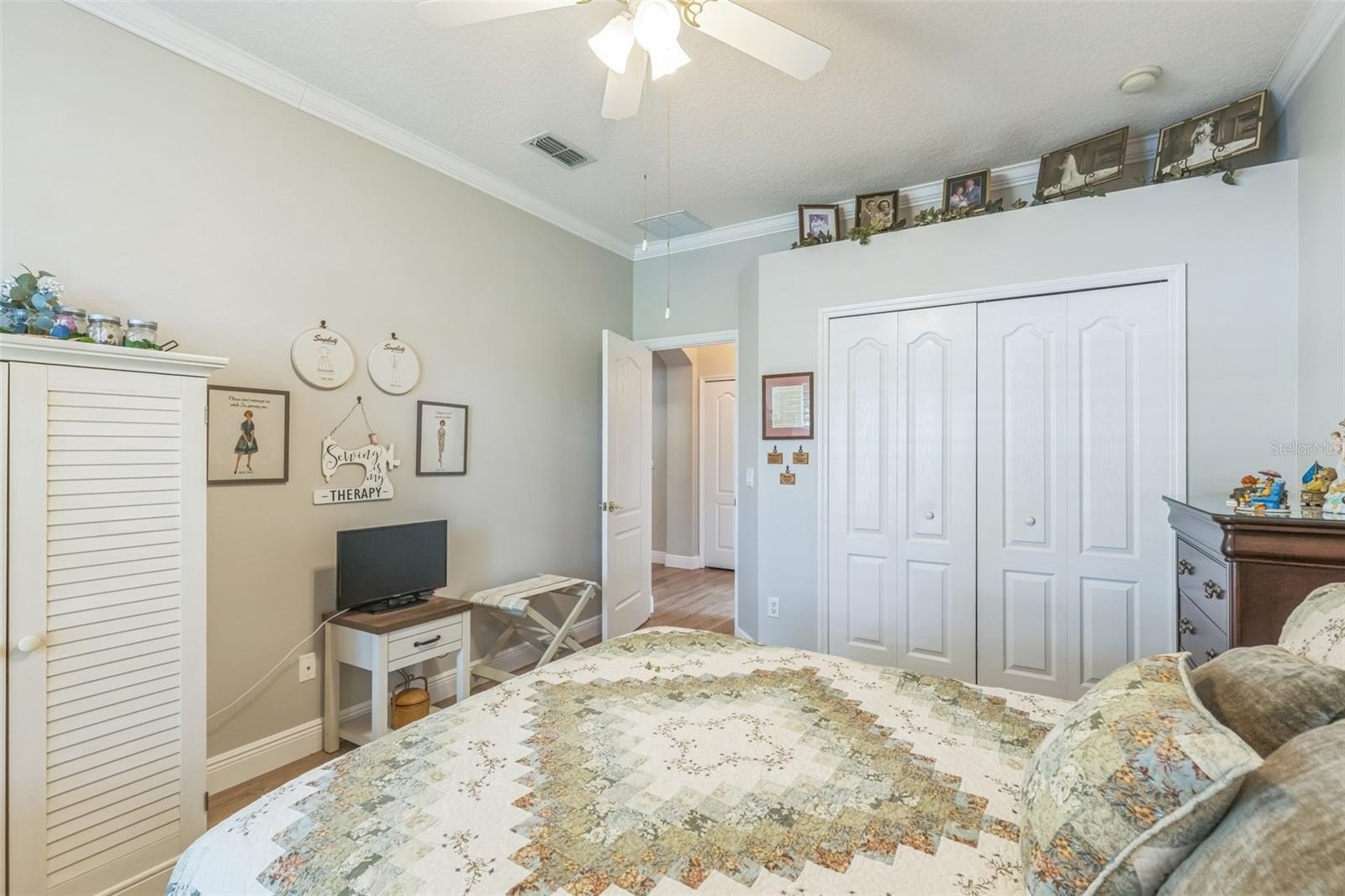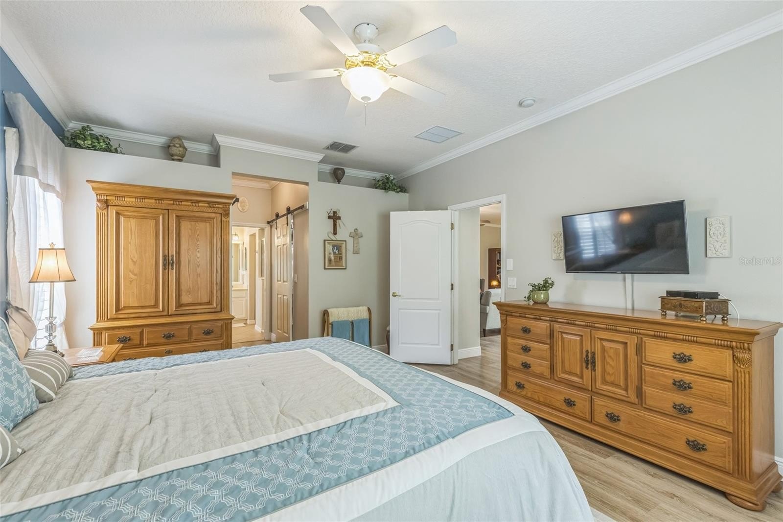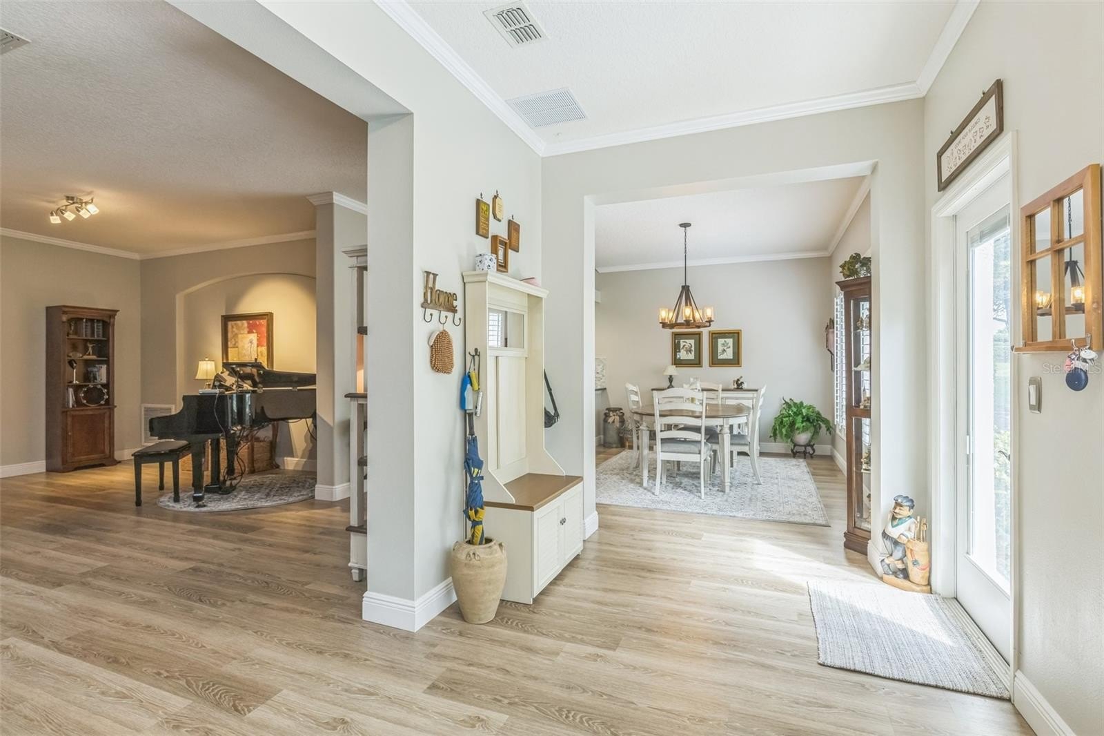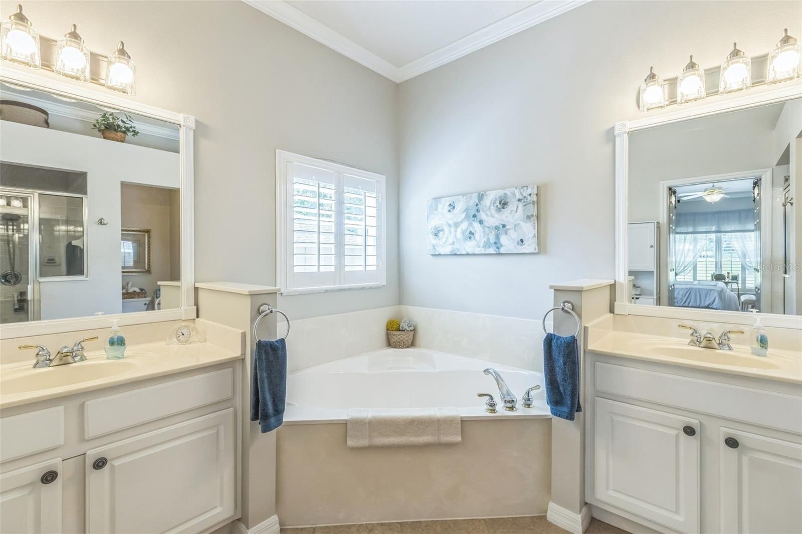 This St. James floor plan backing on the 10th tee of the Kings golf course is located on a beautiful cul-de-sac; certainly, a MUST See. This home welcomes guests as they enter through the attractive beveled glass front door into an open tiled foyer. The OPEN and SPLIT floor plan allows lots of space to gather and entertain with plantation shutters throughout. The Living room, dining, bedrooms have crown molding, 5 1/4” baseboards. The Family room has a view of the golf course. The Kitchen includes appliances, tile backsplash, granite countertops, under cabinet lighting, corner double pantry with motion detector lighting, tray ceiling and opens to a spacious dining nook. LVP flooring is throughout with tiled bathrooms and with multi shower heads, garden tub, dual sinks. Bedroom 2 is off the front of the home with a spacious closet and LVP flooring. Bedroom 3, (Office or Den) has a double door entry, closet and LVP flooring. The garage has updated poly flooring, lots of overhead storage, attic with a dropdown ladder. The roof was replaced in 2014, A/C 2022, water heater 2023, windows updated with new screens and ballasts in 2024. The HOA includes exterior painting every 6 years, reclaimed irrigation, exterior lawn service, basic cable and internet, attended main gate, use of all the amenities such as tennis courts, pickleball, basketball, shuffle board, hot tub, spa, pools, dance room, card room, computer room, library, arts and crafts room, fitness center, ballroom and much more.