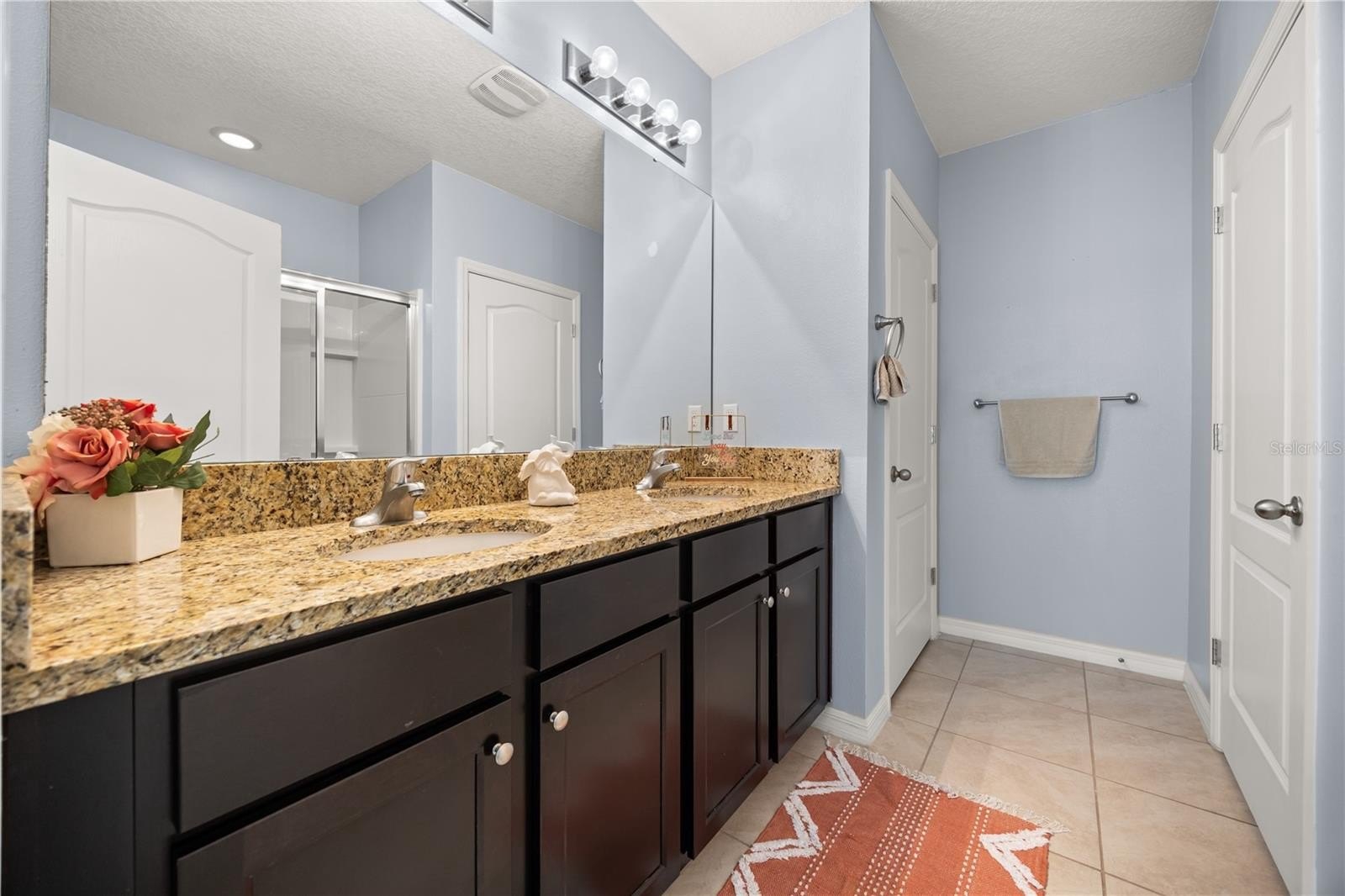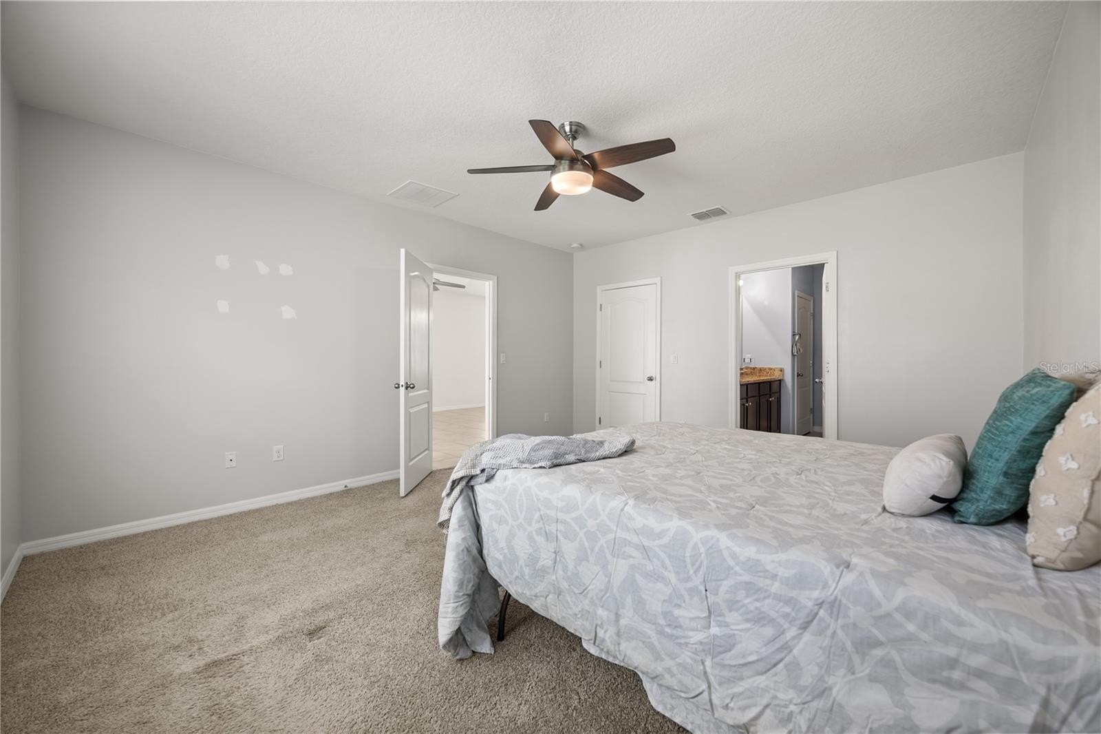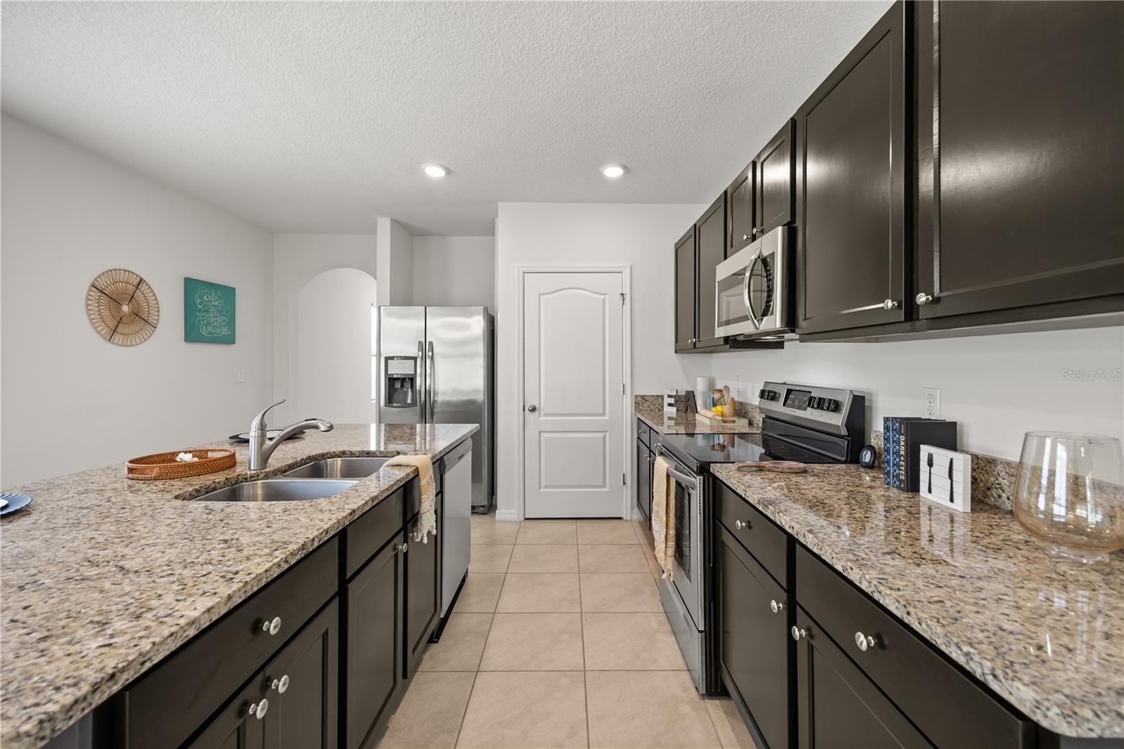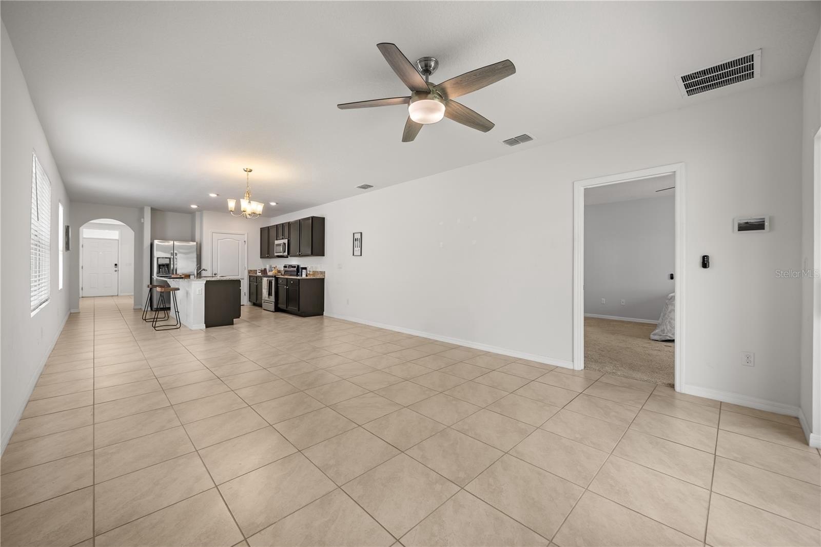 Step inside to find an open-concept layout with a spacious living and dining area, perfect for entertaining or family gatherings. The kitchen features stainless steel appliances, ample dark brown cabinetry, and a large island that’s ideal for meal prep and casual dining. The owner’s suite offers a walk-in closet and private bath with dual sinks and a glass-enclosed shower.