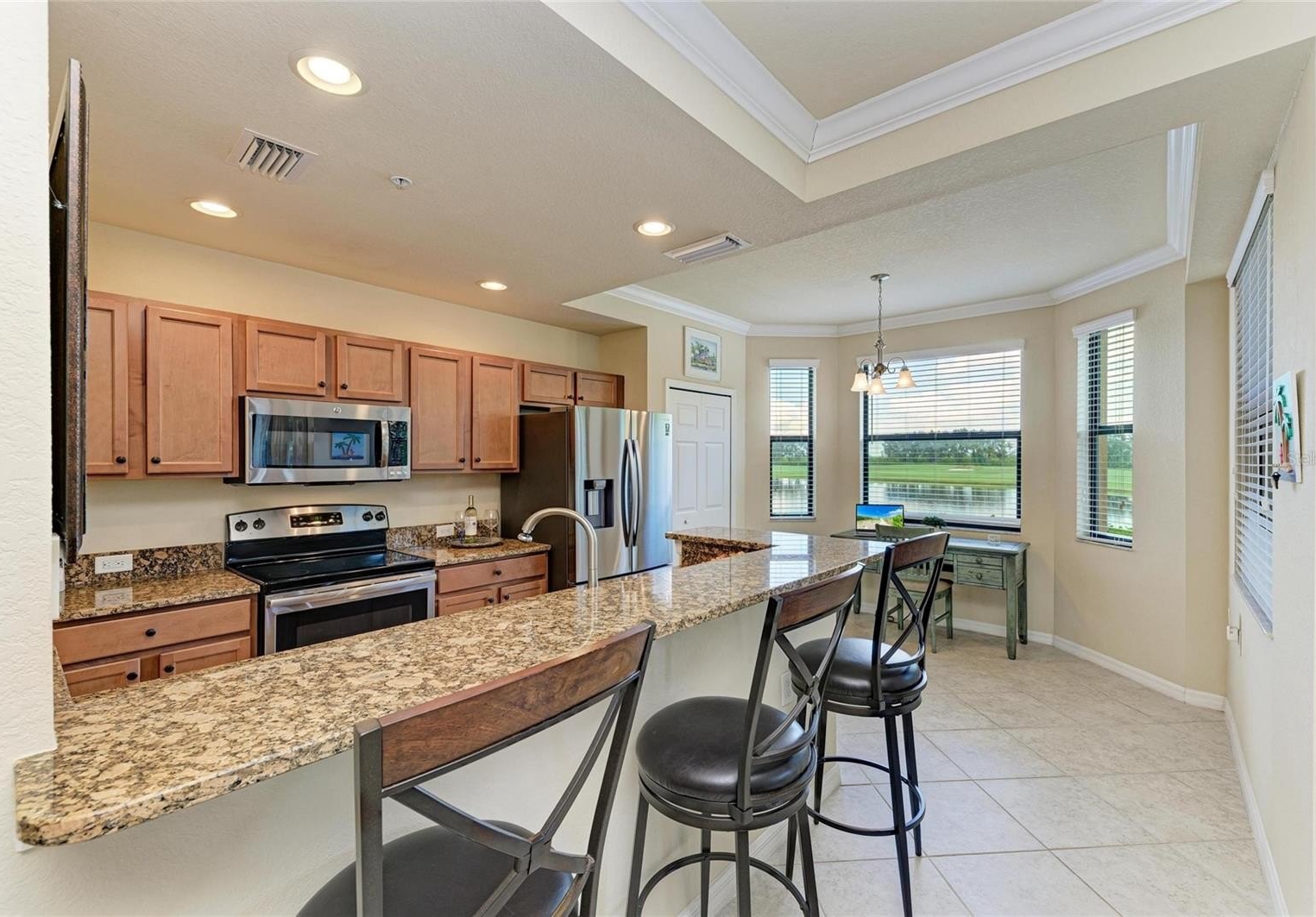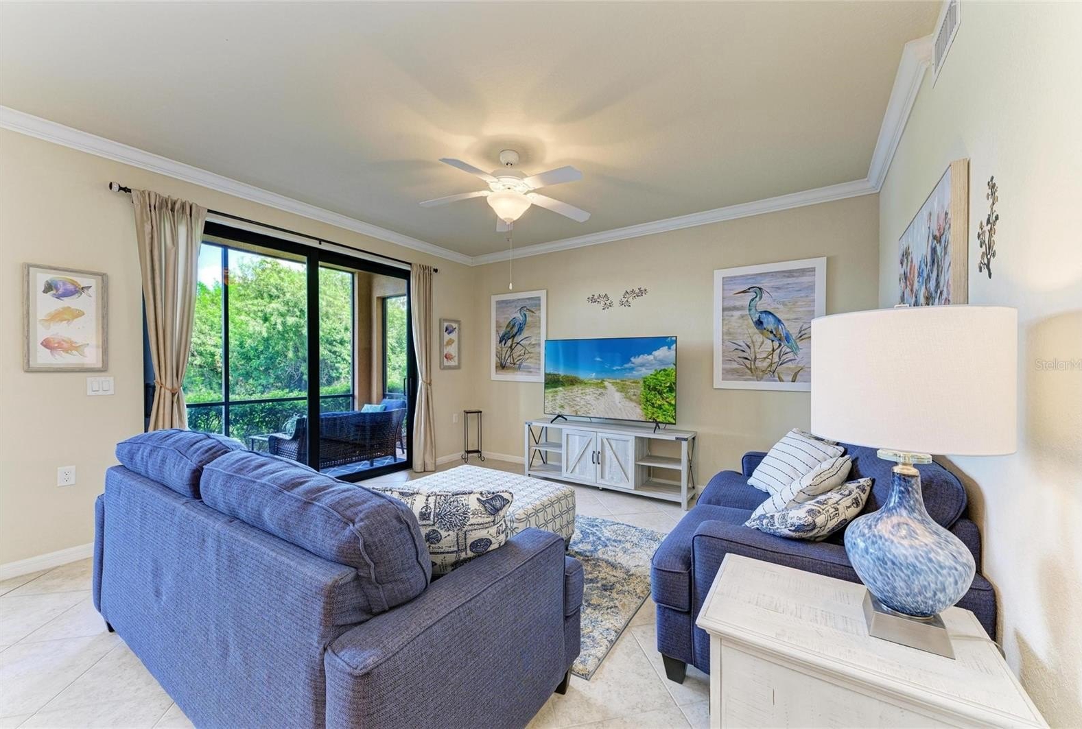Whether you're seeking a full-time residence or a seasonal retreat, this TURNKEY FURNISHED 2-bedroom, 2-bath FIRST FLOOR condo offers the perfect blend of comfort and convenience. Located in the gated resort community of River Strand Golf & Country Club, this GOLF DEEDED property could be the one to call your next home. Step inside to an OPEN FLOOR PLAN where the kitchen flows seamlessly into the great room, all while showcasing stunning golf, water and lush green views. The private screened lanai—an ideal spot to relax and unwind, is everything you would want it to be offering a peaceful retreat to enjoy Florida's year-round sunshine. The owner has recently replaced the A/C (2025) and the unit also features a newer fridge and no carpet throughout making this home both practical and beautiful.