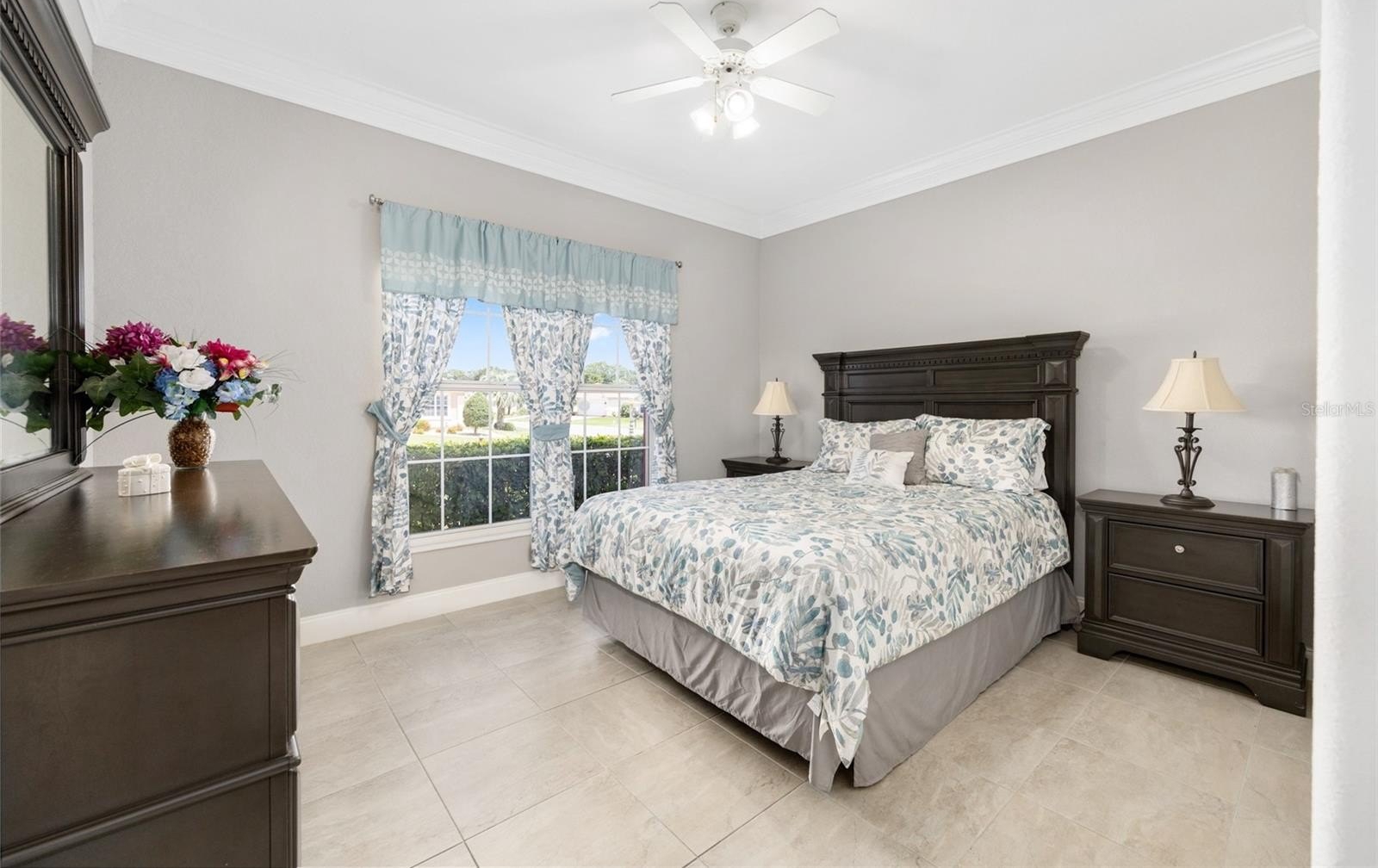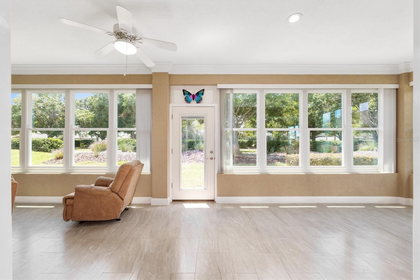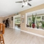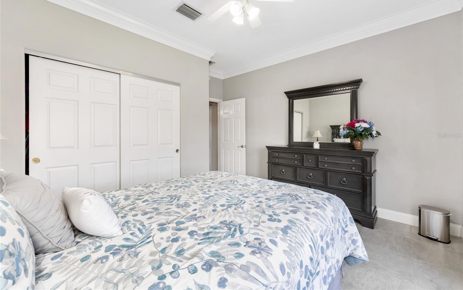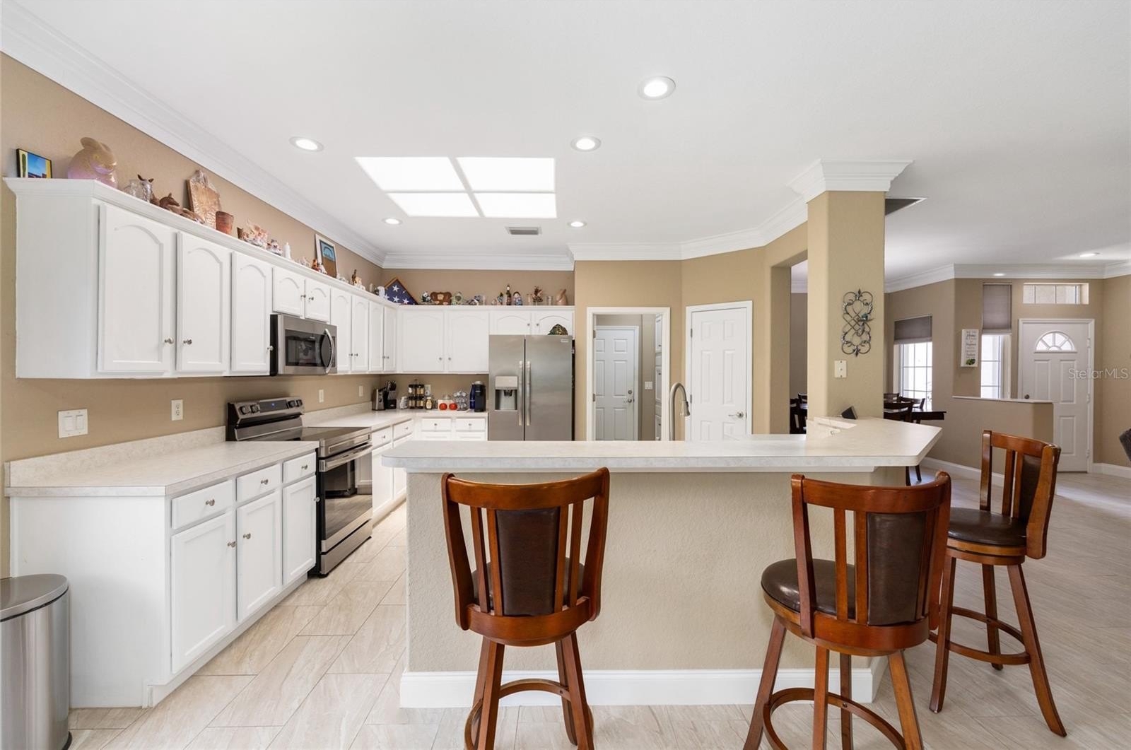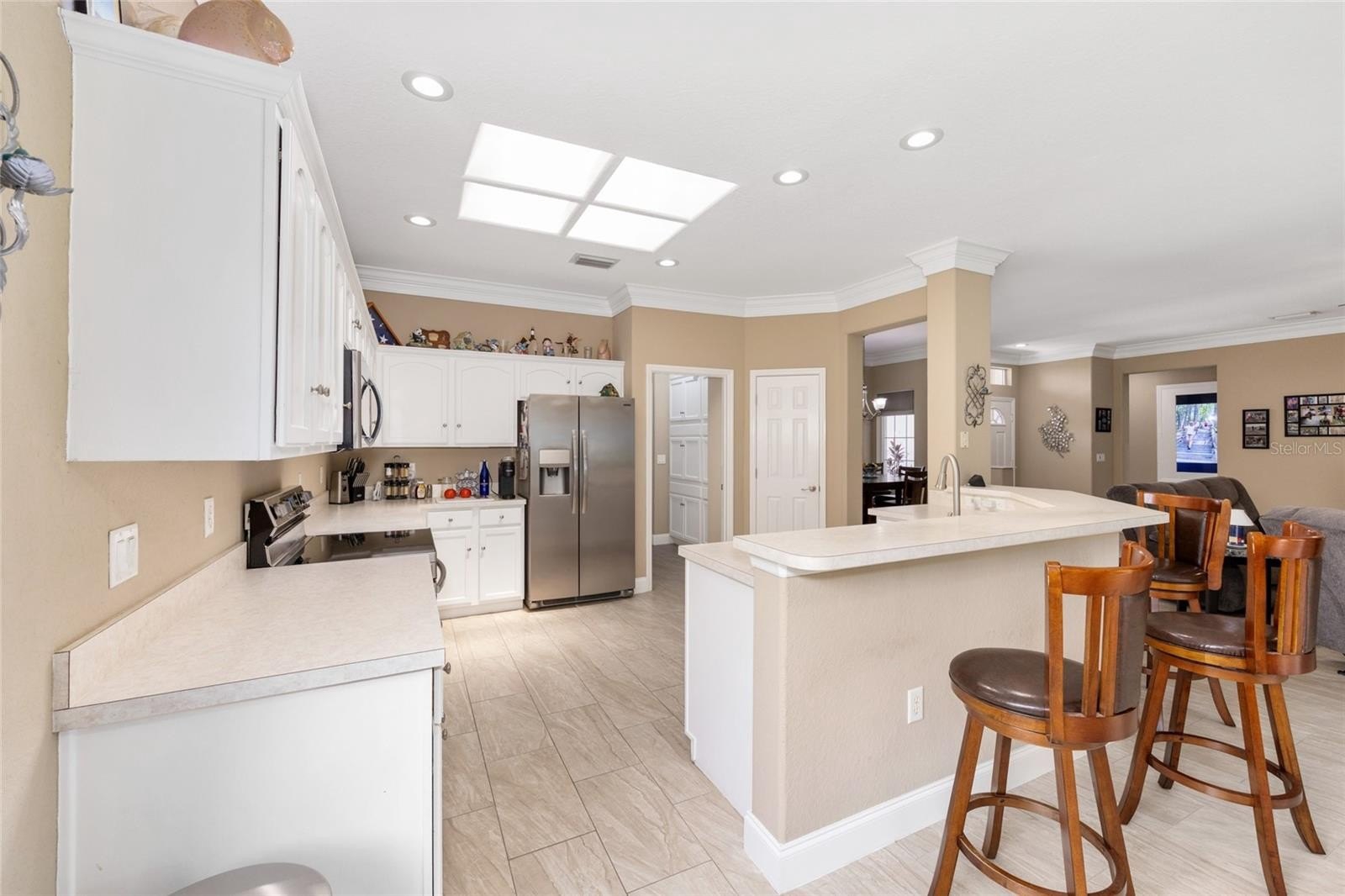 As you arrive, you’ll notice the spotless driveway and walkway leading to a welcoming front patio seating area. Step inside and you’ll be impressed with the attention to detail throughout — crown molding, 5-inch baseboards, and ceramic tile flooring flow seamlessly through the home. The tiled lanai, complete with crown molding, newer single-pane glass windows, and a finished ceiling, feels like an extension of the living space. A clever Murphy-style bed offers extra sleeping accommodations for guests without sacrificing room. All lighting has been upgraded to energy-efficient LED. The kitchen was updated in 2021 with crisp white cabinets, brushed nickel hardware, and newer stainless-steel appliances. Both bathrooms have been refreshed with granite-topped vanities and raised-height counters, while the primary bath boasts a newer shower.