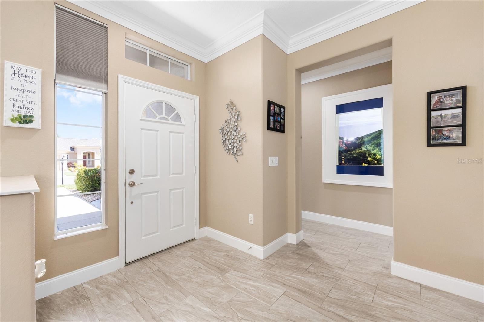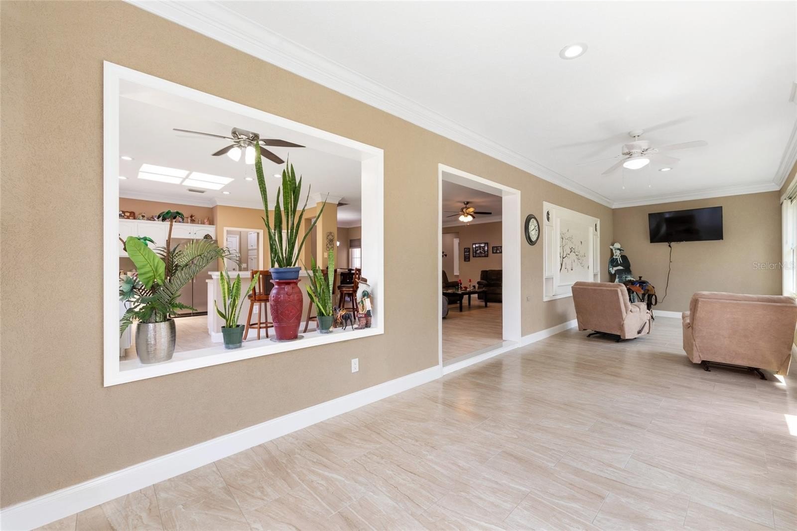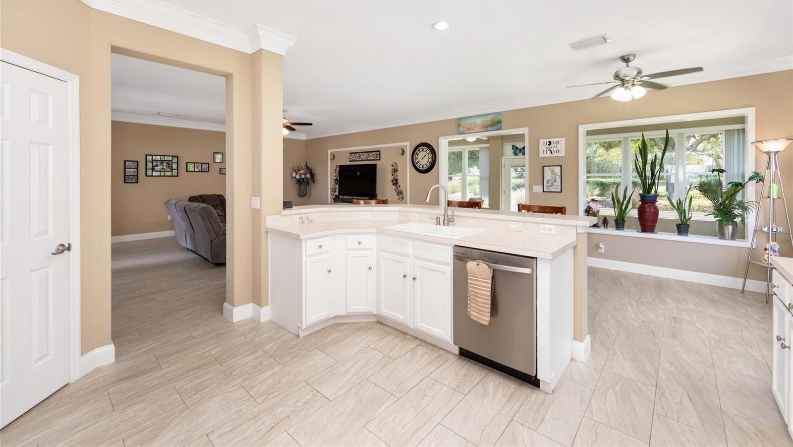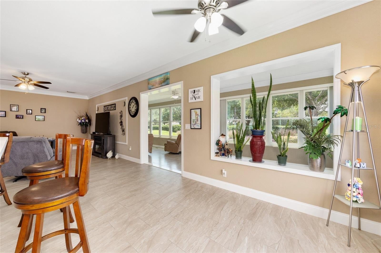 As you arrive, you’ll notice the spotless driveway and walkway leading to a welcoming front patio seating area. Step inside and you’ll be impressed with the attention to detail throughout — crown molding, 5-inch baseboards, and ceramic tile flooring flow seamlessly through the home. The tiled lanai, complete with crown molding, newer single-pane glass windows, and a finished ceiling, feels like an extension of the living space. A clever Murphy-style bed offers extra sleeping accommodations for guests without sacrificing room. All lighting has been upgraded to energy-efficient LED. The kitchen was updated in 2021 with crisp white cabinets, brushed nickel hardware, and newer stainless-steel appliances. Both bathrooms have been refreshed with granite-topped vanities and raised-height counters, while the primary bath boasts a newer shower.