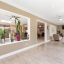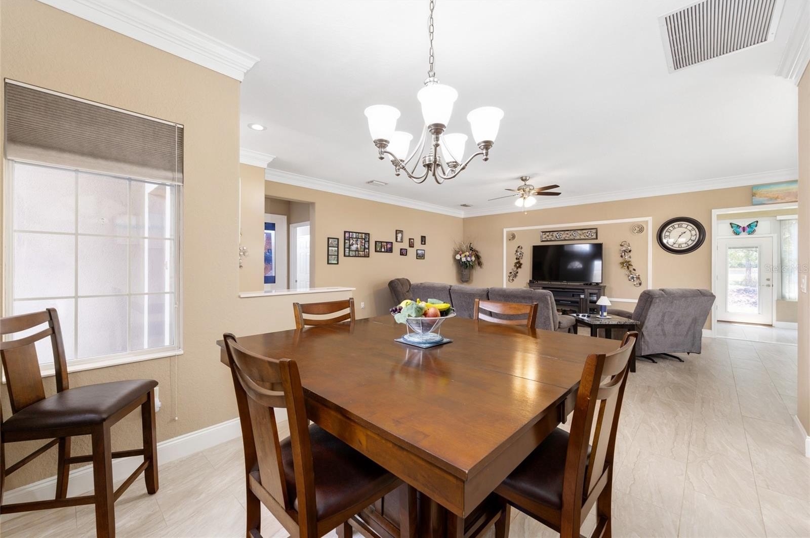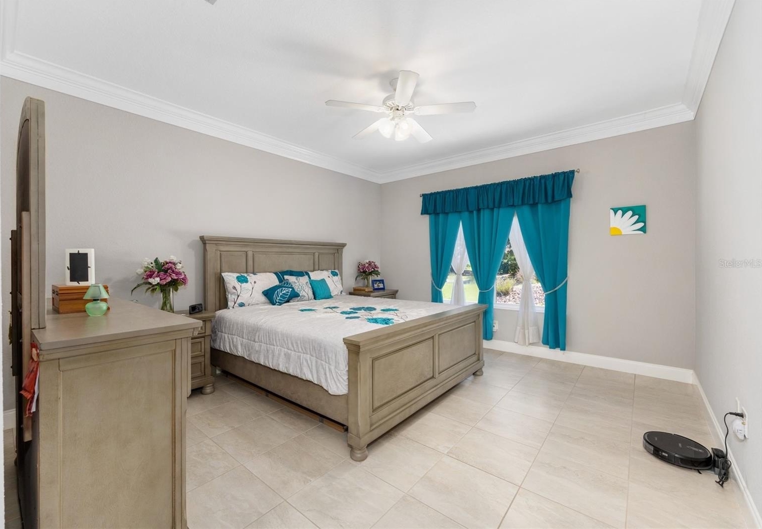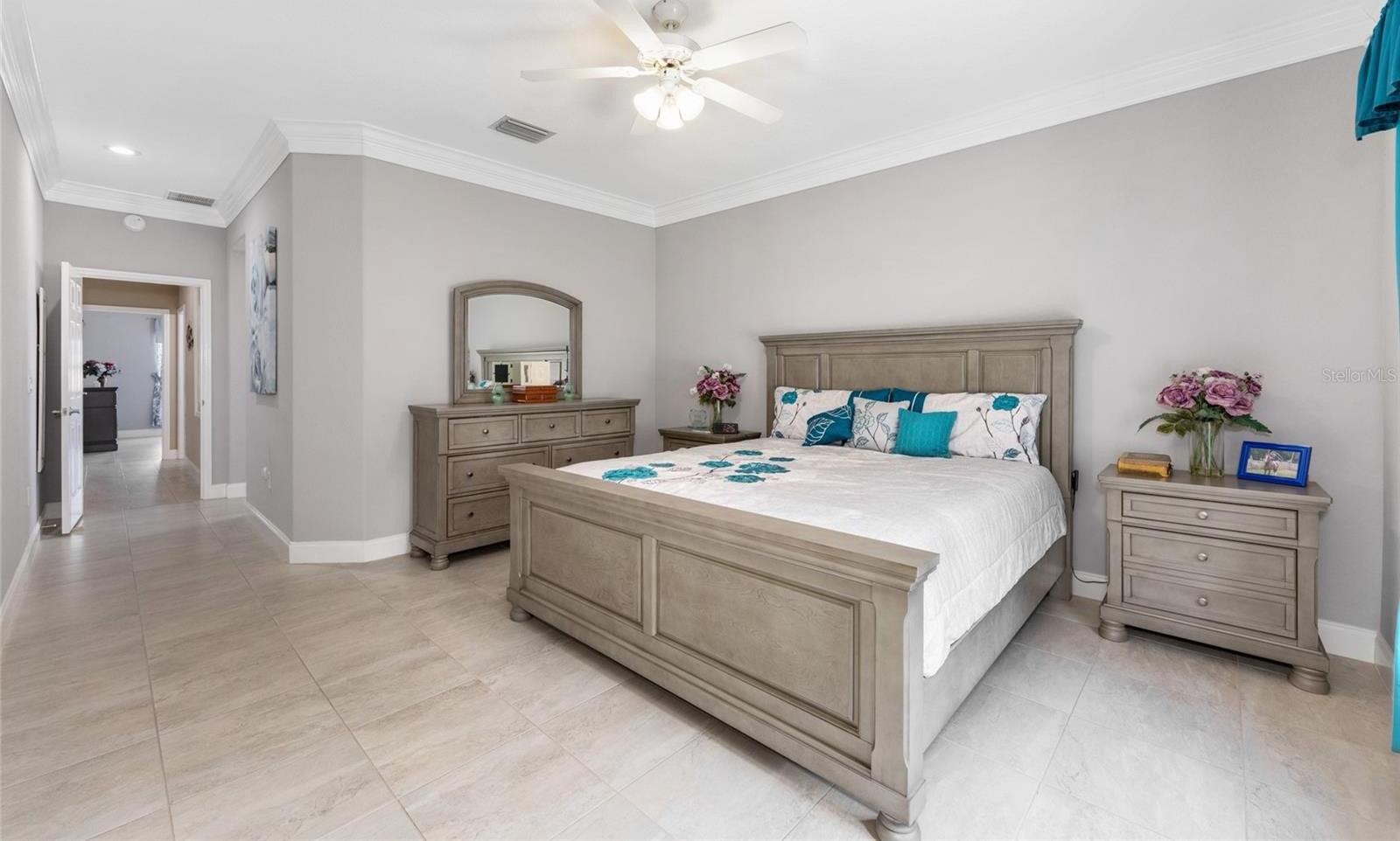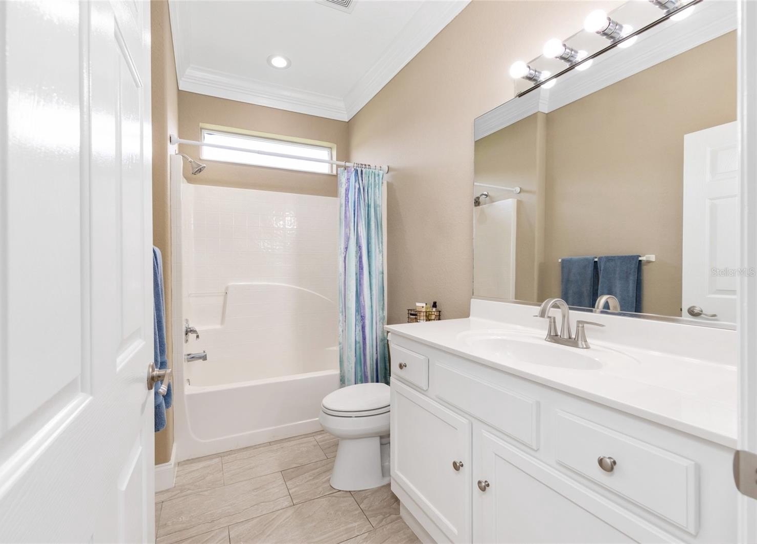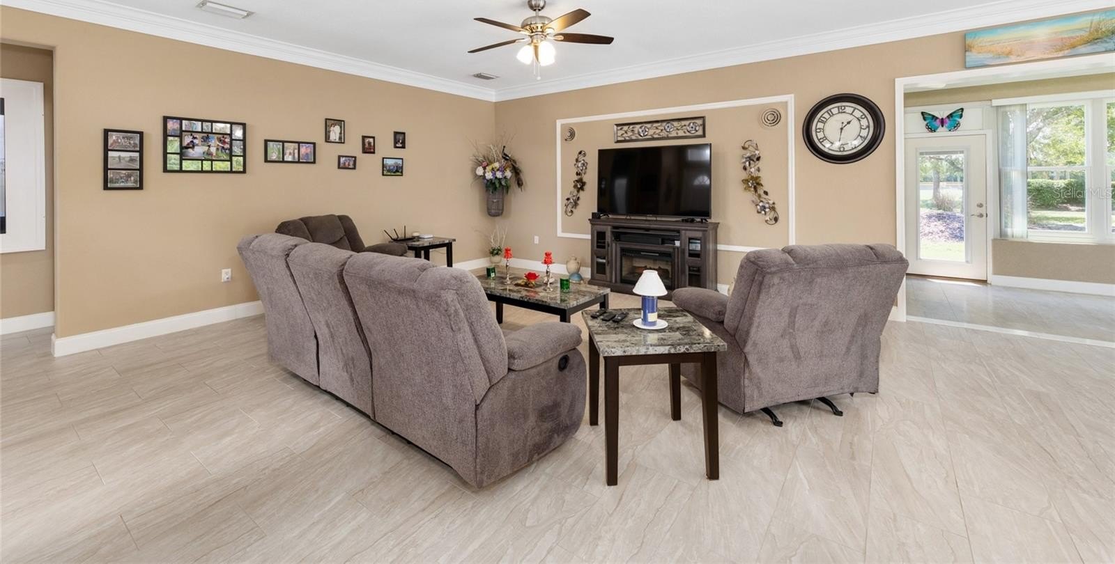 As you arrive, you’ll notice the spotless driveway and walkway leading to a welcoming front patio seating area. Step inside and you’ll be impressed with the attention to detail throughout — crown molding, 5-inch baseboards, and ceramic tile flooring flow seamlessly through the home. The tiled lanai, complete with crown molding, newer single-pane glass windows, and a finished ceiling, feels like an extension of the living space. A clever Murphy-style bed offers extra sleeping accommodations for guests without sacrificing room. All lighting has been upgraded to energy-efficient LED. The kitchen was updated in 2021 with crisp white cabinets, brushed nickel hardware, and newer stainless-steel appliances. Both bathrooms have been refreshed with granite-topped vanities and raised-height counters, while the primary bath boasts a newer shower.
