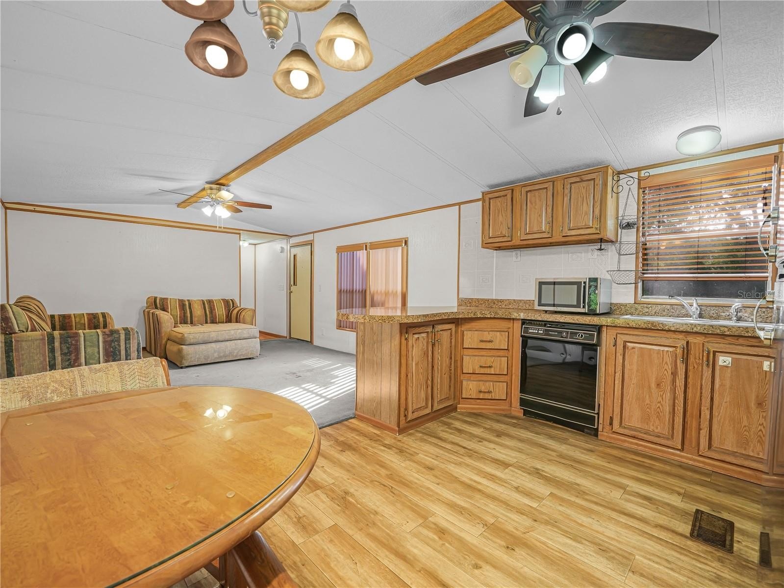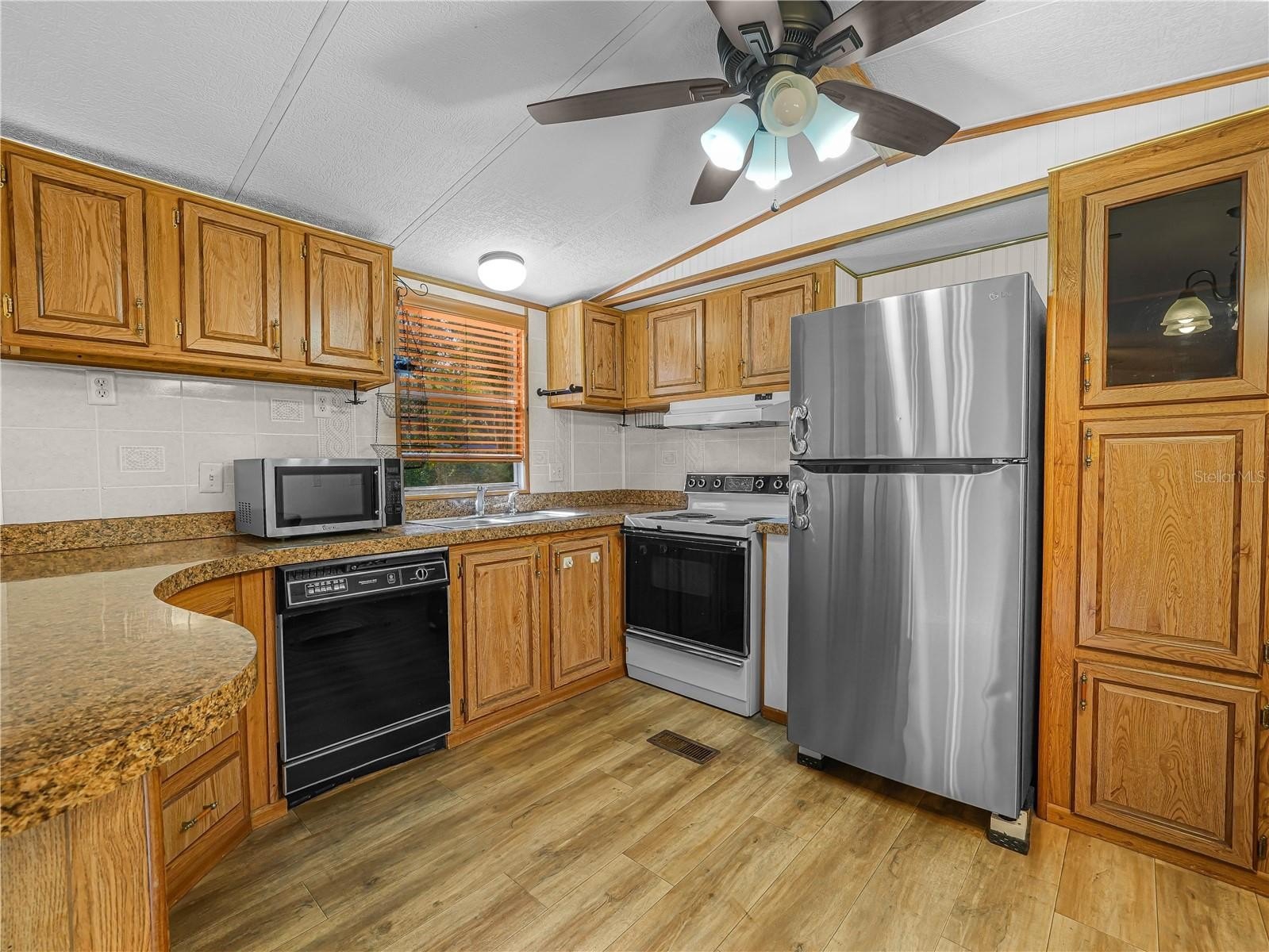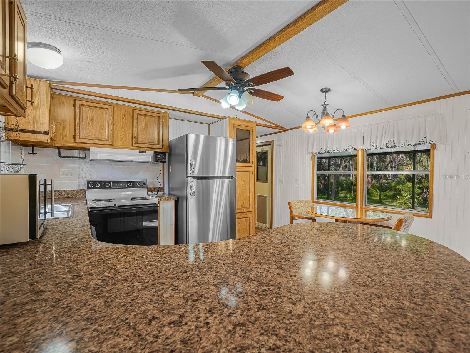 Inside, the open-concept family room flows seamlessly into the dining area and kitchen, which comes fully equipped with all appliances. The laundry room includes a washer and dryer, making everyday living convenient and efficient.