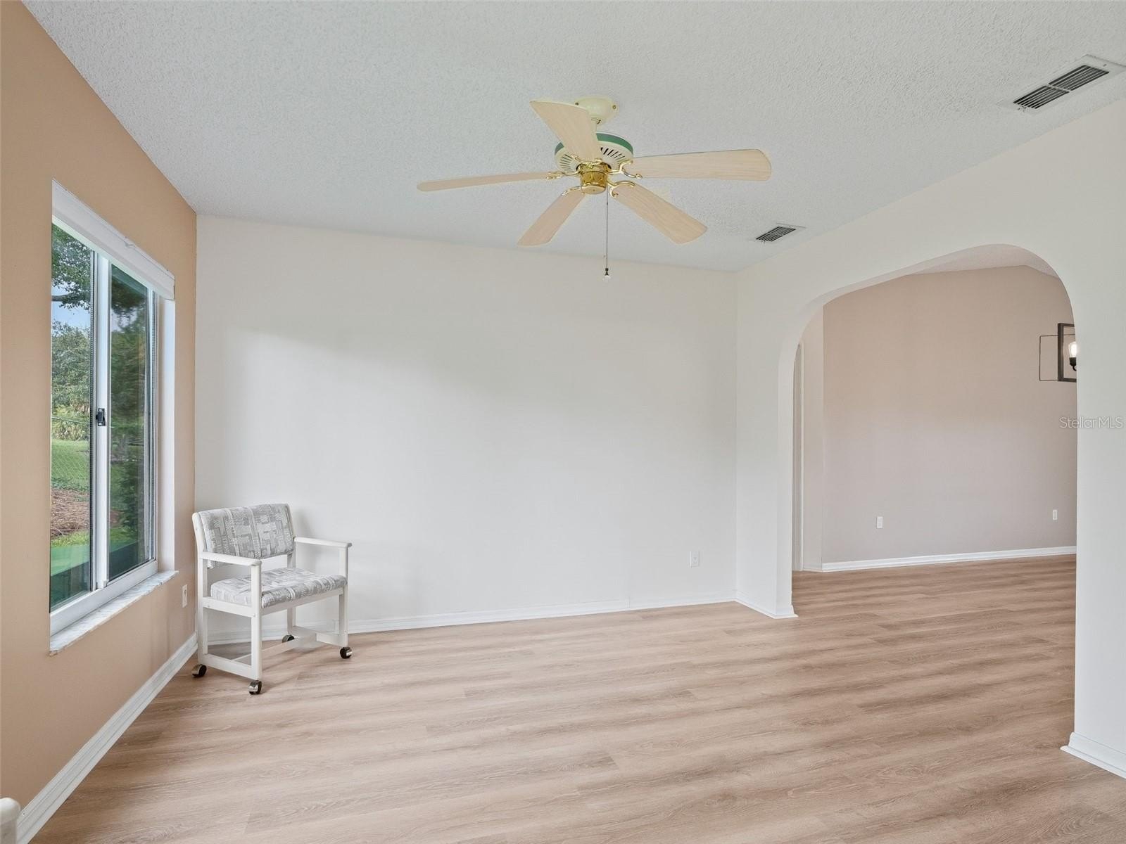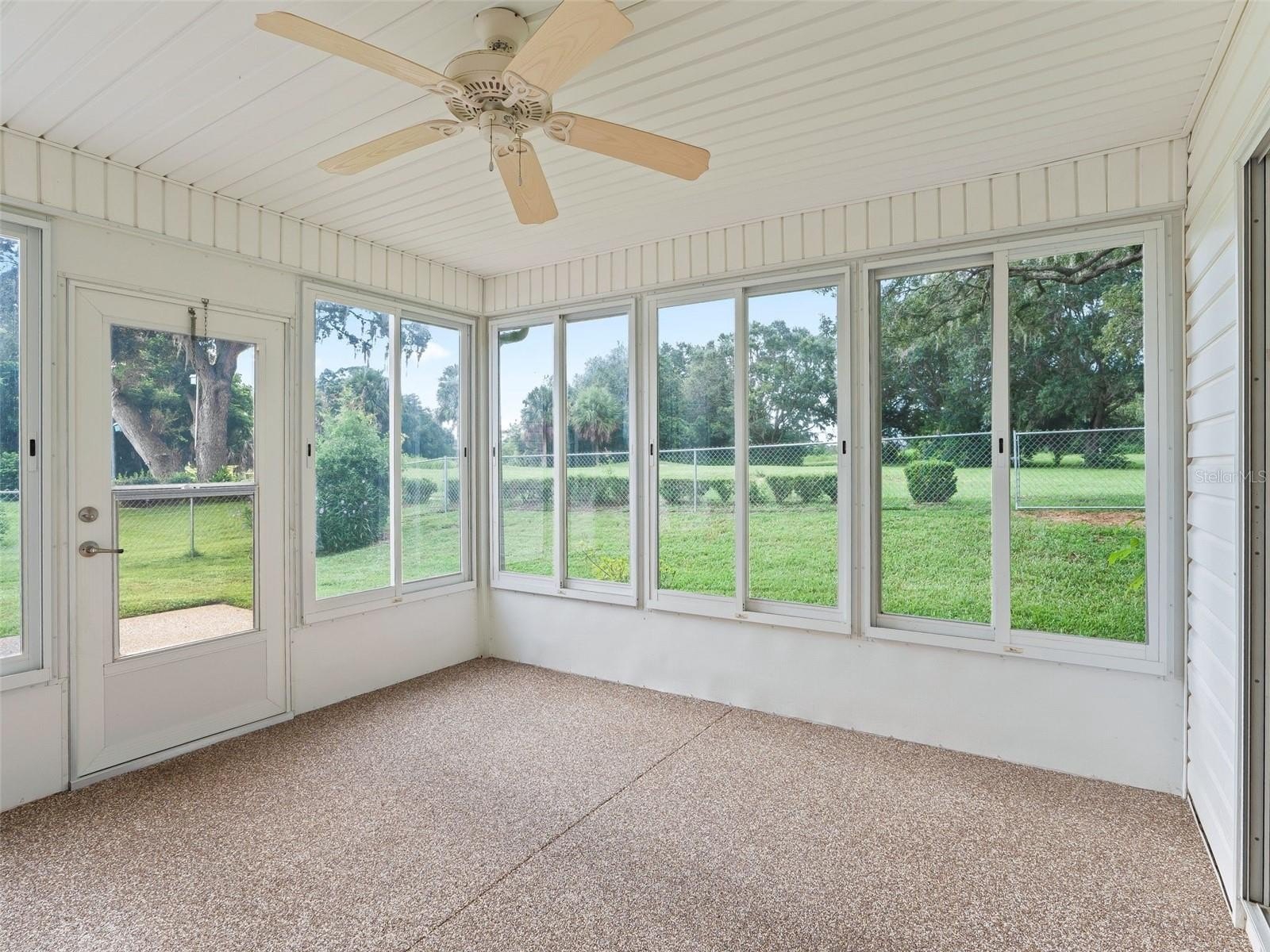 Need extra living space? The light-filled den is surrounded by windows overlooking mature oaks and lush landscaping — an ideal spot to relax, read, or work from home. Just beyond, the private enclosed florida room with glass - provides the perfect place to unwind with a morning brew or a glass of your favorite drink after a round of golf.
