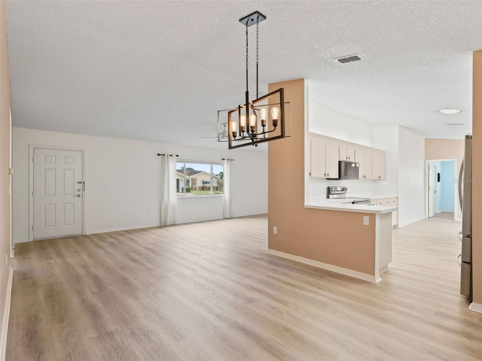Step inside to discover soaring ceilings, abundant natural light, and over 1,730 square feet of open, airy living space. The spacious living room seamlessly flows into a formal dining area, perfect for entertaining. The bright eat-in kitchen features a solar tube, ample cabinetry, generous counter space, updated stainless steel appliances, and a peninsula with bar seating — plus a cozy breakfast nook to enjoy your morning coffee.