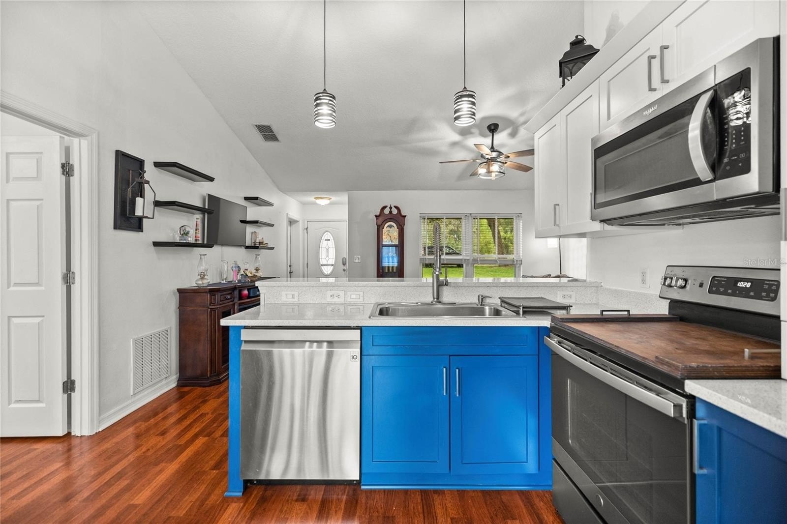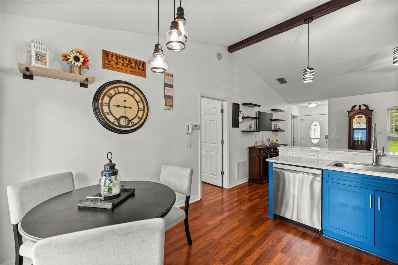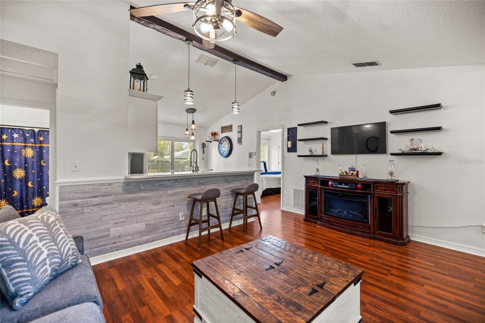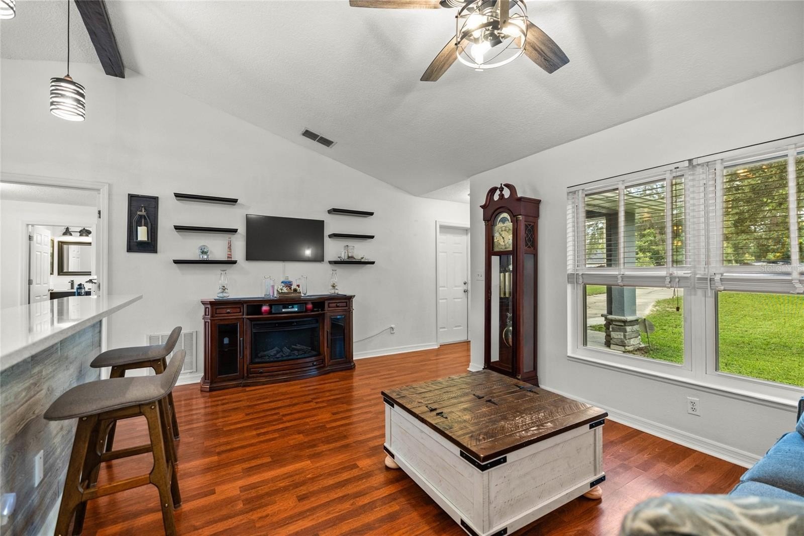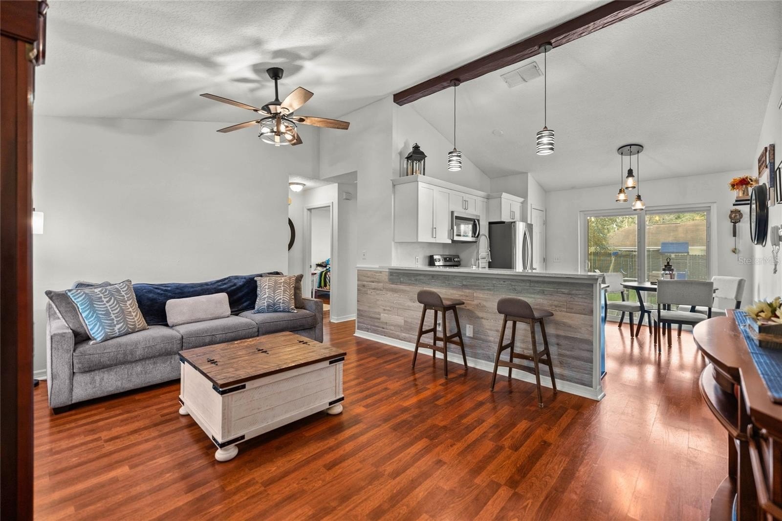 Beautifully Maintained & Move-In Ready! This 3-Bedroom, 2-Bath home offers a bright, open floor plan with vaulted ceilings and easy-care laminate flooring throughout. The spacious living and dining areas flow seamlessly, creating an ideal setting for everyday living and entertaining, while updated lighting enhances the warm, light-filled atmosphere.