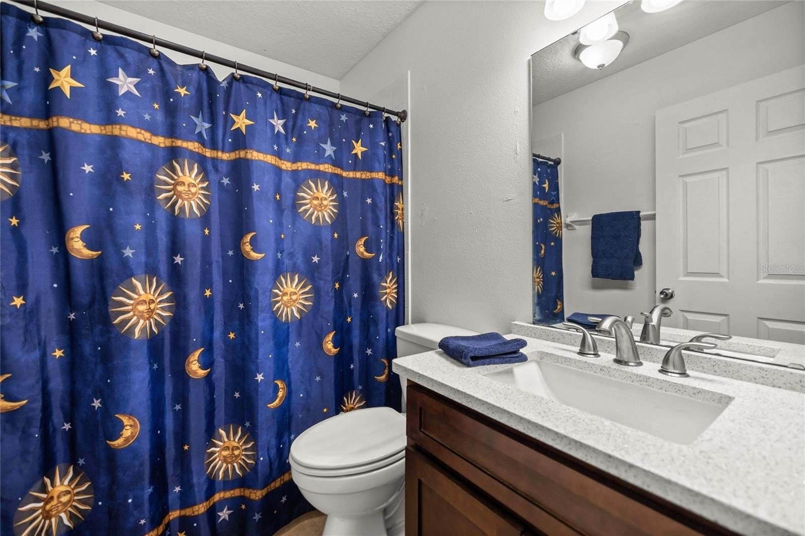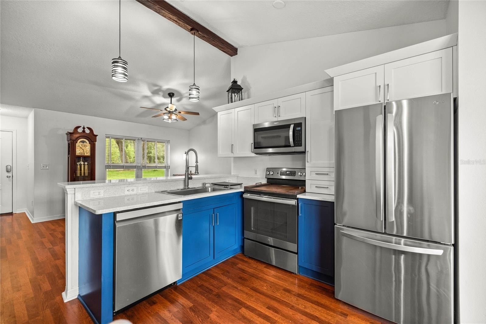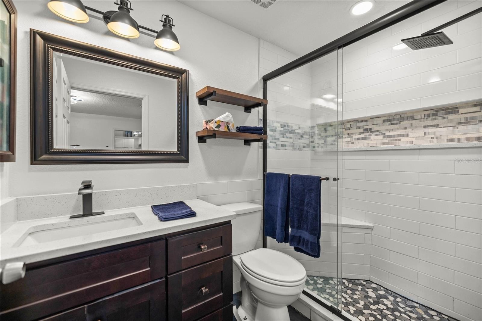 The kitchen shines with quartz countertops, shaker-style cabinetry, and stainless steel appliances—modern finishes that carry throughout the home for a clean, cohesive look. The primary suite features a completely renovated master bath, providing a true spa-like retreat.