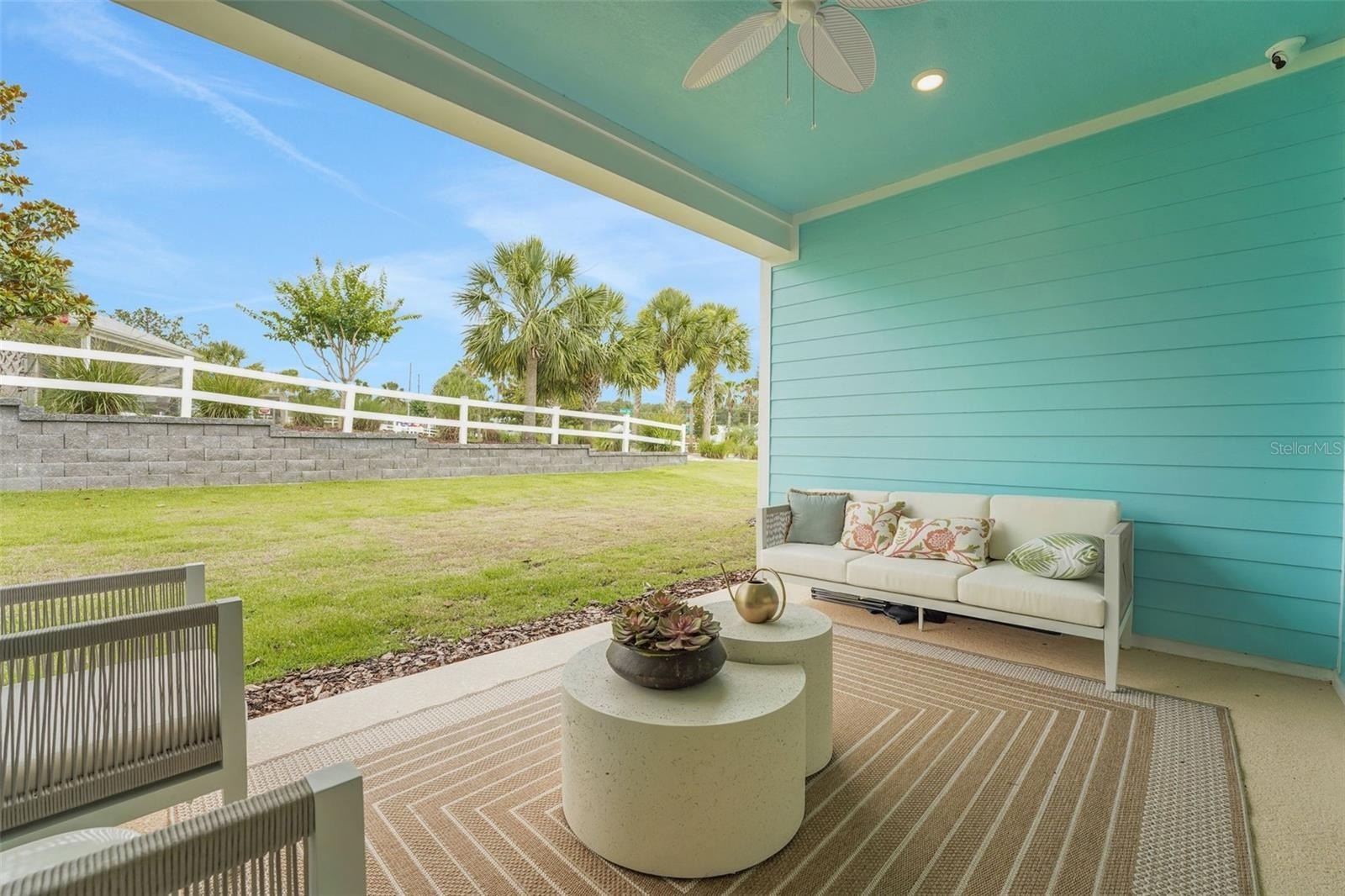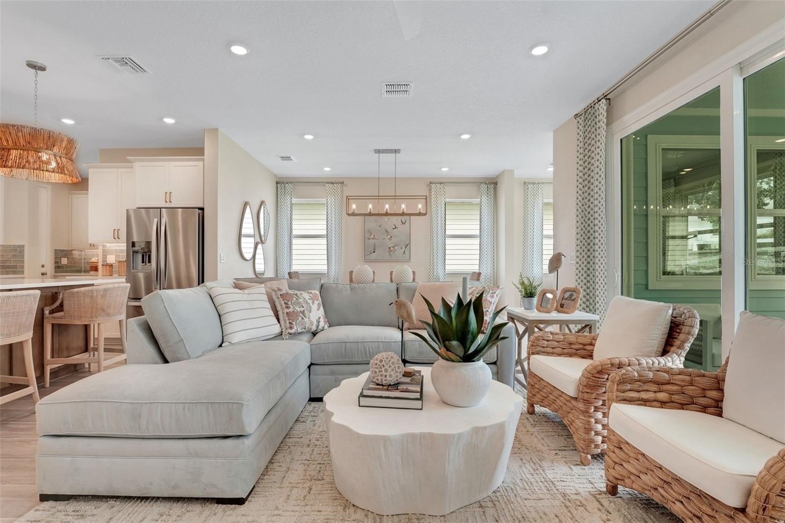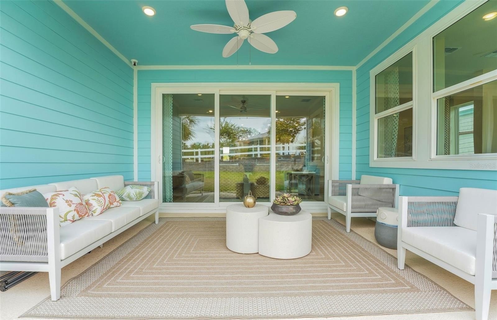 Natural light fills the home through the expansive 12-foot sliding glass doors, leading to a covered lanai ideal for outdoor relaxation and gatherings.