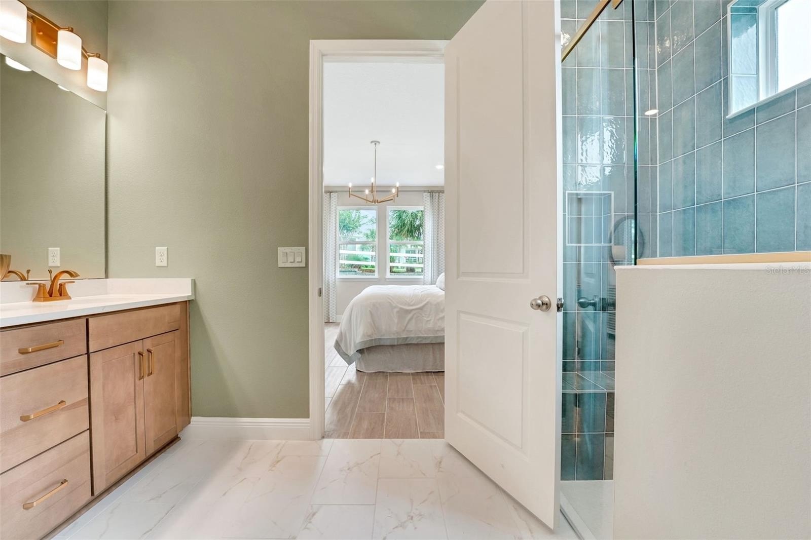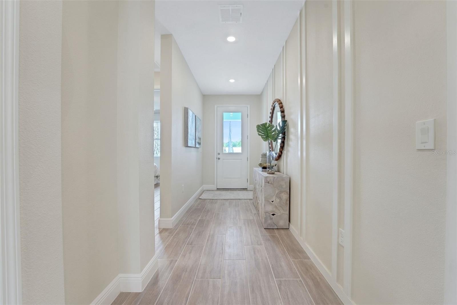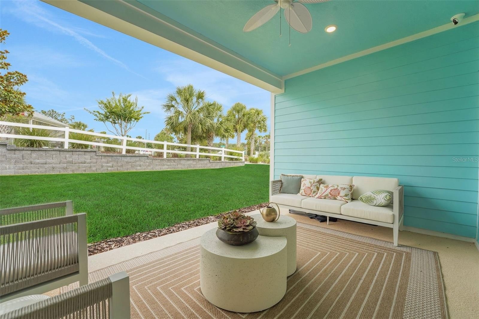 Natural light fills the home through the expansive 12-foot sliding glass doors, leading to a covered lanai ideal for outdoor relaxation and gatherings.