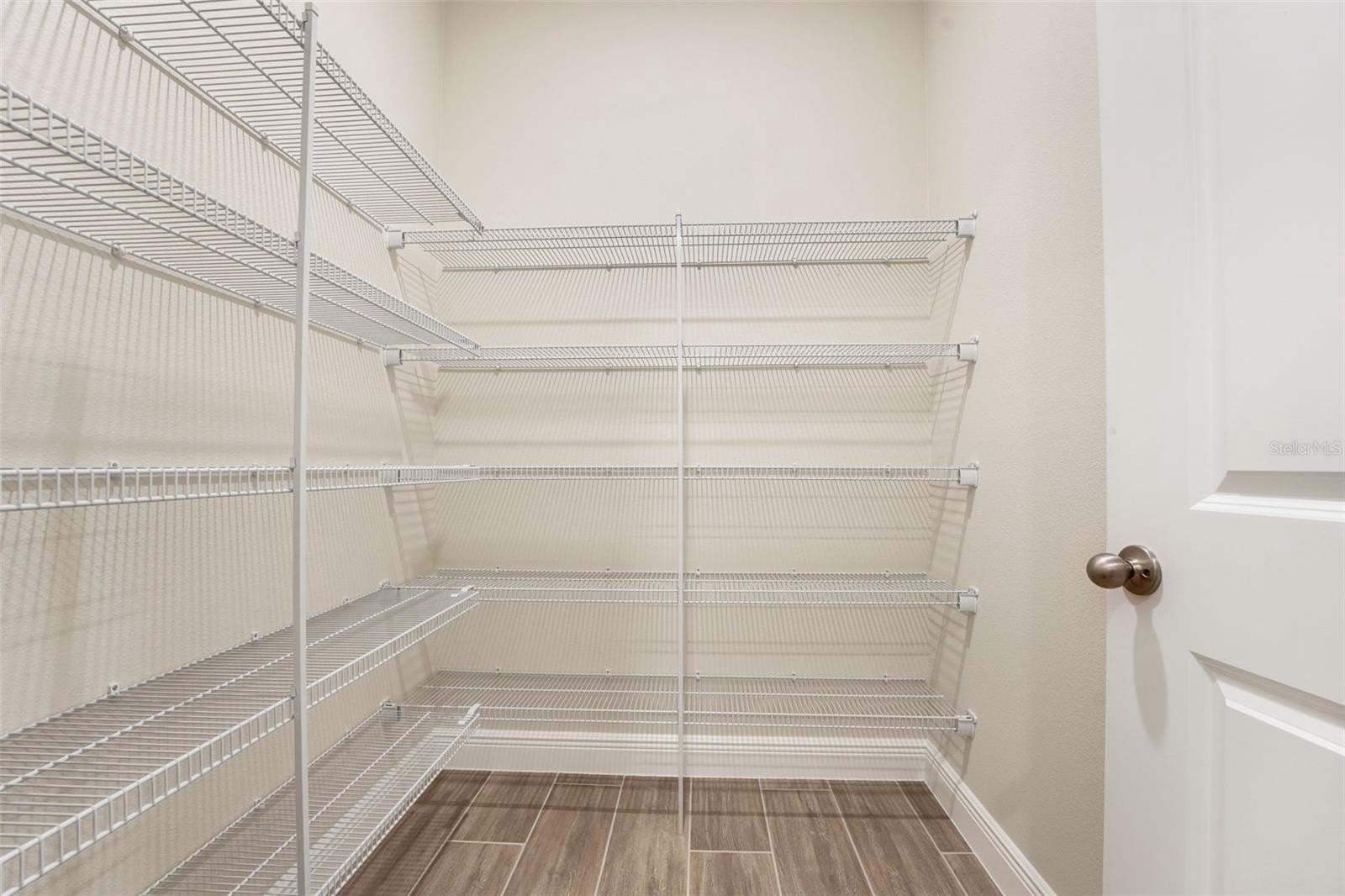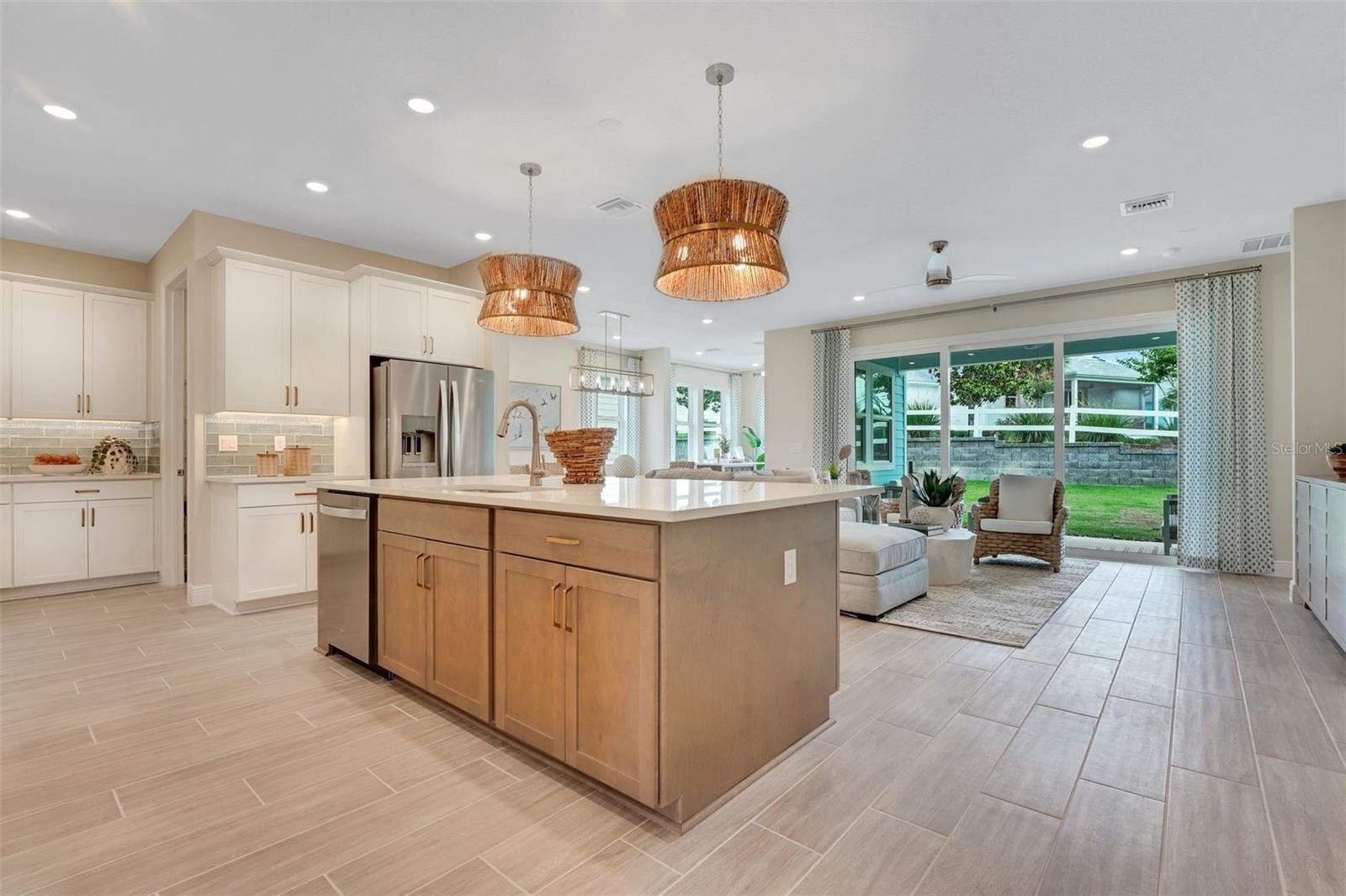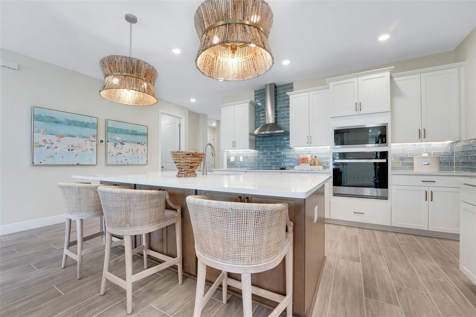 The gourmet kitchen is designed for both functionality and style, equipped with stainless steel appliances, an enlarged center island with quartz countertops, stained quill cabinetry, and 42” linen upper cabinets along the perimeter. A butler’s pantry provides additional storage and prep space, perfect for entertaining.