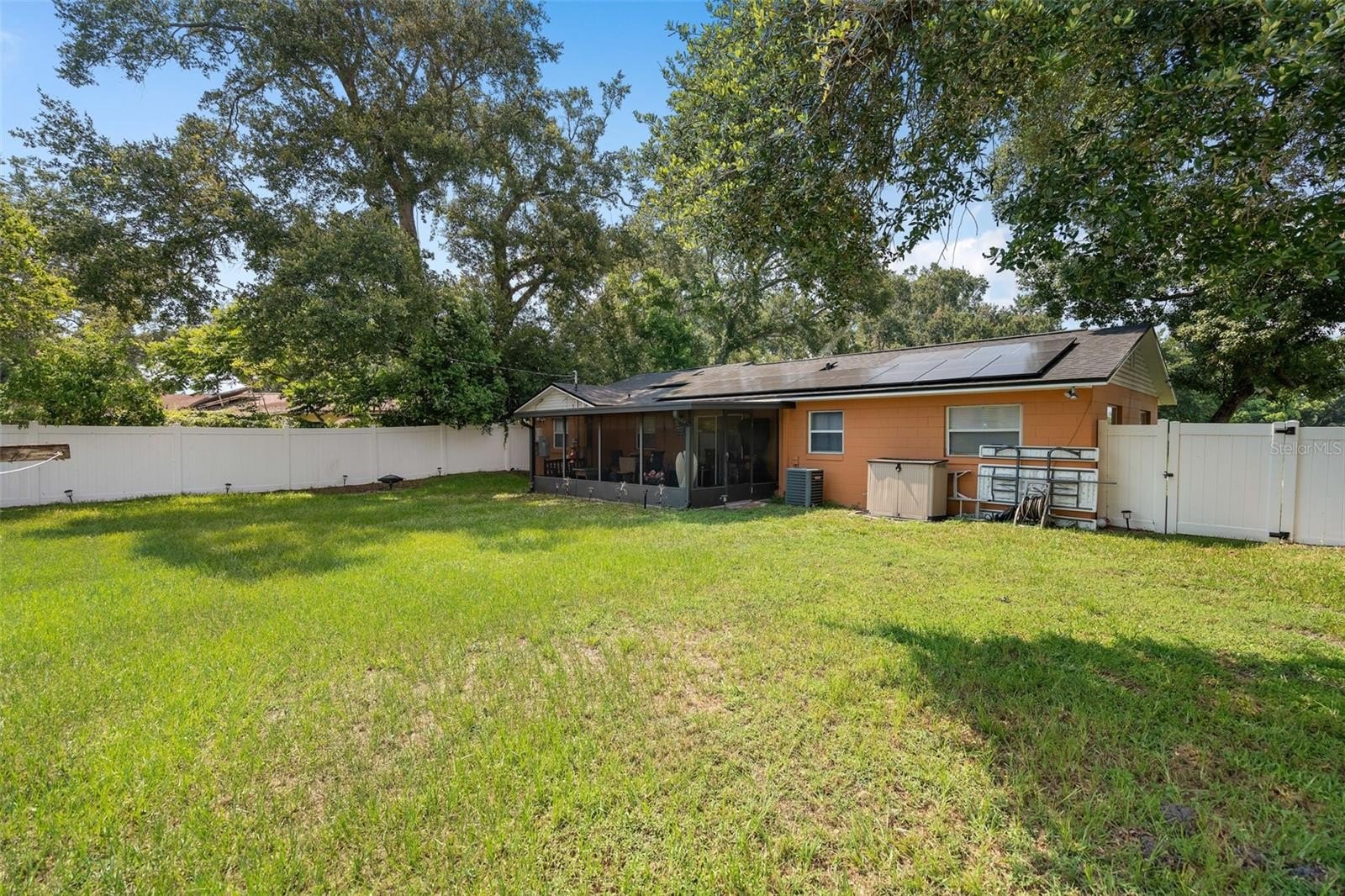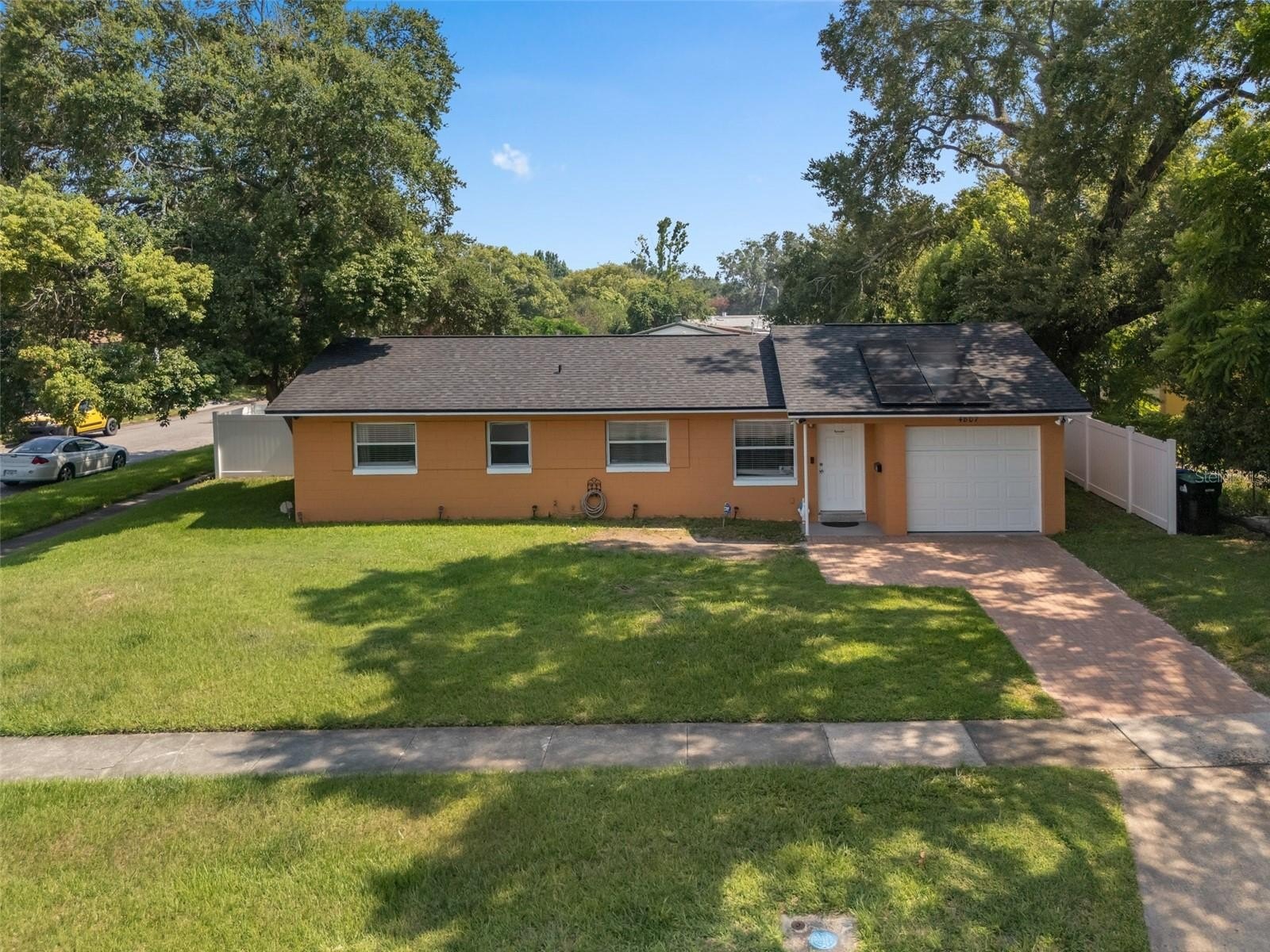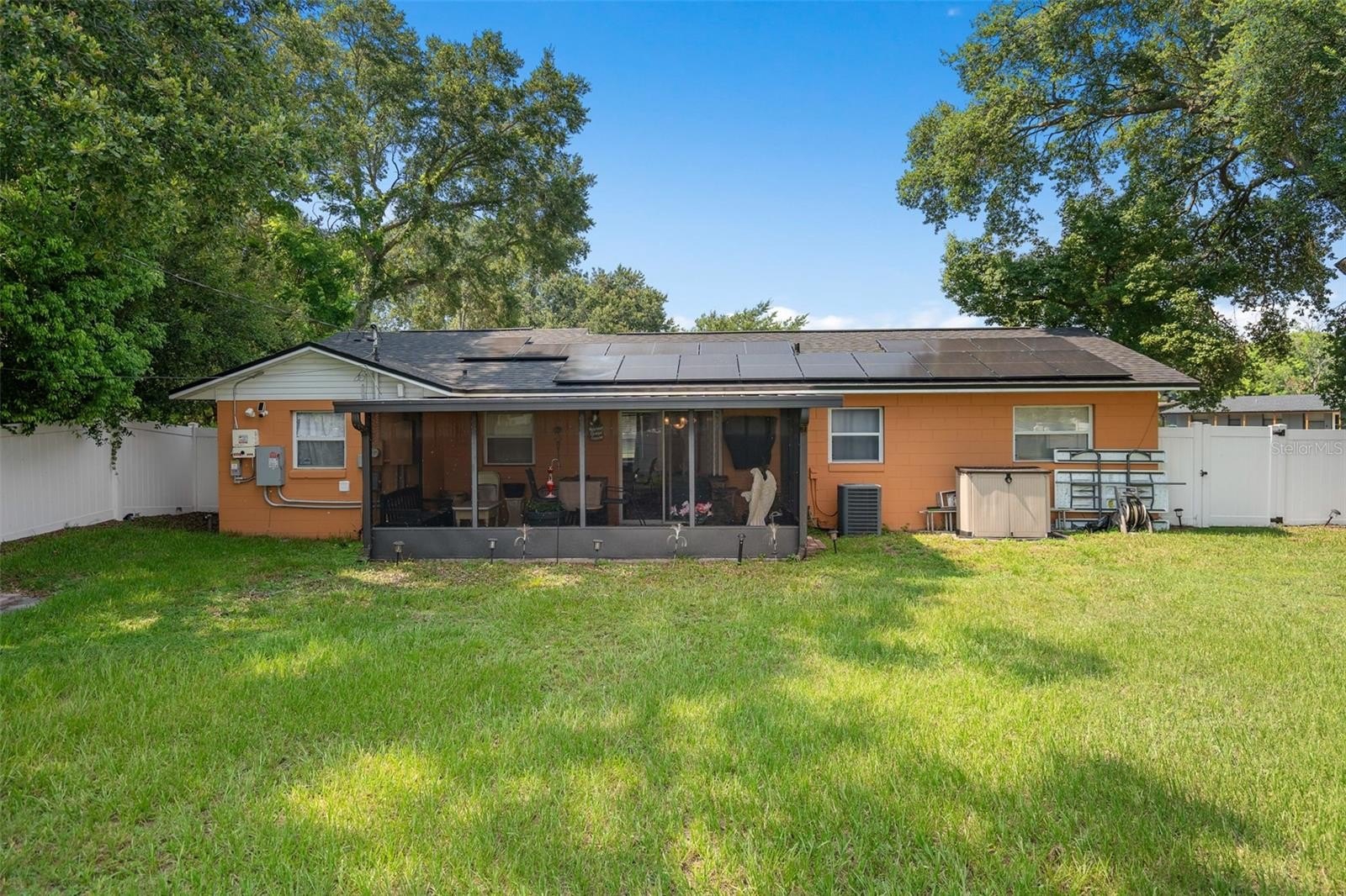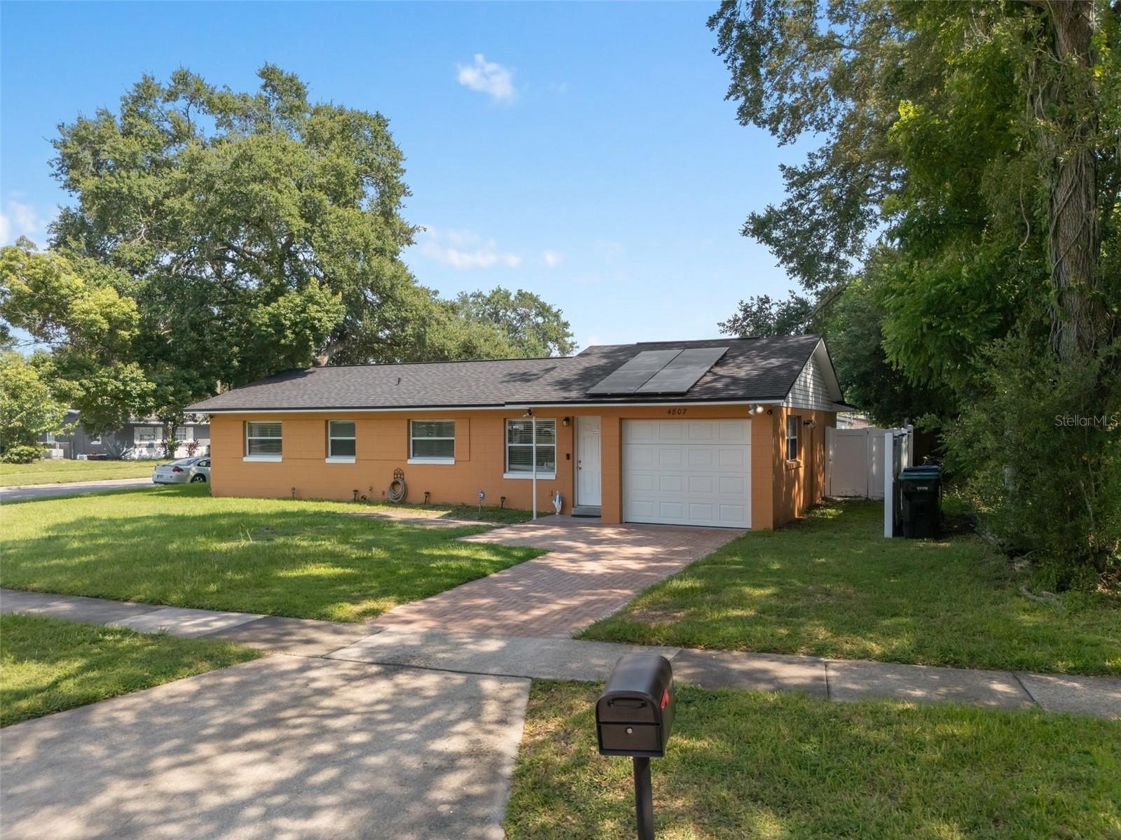 This wonderful 3-bedroom, 2-bathroom block home is nestled on a corner lot in the beautiful Conway Acres subdivision of Orlando. This quiet and peaceful neighborhood has NO HOA and is just minutes away from everything a home owner needs. The pride of ownership shows as soon as you park in the driveway and notice the UPDATED WINDOWS and the HURRICANE RATED GARAGE DOOR. As you enter the house and pass through the charming living room, you'll notice the wide-panel hard wood floors, and abundance of natural light filling the home. The kitchen has many updates including a CUSTOM RANGE HOOD venting outdoors, GRANITE COUNTERS, a customer STONE TILE BACKSPLASH, and an upgraded faucet! From the kitchen you will walk into the bonus/utility room that holds a new COMMERCIAL-GRADE WATER HEATER, a washer and dryer that both convey, a hand wash sink and wonderful storage areas. Both the primary and guest bath have been upgraded from top to bottom! Every bedroom has a ceiling fan and wonderful laminate flooring. The expansive back screen porch has a new PORCELAIN TILE flooring and comes with a wall-mounted flat screen TV! From the porch, you will see the fully-fenced large backyard providing ample space for sports, playgrounds, or a pool! The architectural shingle roof was in installed in 2022. The air conditioner was installed in 2020. The solar panels were installed in 2023. Balance on panels is $41,822.56 with a monthly payment of $241.78. When the balance reaches $29,000, the monthly payment goes to $169.45. The last power bill was $12!!! To top it all off, the garage easily holds a full size vehicle, offers tons of storage, and has a brand new garage door opener! Come see this beautiful home and make it yours today!