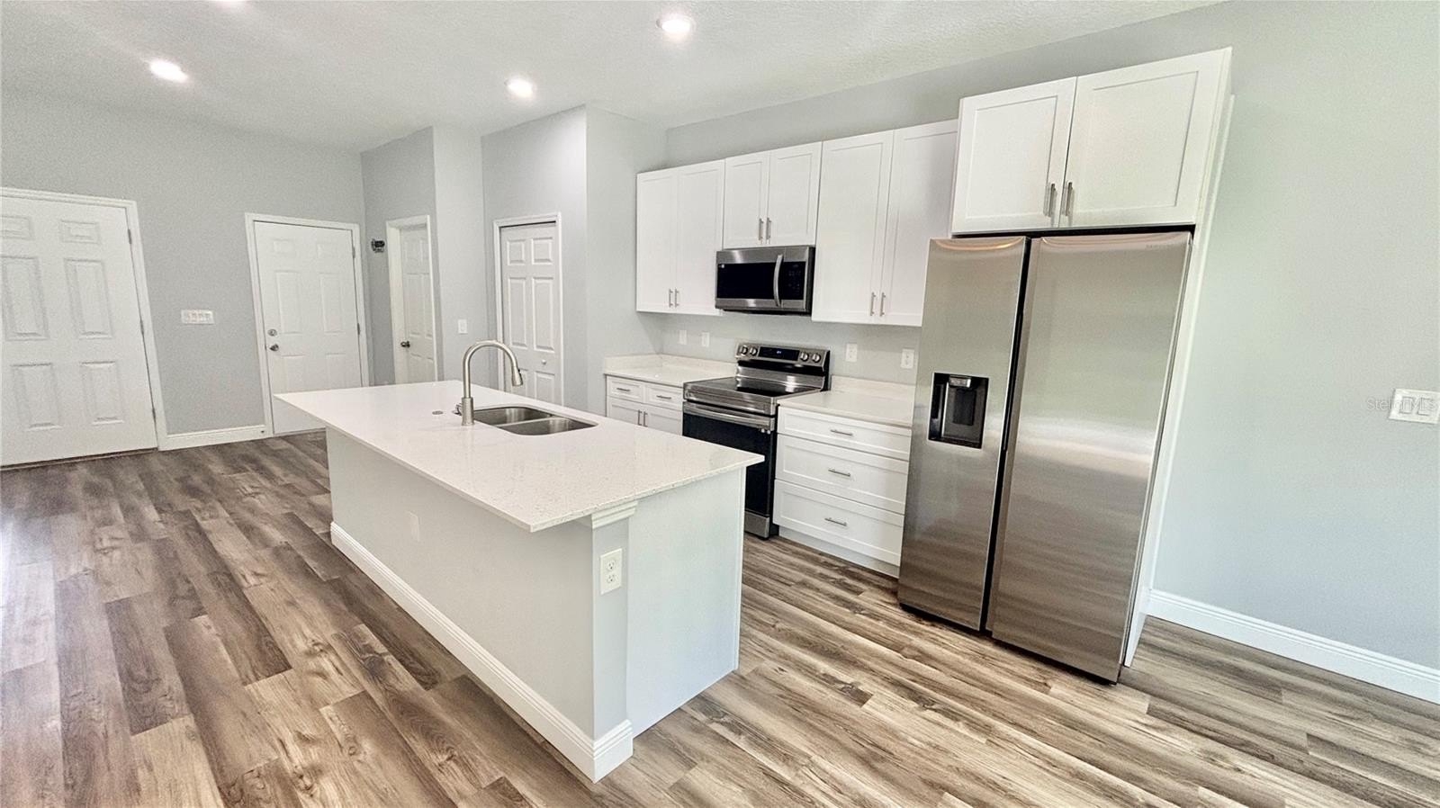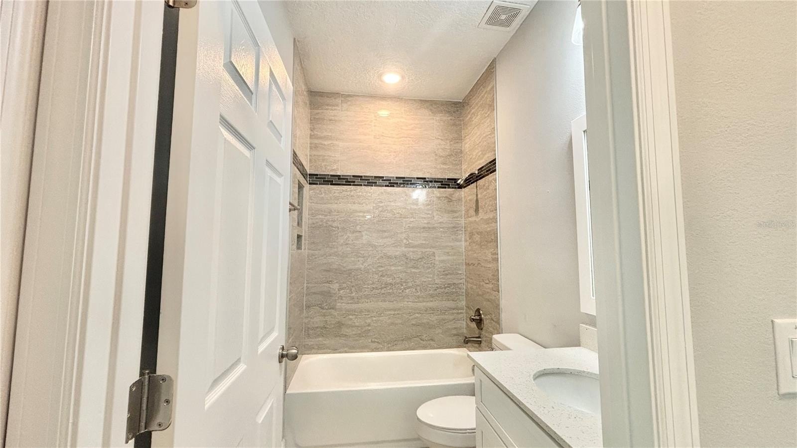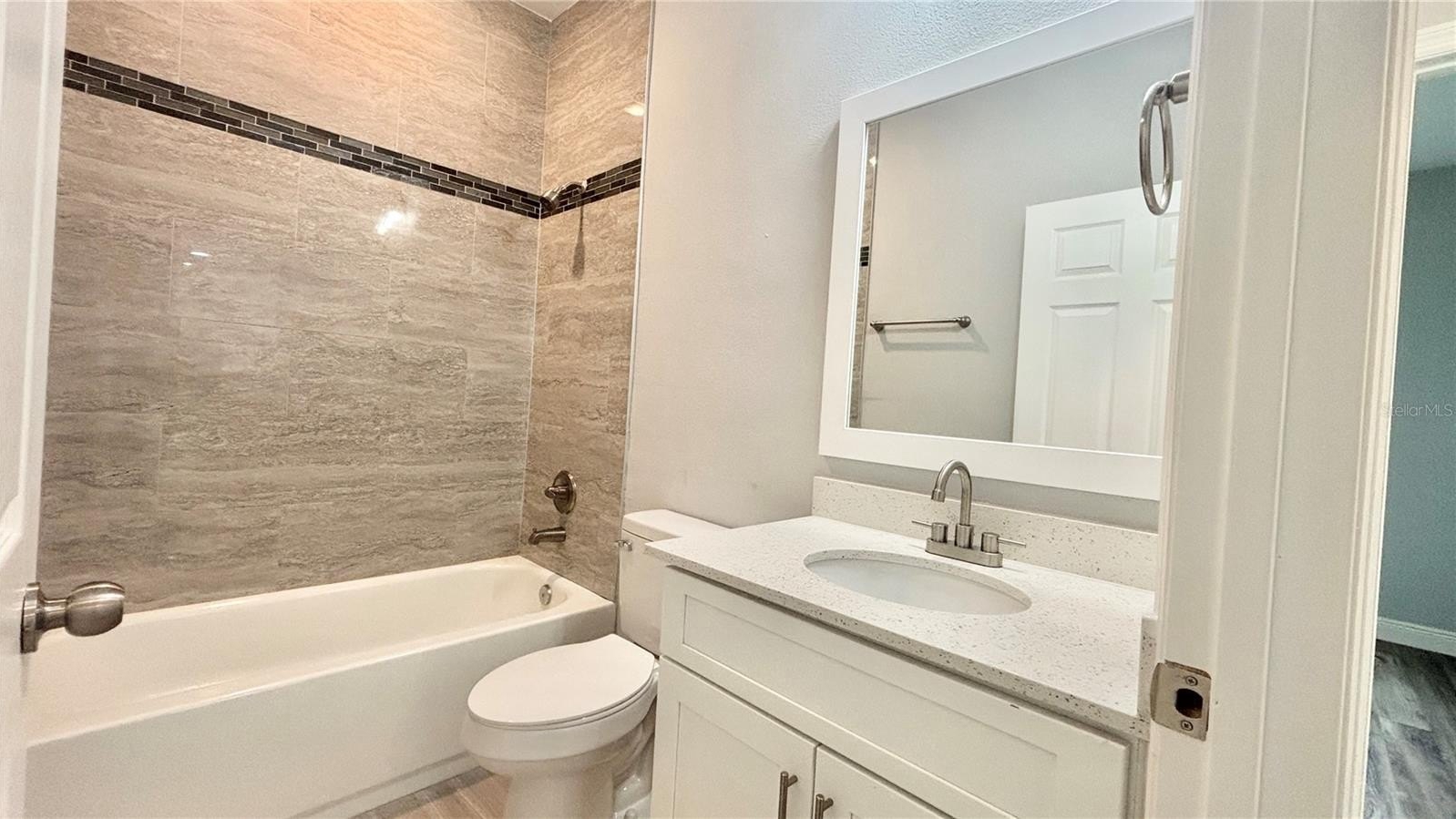 The kitchen is a true highlight, offering solid wood cabinets, sleek stone countertops, and included appliances—perfect for any home chef. Both bathrooms are full-sized and well-appointed, providing functionality and comfort for a growing household.