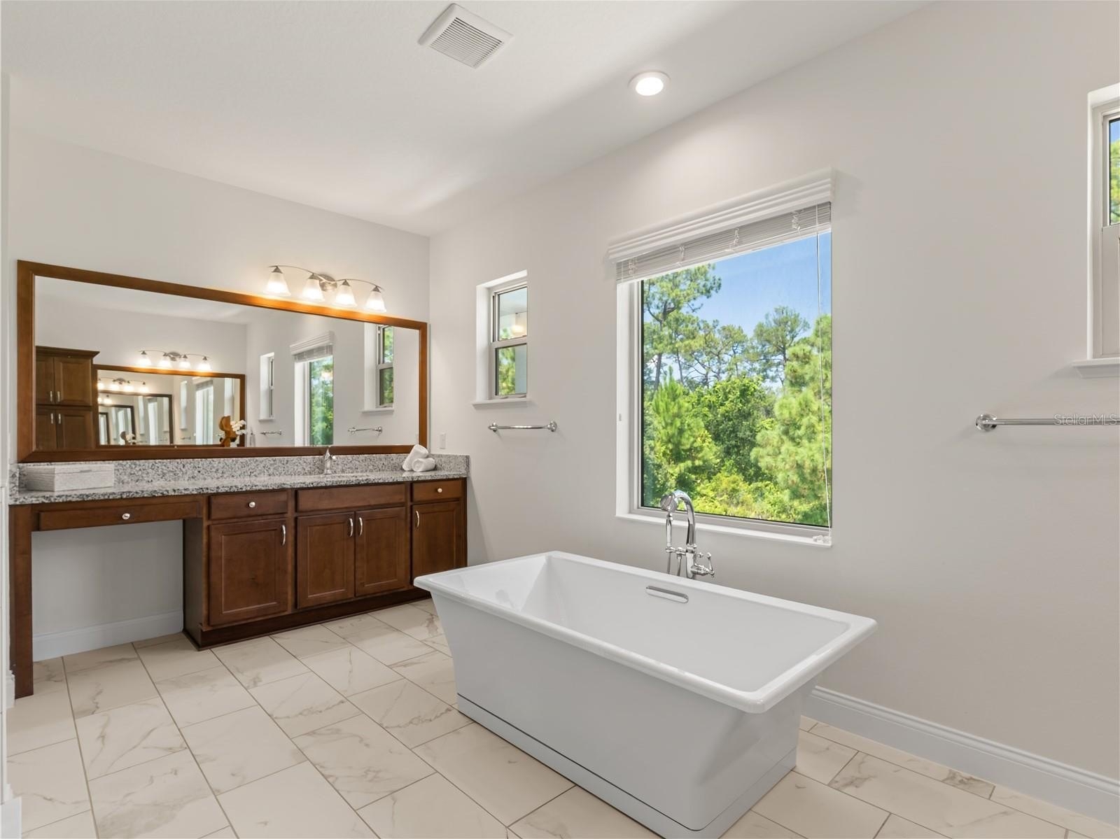 Outdoor living spaces include an oversized paver driveway, a large marble backyard lanai with views of Disney fireworks, an oversized upstairs balcony, and a privacy wall with all hookups ready for your custom summer kitchen.