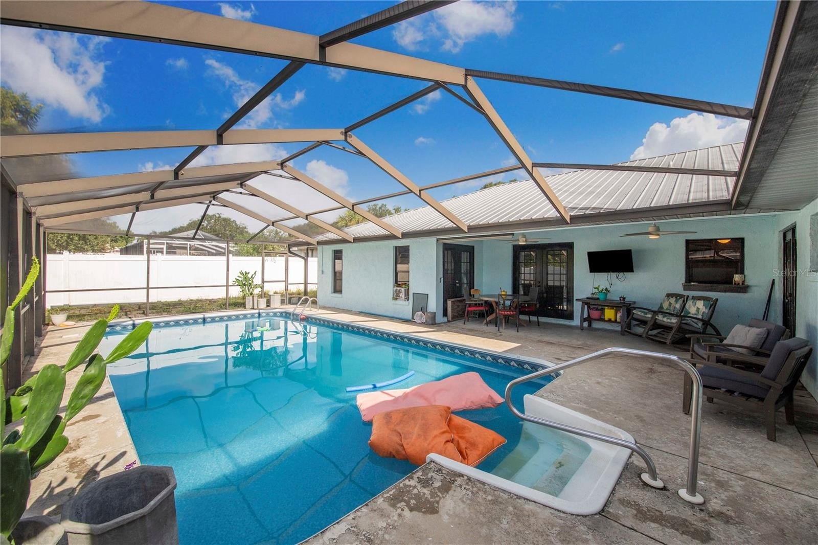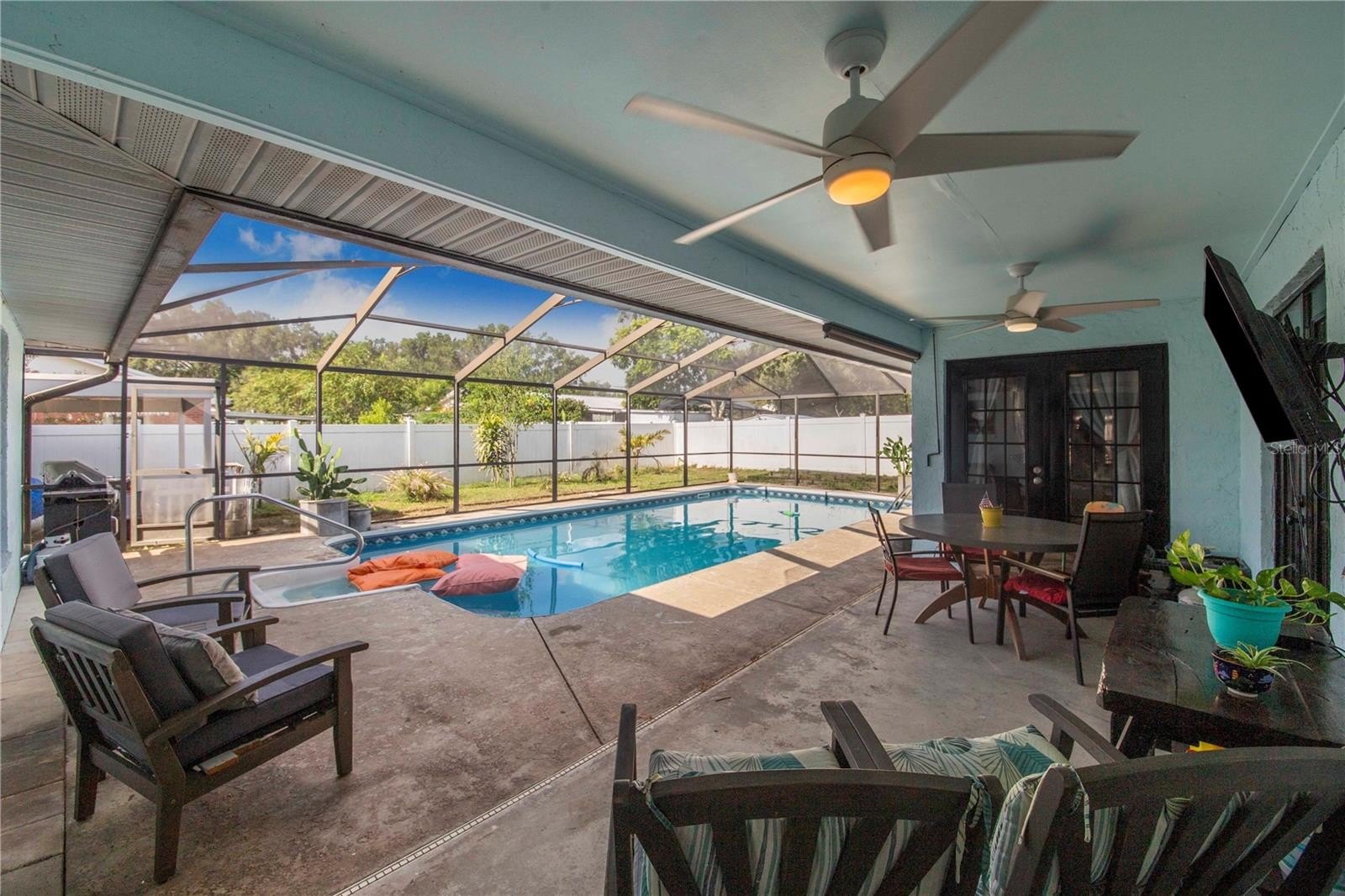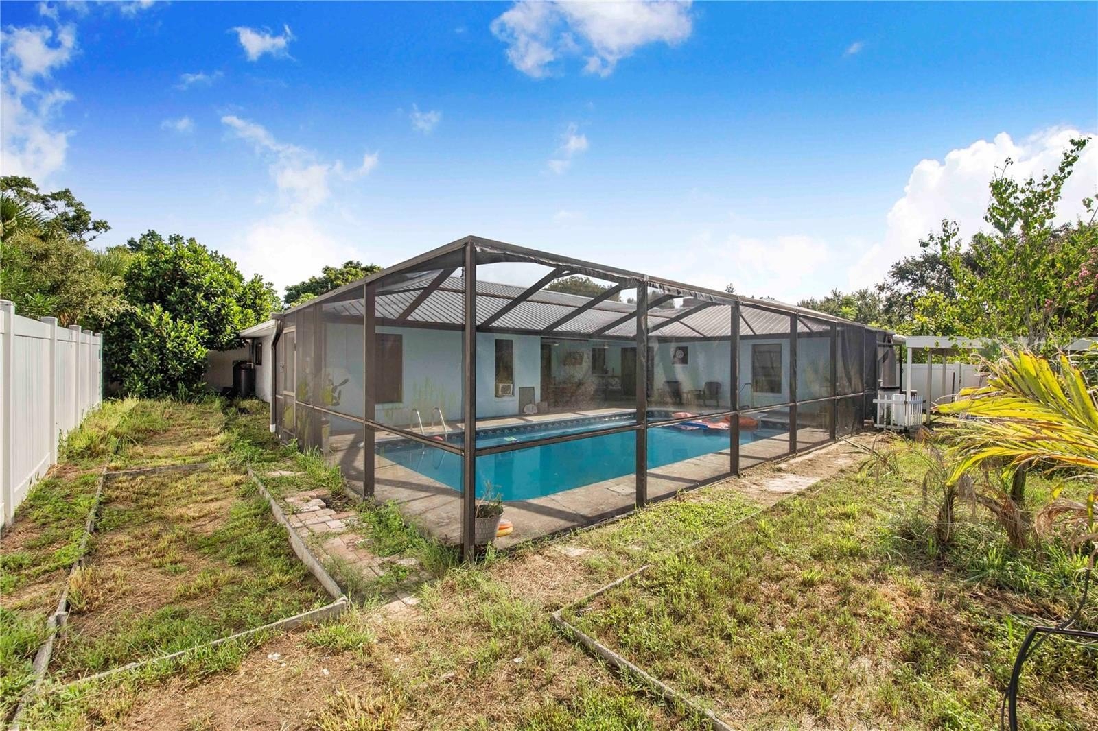The primary suite offers a peaceful retreat with a private en-suite bath and generous closet space, while the additional bedrooms are ideal for family, guests, or a home office. Enjoy relaxing on the covered patio overlooking the backyard, perfect for outdoor dining or morning coffee, followed by a dip in the private inground screened in pool. A large variety of fruit trees are planted around the property offering a tropical environment type of feel and great tasting fruit.