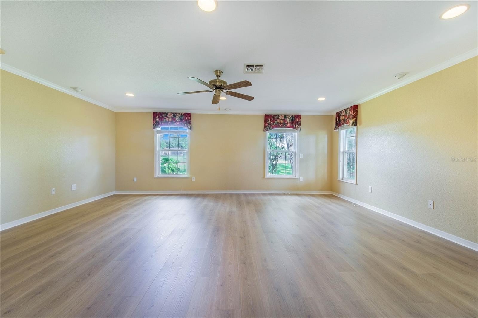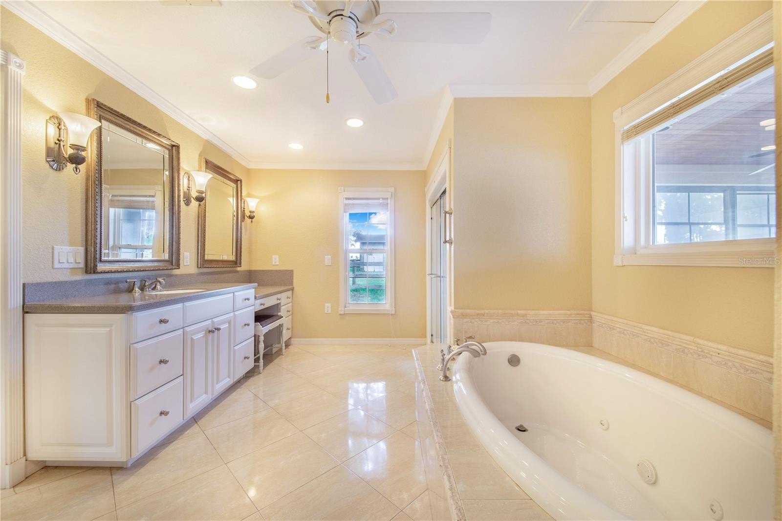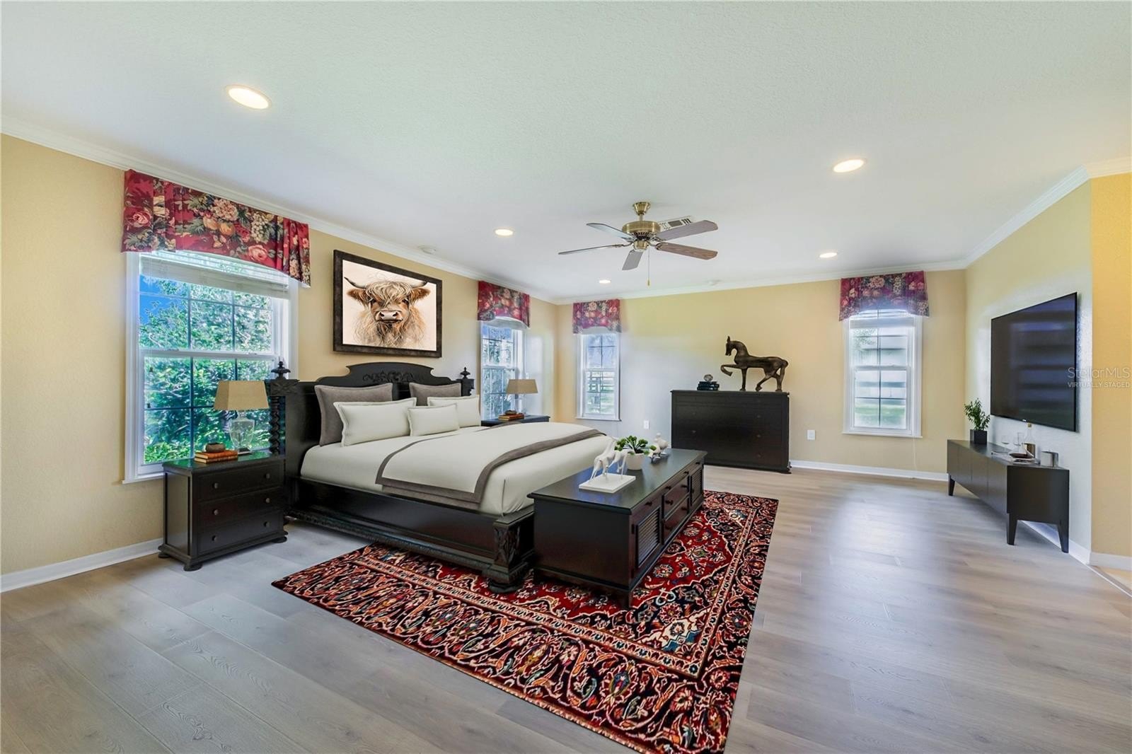The expansive 27’ x 39’ master suite is a true sanctuary, featuring double custom closets, double bathroom vanities, a jetted bathtub, and a water closet. The spacious 19’ x 24’ living room is filled with natural light from floor-to-ceiling French windows and showcases a wood-burning fireplace and custom cabinetry. Enjoy energy efficiency and comfort with double-pane windows throughout the home.