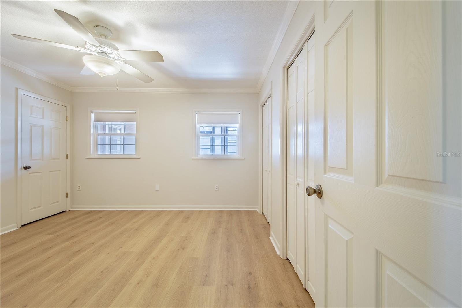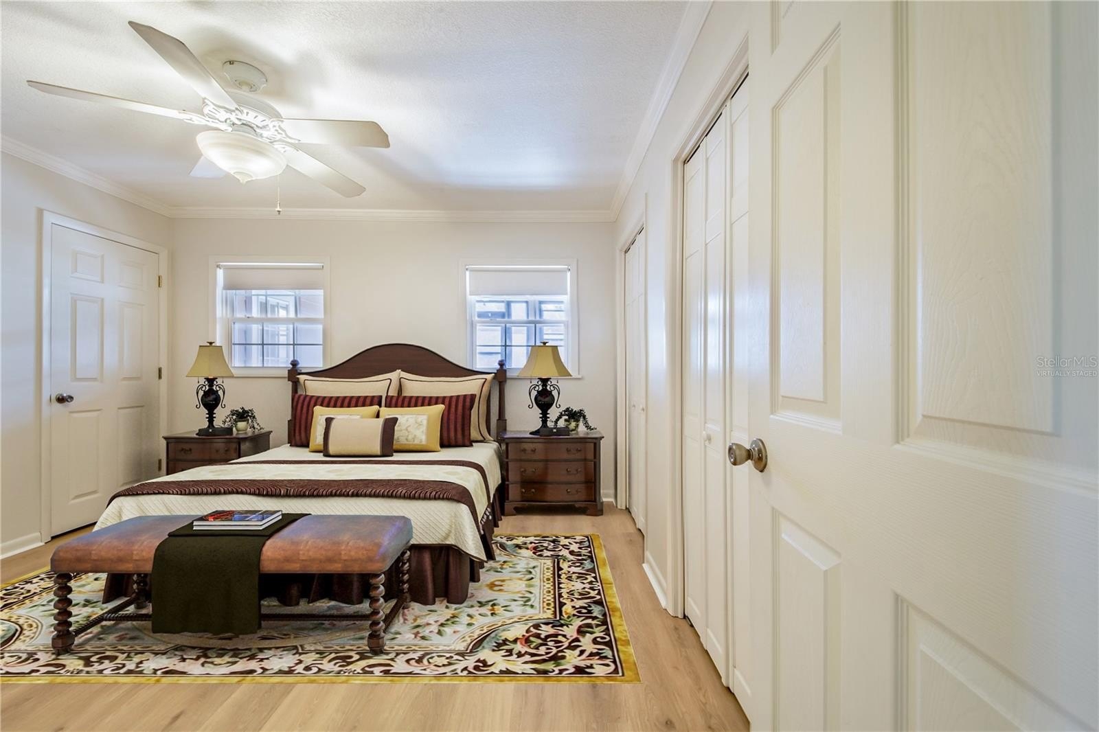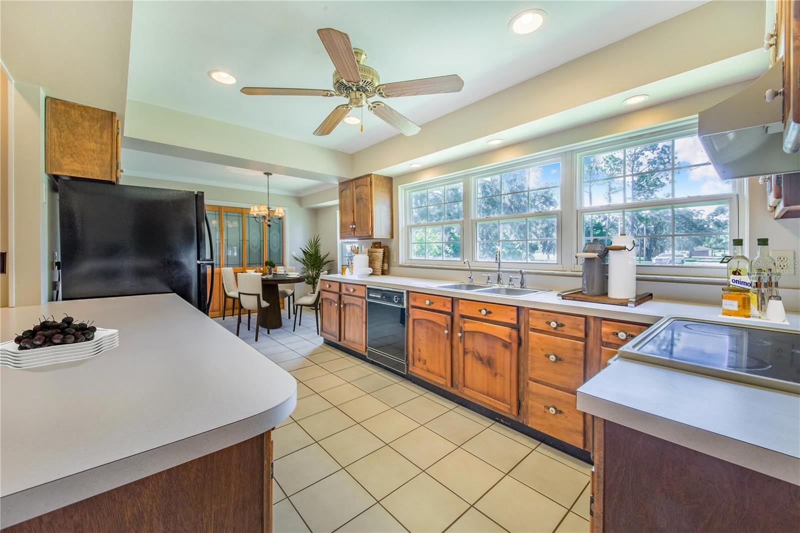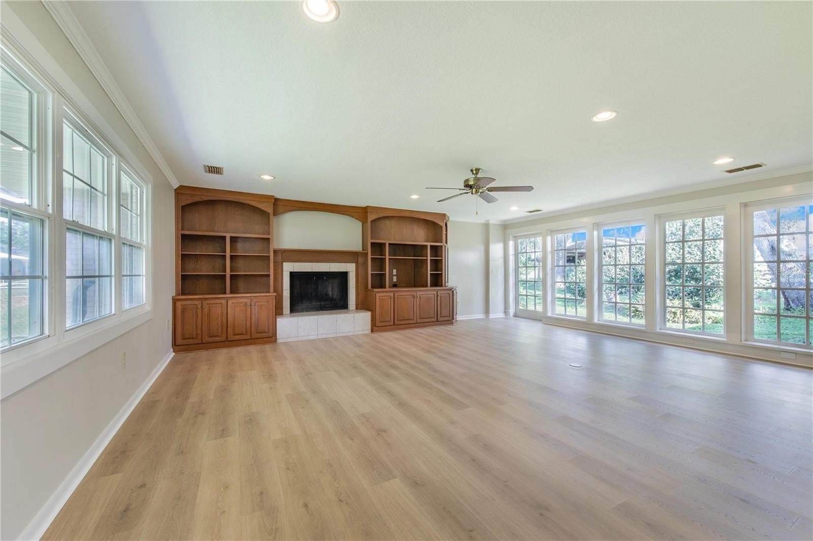 The expansive 27’ x 39’ master suite is a true sanctuary, featuring double custom closets, double bathroom vanities, a jetted bathtub, and a water closet. The spacious 19’ x 24’ living room is filled with natural light from floor-to-ceiling French windows and showcases a wood-burning fireplace and custom cabinetry. Enjoy energy efficiency and comfort with double-pane windows throughout the home.