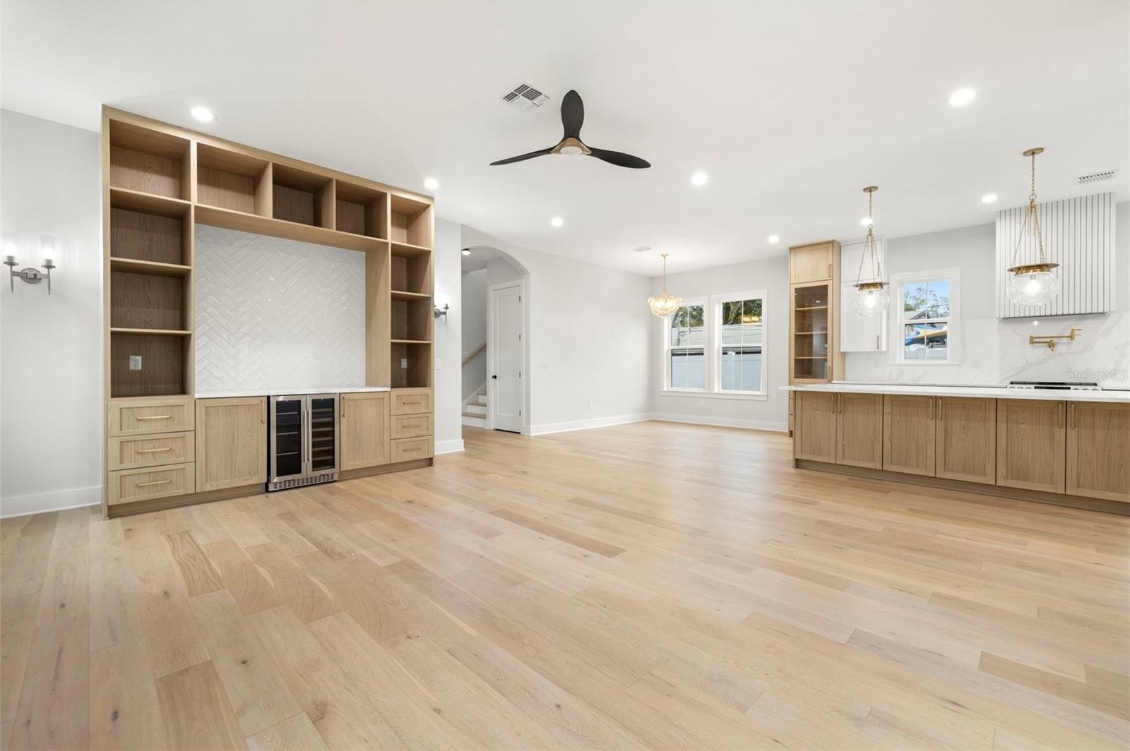 Open-concept living area with soaring ceilings, elegant chandeliers & recessed lighting.
