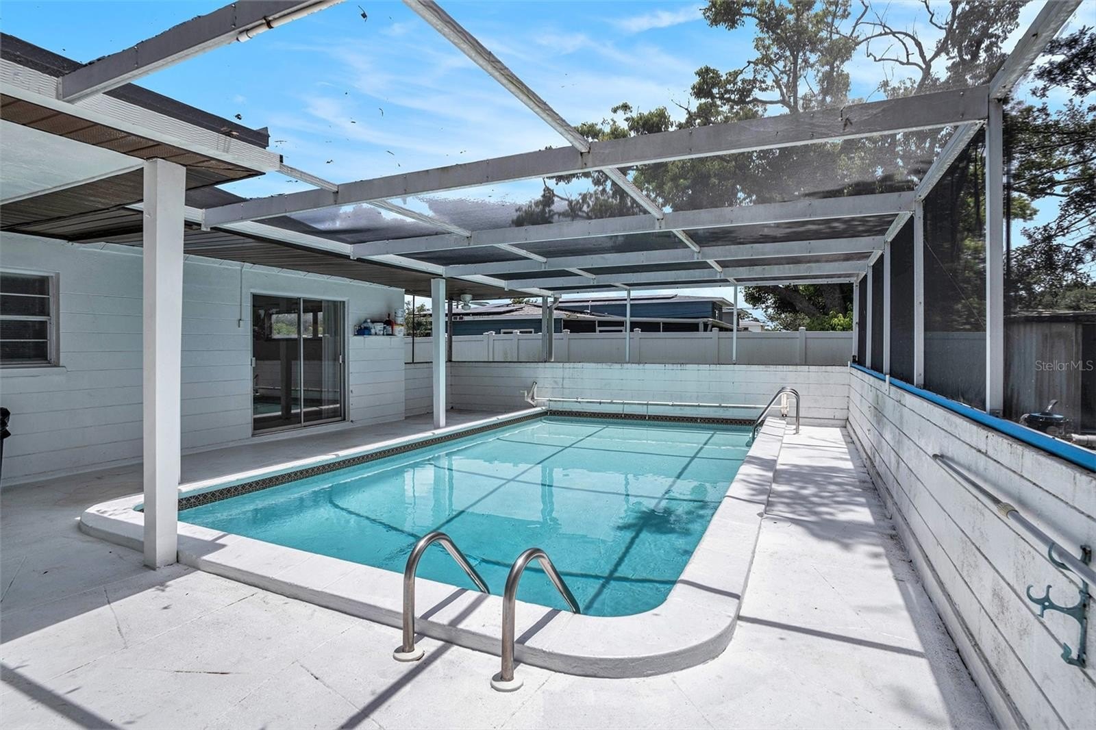 Fantastic 1700+ sq/ft, 4 bed, 2 bath, pool home in Seminole with new roof, updated plumbing, and A/C!!! The spacious main living area of this home features a large open living area with high ceilings, lots of windows, and refinished terrazzo floors, a large living room, a dining room, a sunroom/office, and a nice kitchen that has been updated with fresh paint, countertops, and a tile backsplash. The split bed floor plan features two beds and a full bath on one side and two more beds (including the primary suite with sliders out to the screened in pool area), and a bath on the other side. Outside this home features a refininshed pool with screened in lanai a large fenced in backyard, an attached garage, and a large driveway with plenty of parking. This is a great home in a great community!!!