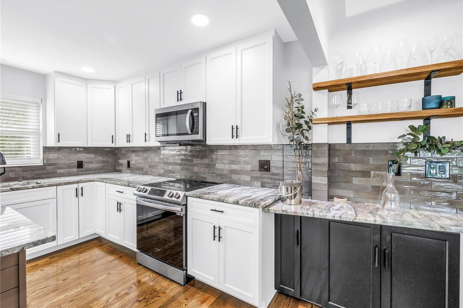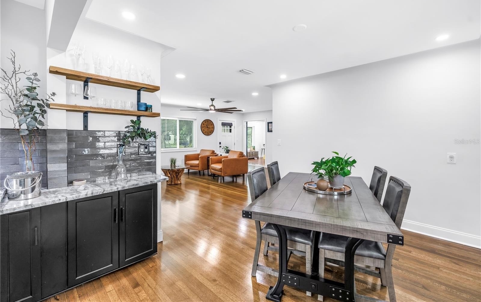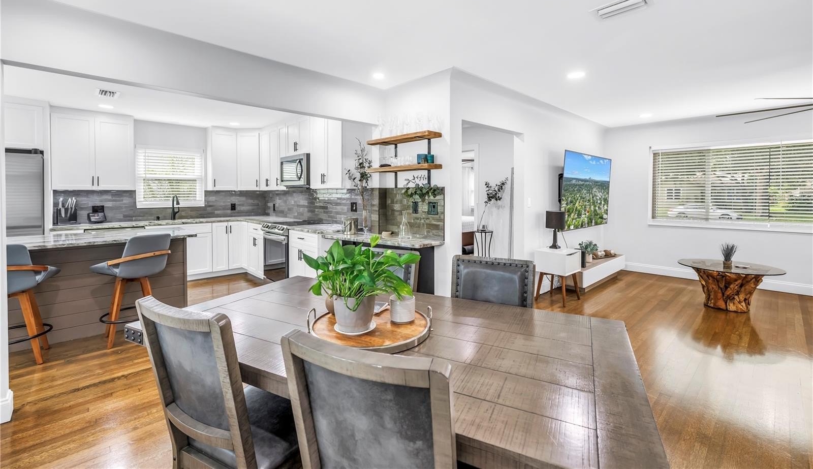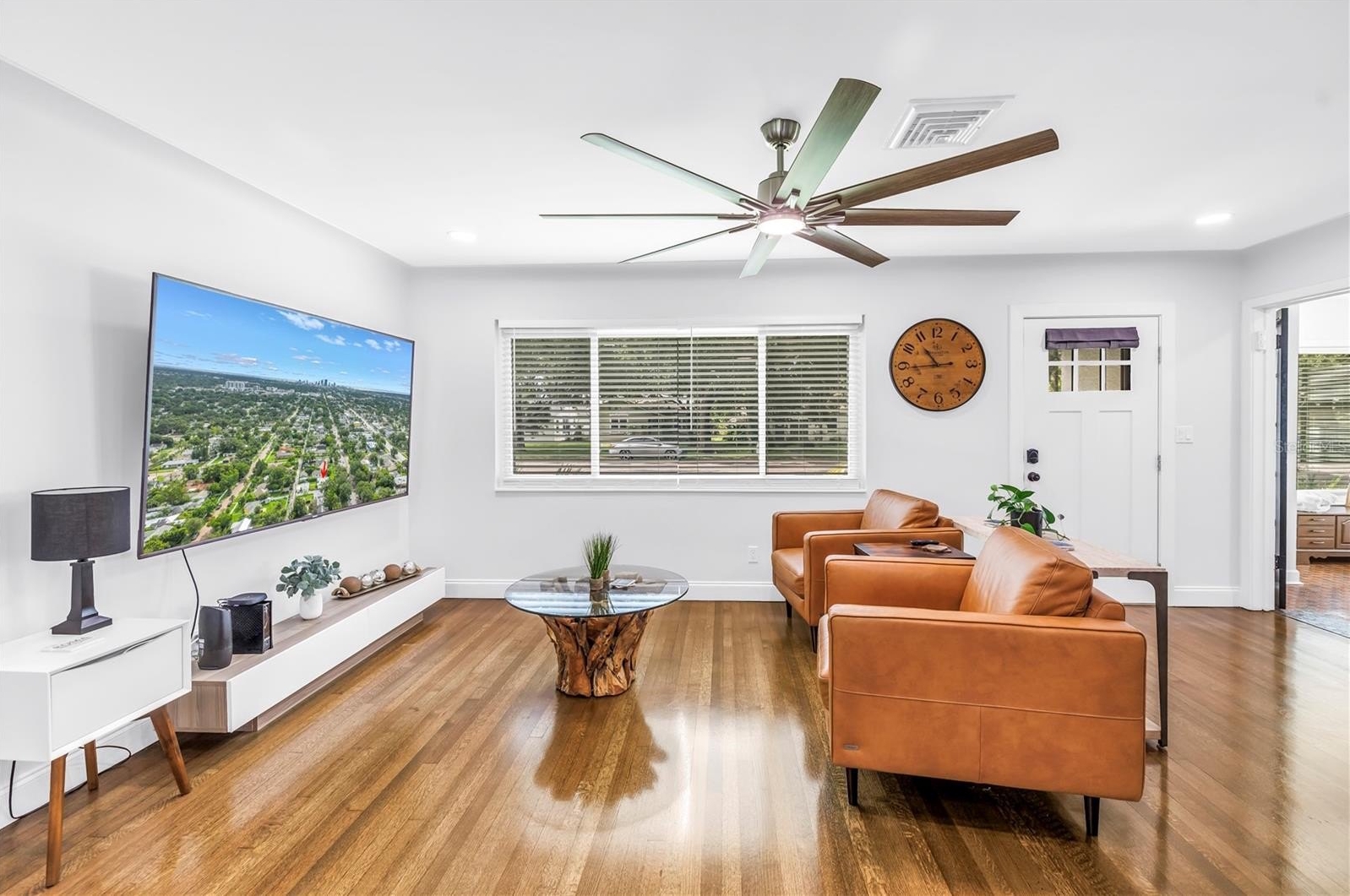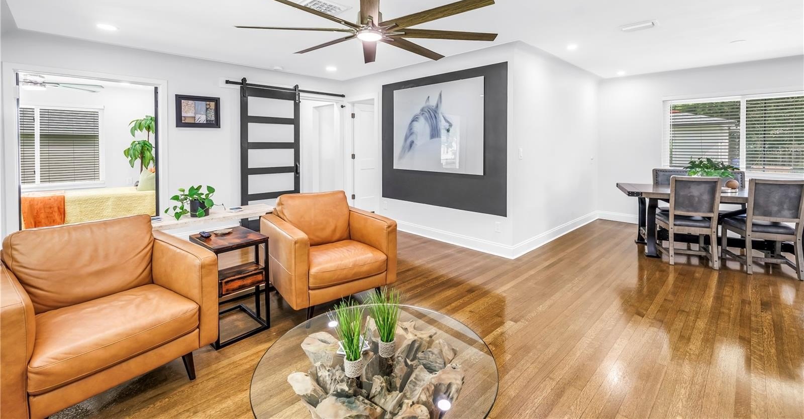 The main residence offers 4 bedrooms and 2 bathrooms across 1,508 sq ft of heated space and showcases authentic mid-century character throughout. Step inside to experience the stunning original 2¼" x ¾" solid oak hardwood floors, professionally sanded, stained, and finished with three coats of urethane — restored to an impeccable, like-new condition. Architectural highlights include graceful cove ceilings and true plaster walls, all freshly painted with a professional touch. The kitchen was fully renovated in 2023, featuring new cabinets, countertops, and appliances that balance modern functionality with classic design.