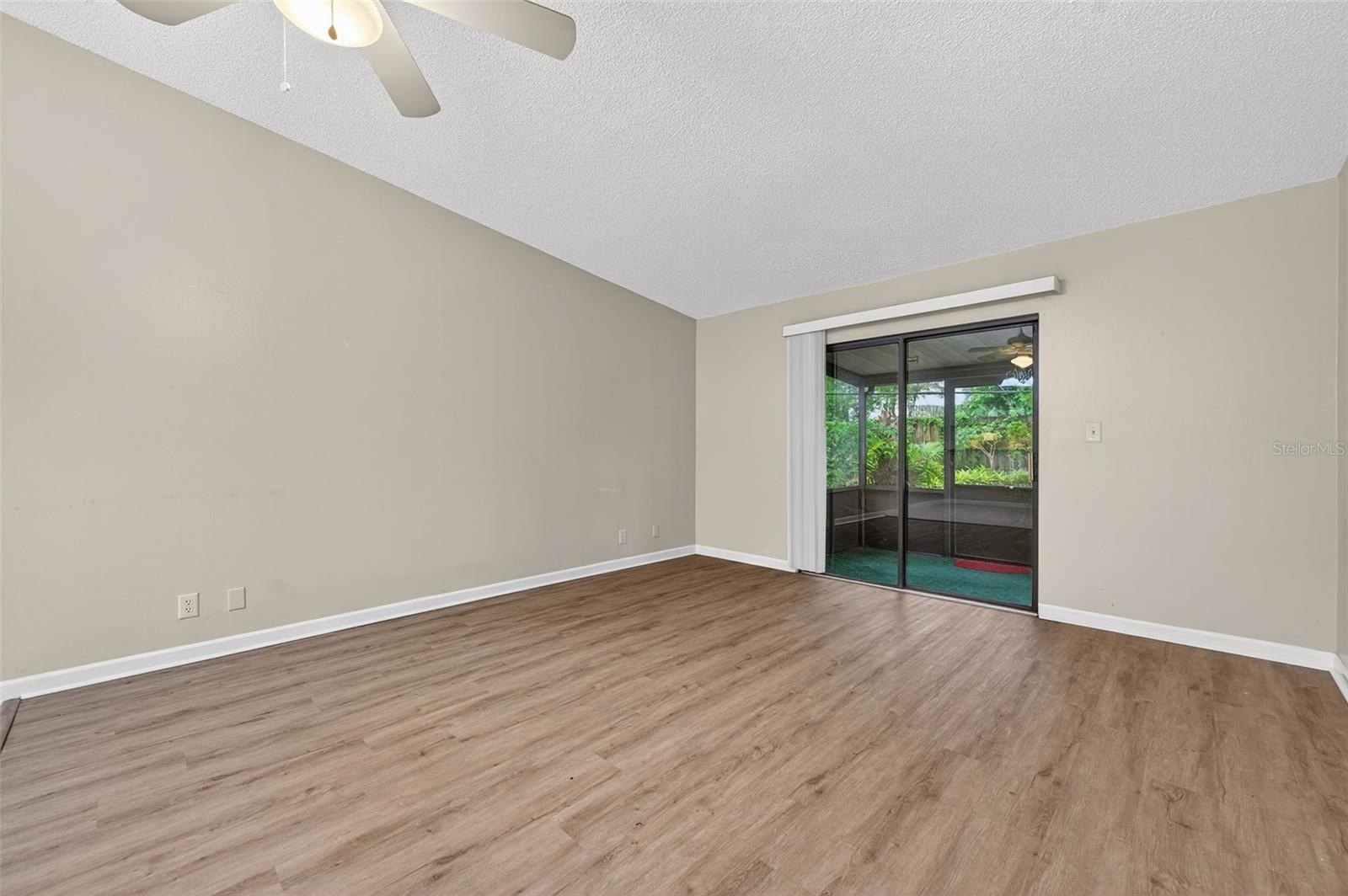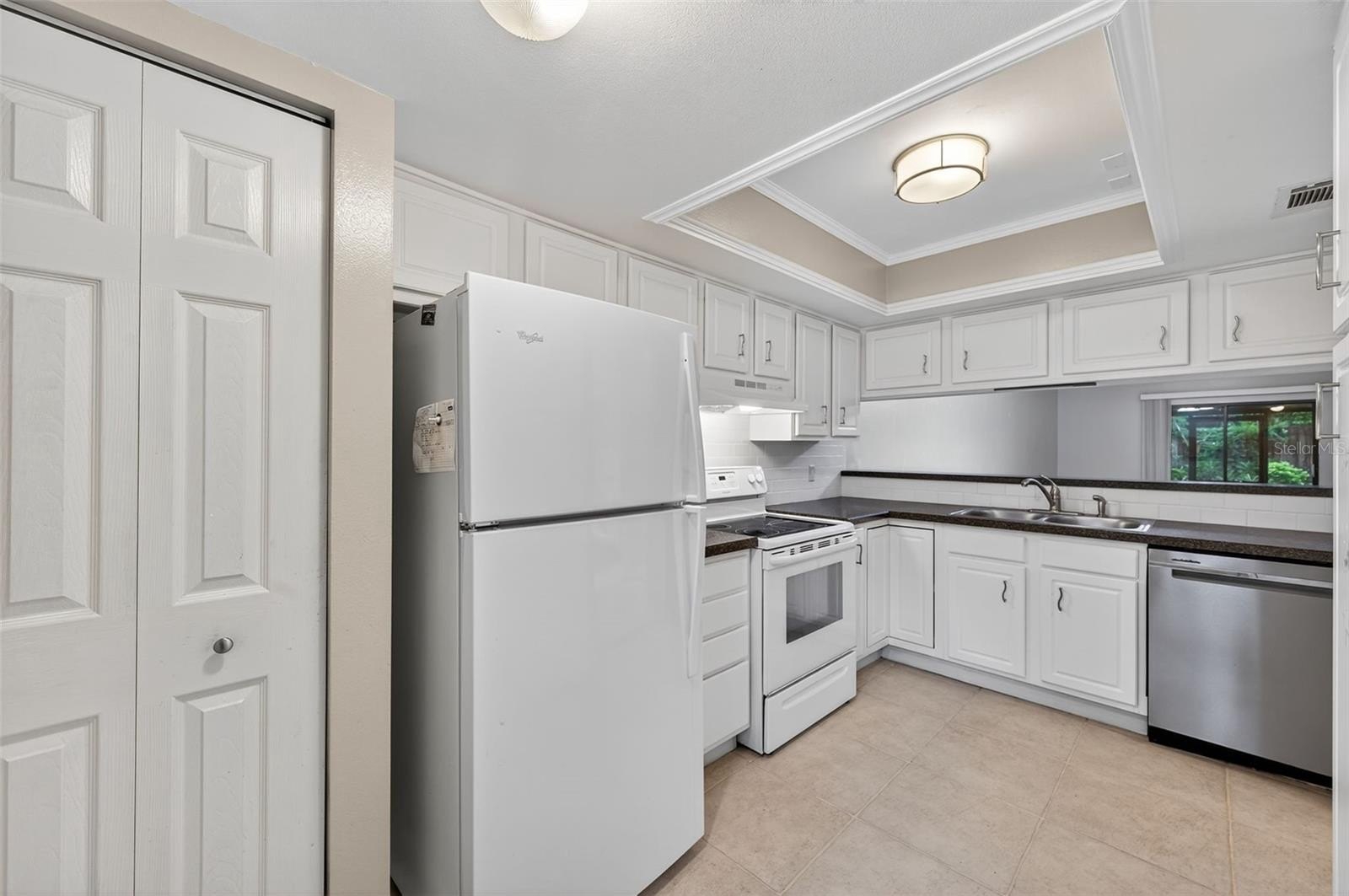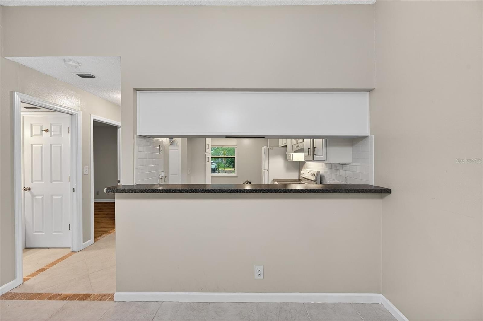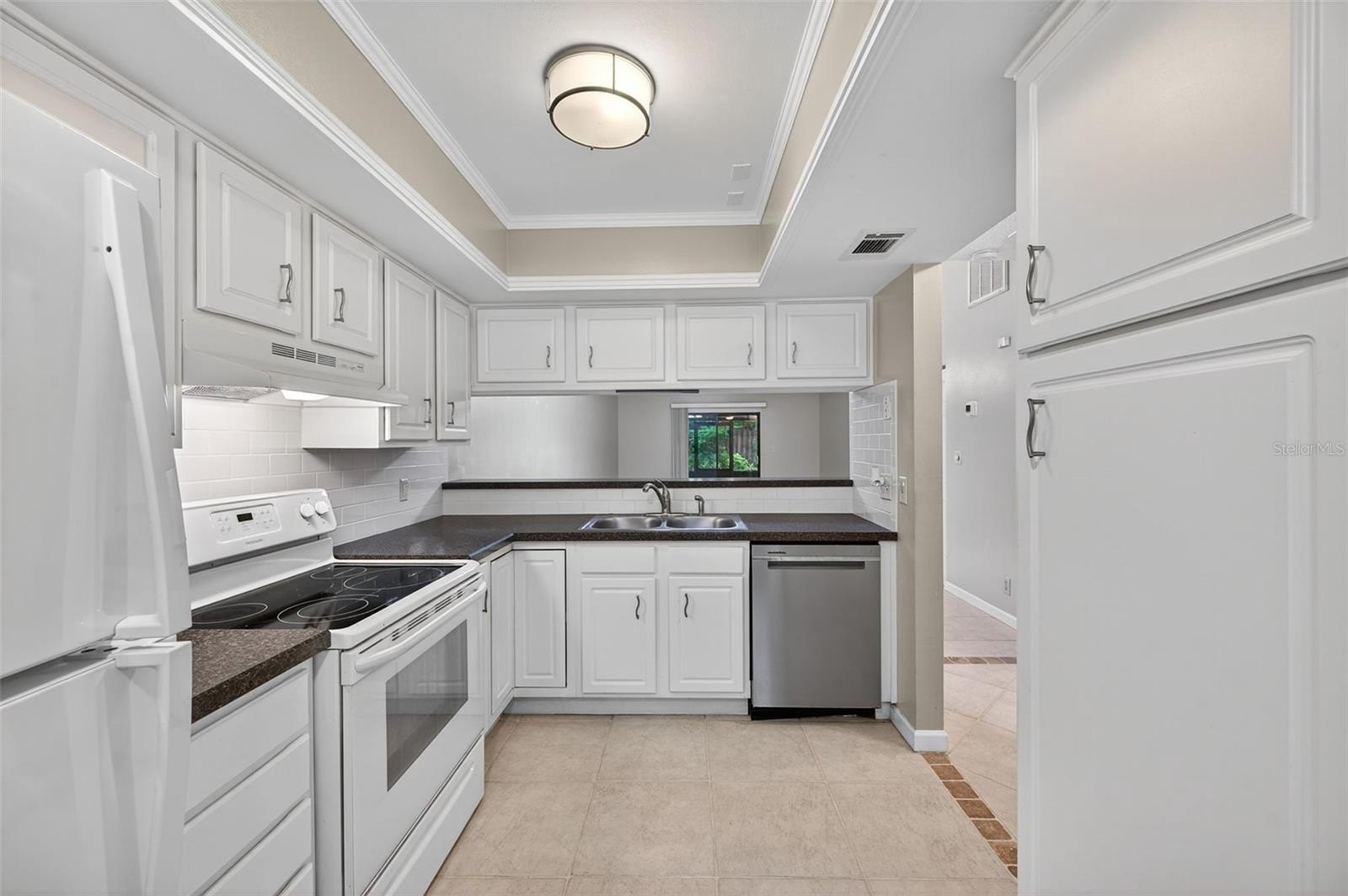 Step inside to find a spacious open-concept layout featuring tile and wood-style flooring, vaulted ceilings, and the perfect amount of light. The timeless kitchen boasts crisp white cabinetry with Corian counters, a full appliance package, and a pass-through window to the dining area, making entertaining easy and efficient. The adjoining living and dining space is perfect for gatherings or relaxing evenings, with sliding glass doors that lead out to a screened-in patio, perfect for enjoying the beautifully maintained garden.