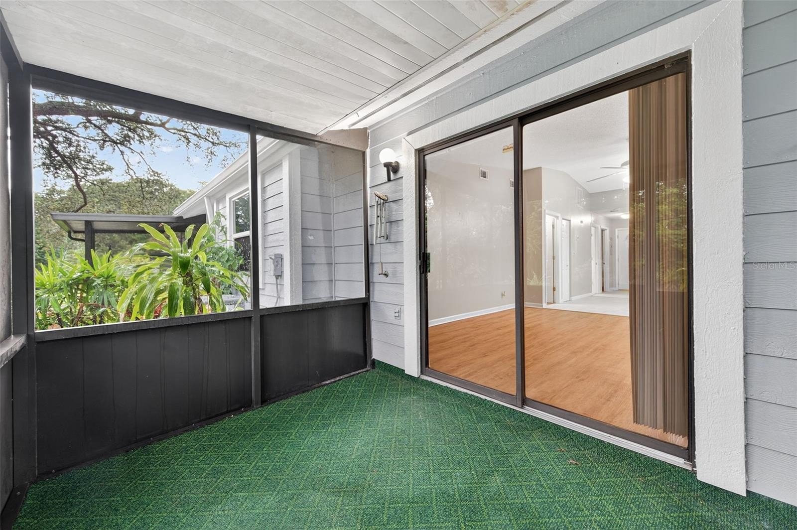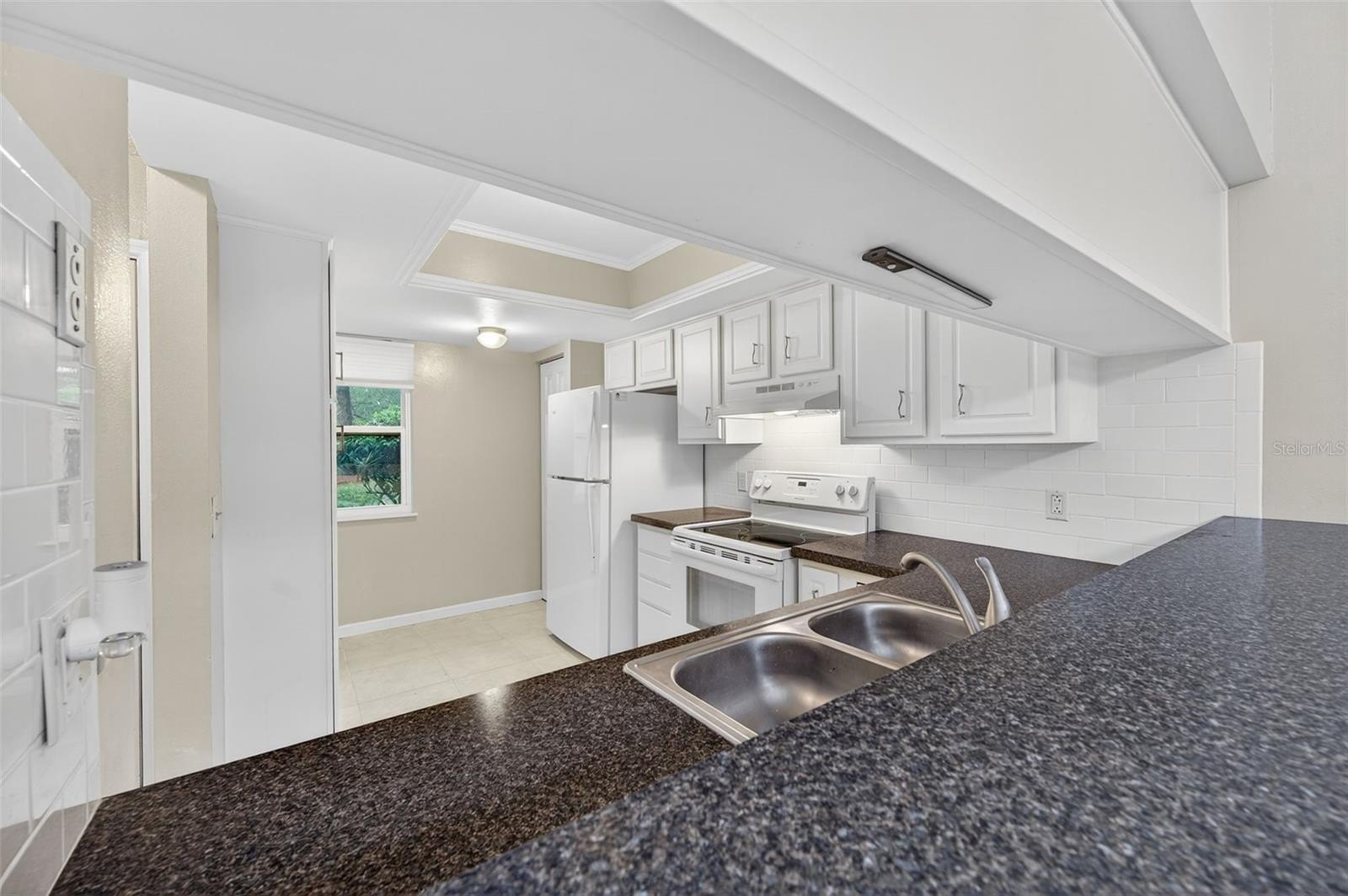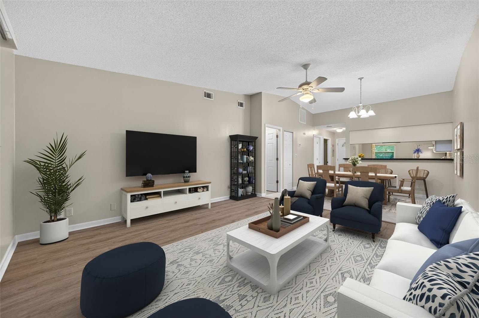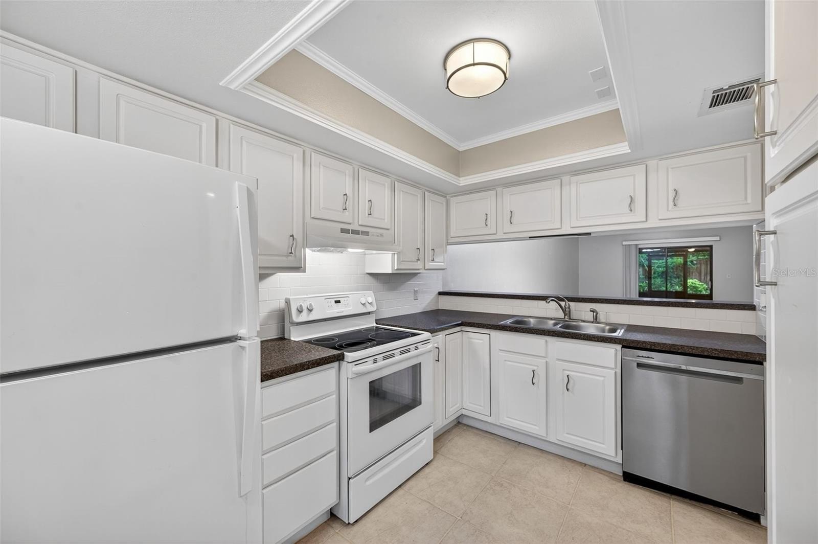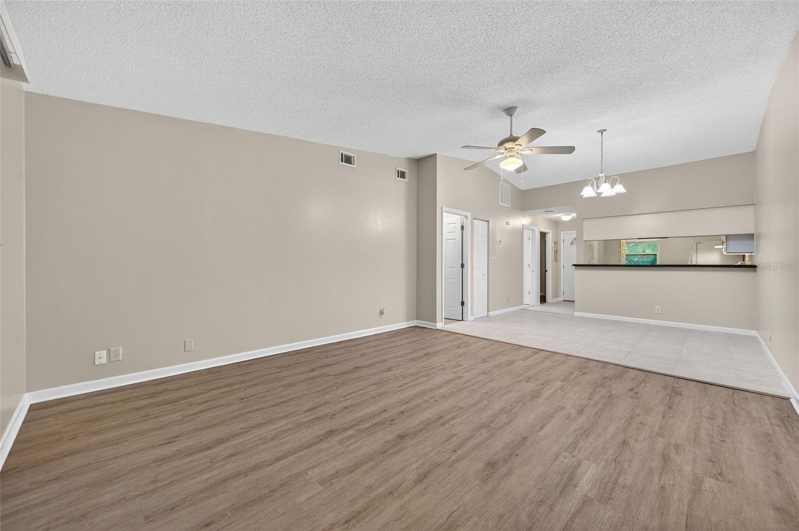 Step inside to find a spacious open-concept layout featuring tile and wood-style flooring, vaulted ceilings, and the perfect amount of light. The timeless kitchen boasts crisp white cabinetry with Corian counters, a full appliance package, and a pass-through window to the dining area, making entertaining easy and efficient. The adjoining living and dining space is perfect for gatherings or relaxing evenings, with sliding glass doors that lead out to a screened-in patio, perfect for enjoying the beautifully maintained garden.