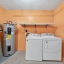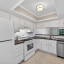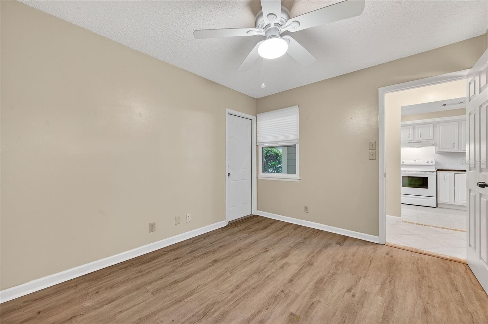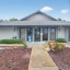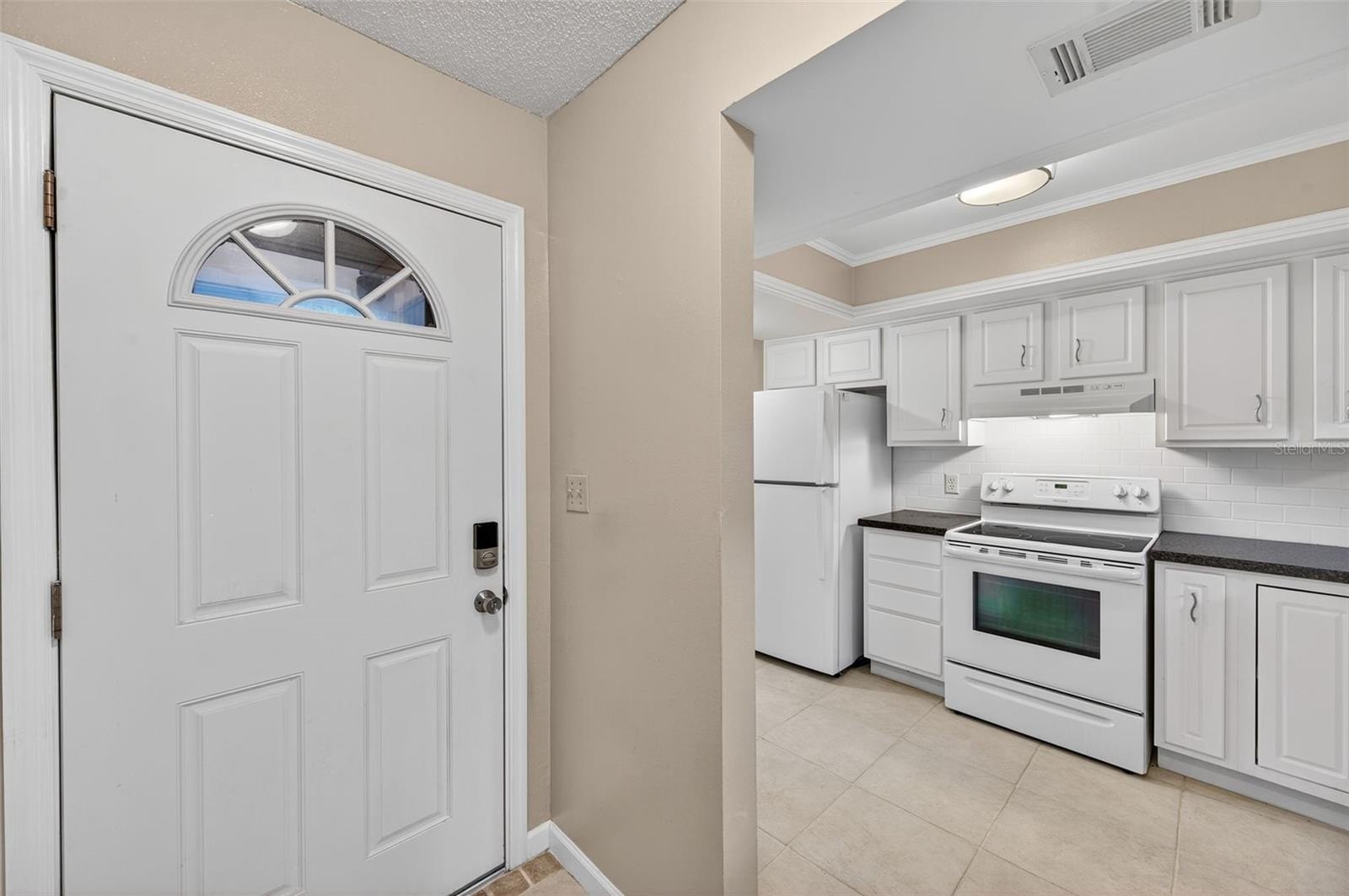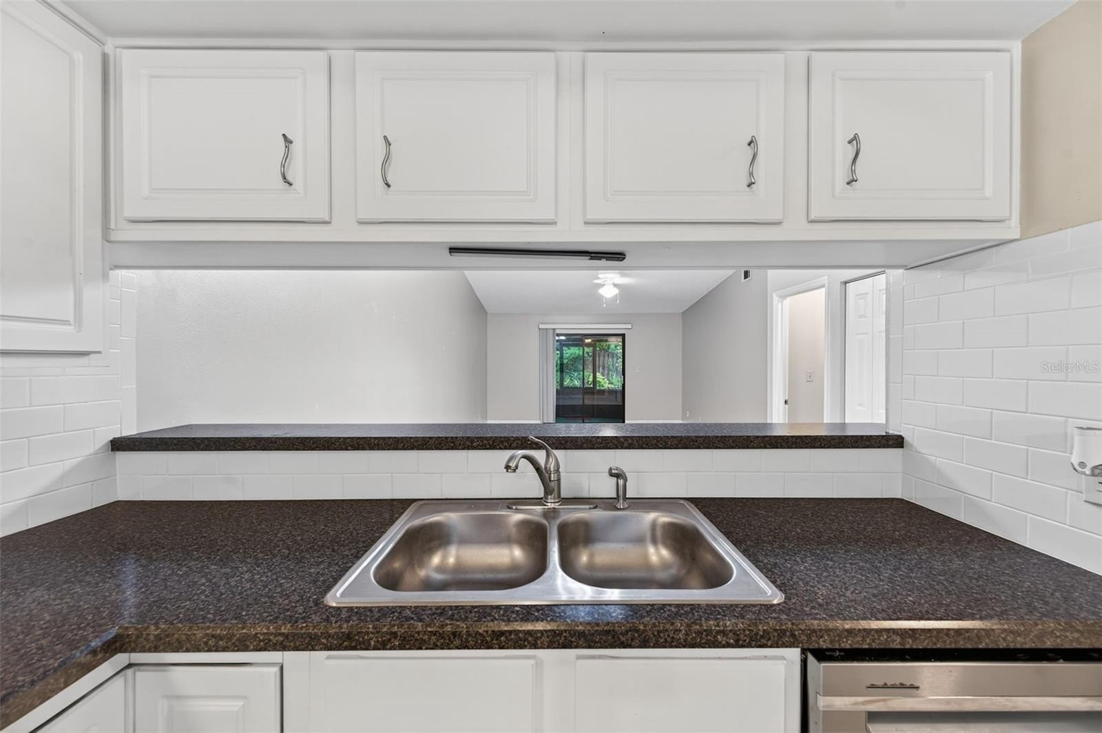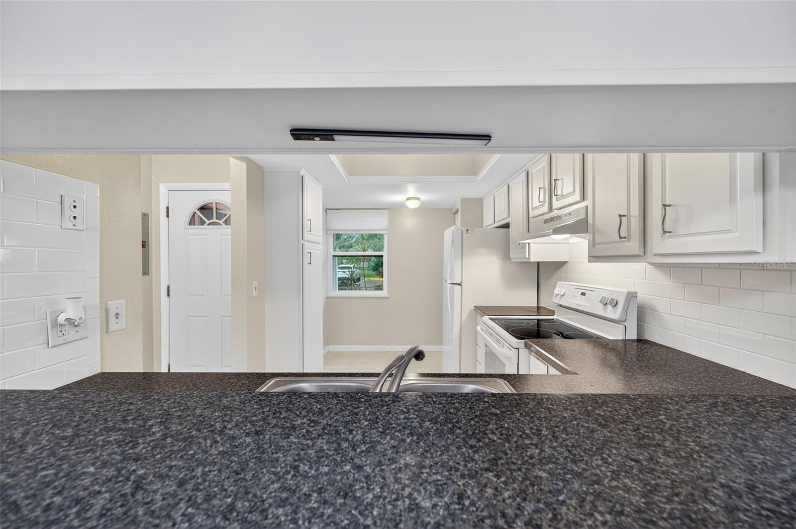 Step inside to find a spacious open-concept layout featuring tile and wood-style flooring, vaulted ceilings, and the perfect amount of light. The timeless kitchen boasts crisp white cabinetry with Corian counters, a full appliance package, and a pass-through window to the dining area, making entertaining easy and efficient. The adjoining living and dining space is perfect for gatherings or relaxing evenings, with sliding glass doors that lead out to a screened-in patio, perfect for enjoying the beautifully maintained garden.