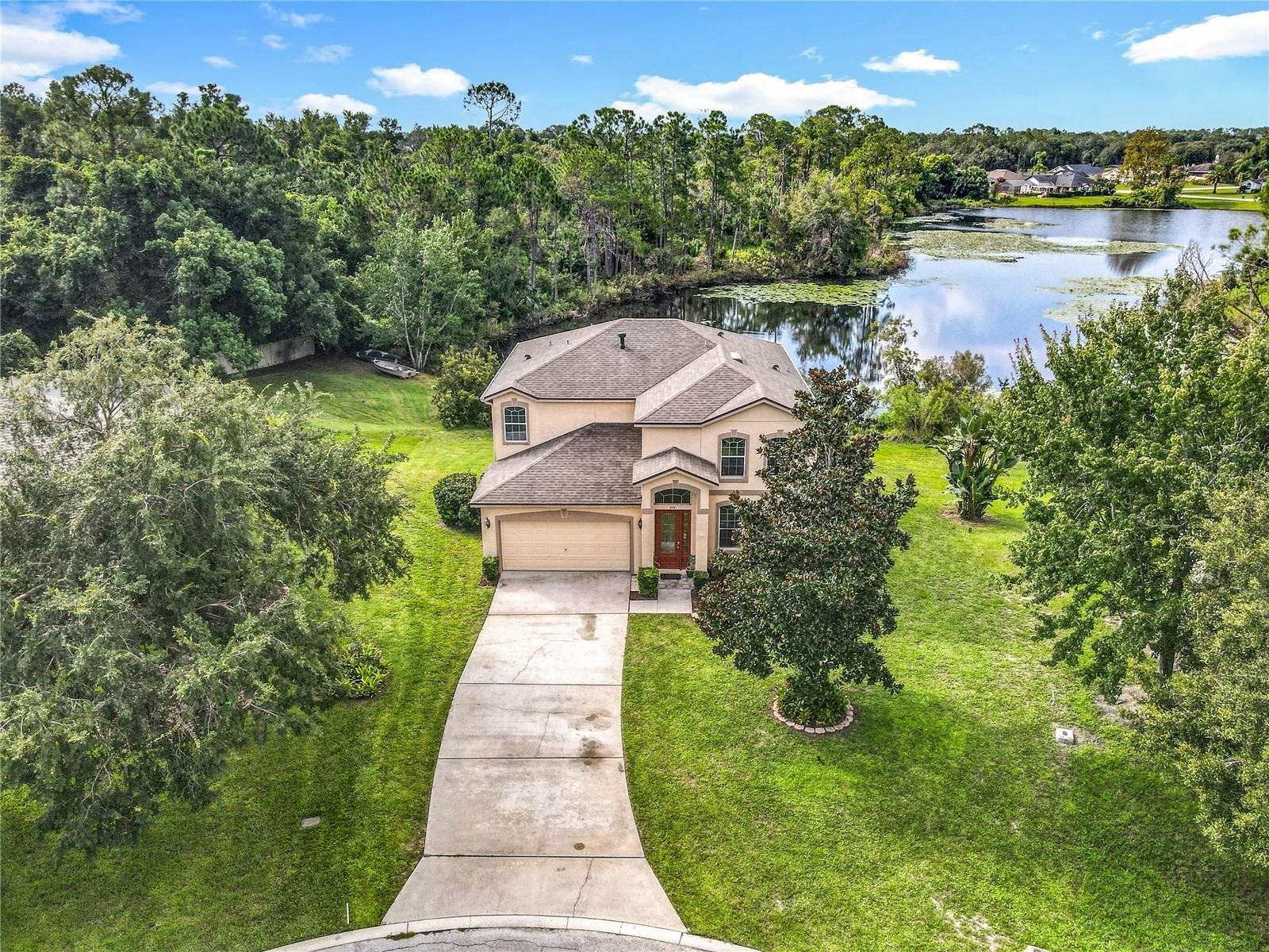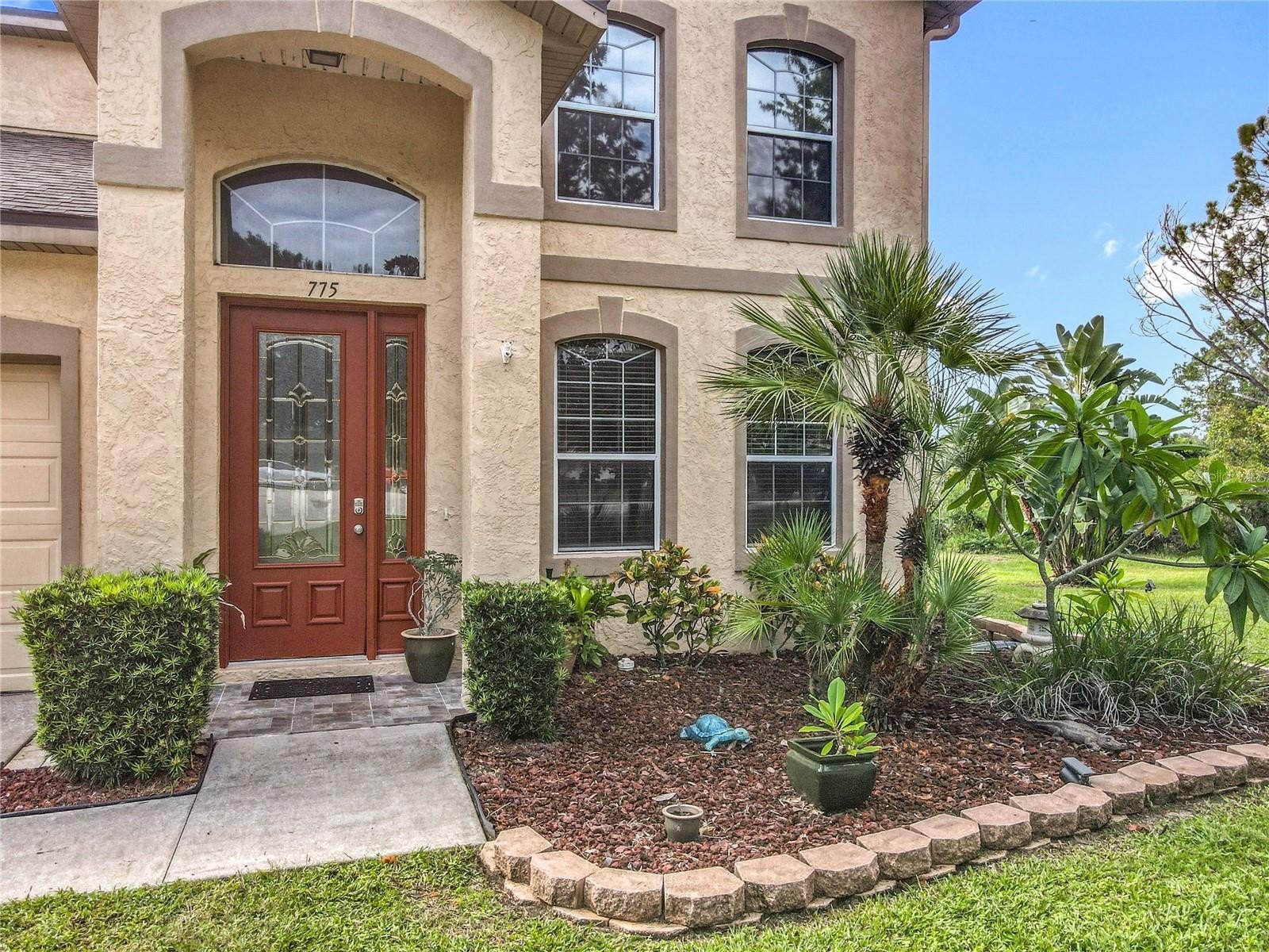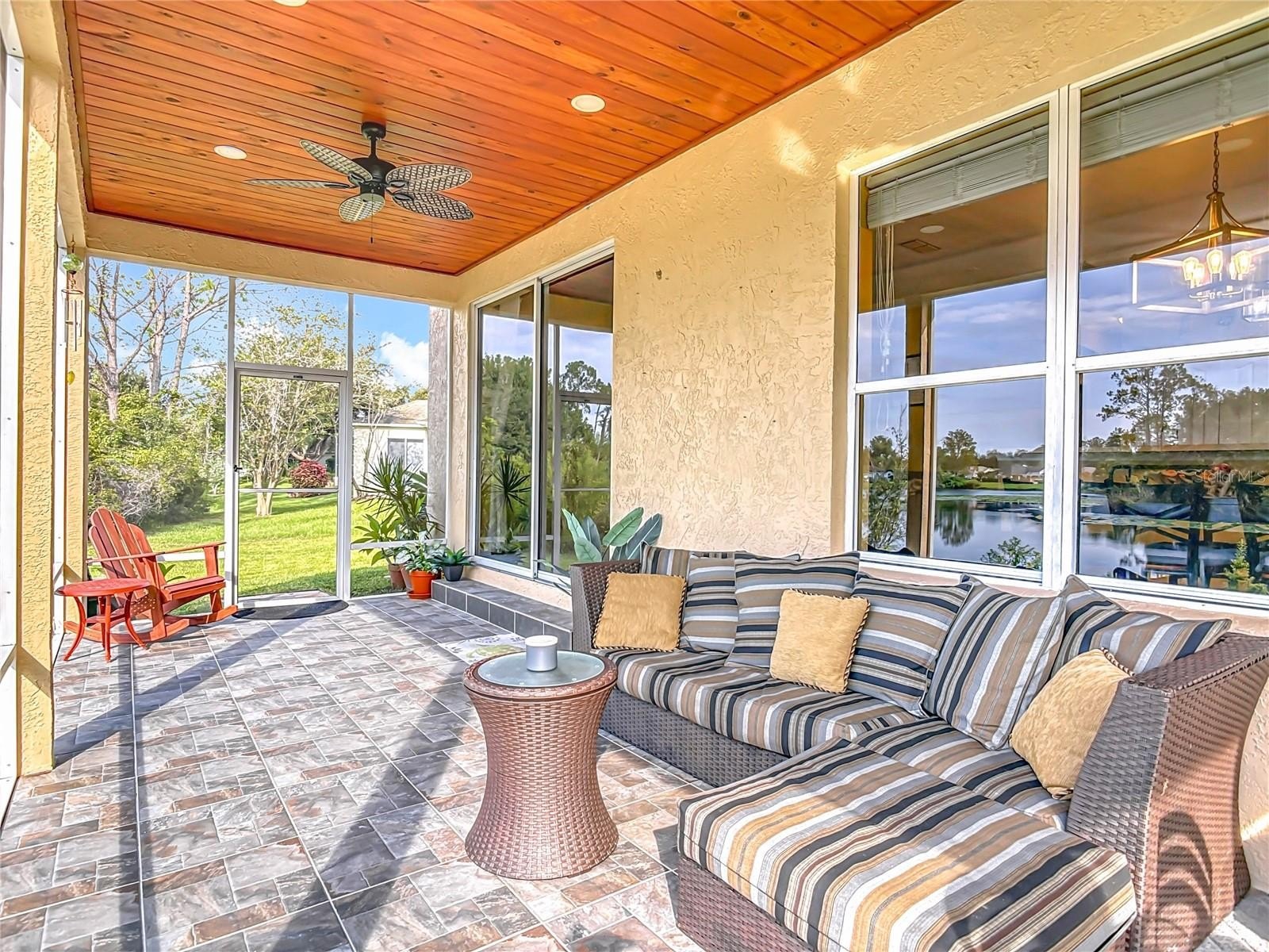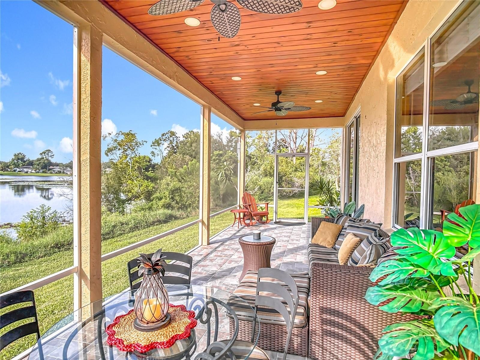 Lakefront Living – 4 Bedrooms + Office – Gated Community – Cul-de-Sac Lot tucked away on a quiet cul-de-sac in a gated neighborhood, this lakefront home offers incredible views and plenty of room to live and entertain. The large, landscaped lot provides wide side yards—perfect for everyone, pets, and outdoor fun. Step inside through the beautiful 8’ leaded-glass front door and into a bright living room with soaring 19’ ceilings and lots of windows. The main level features two separate living areas, a full bedroom and bath, a spacious kitchen and dining area, plus a private office/bonus room with elegant glass pocket doors. The heart of the home is the 540 SF open kitchen, family, and dining space. With a new gas range, dining bar, and direct access to the screened lanai, it’s an ideal gathering place. The lanai offers serene lake and nature preserve views, tile floors, ceiling fans, and a wood tongue-and-groove ceiling—true Florida living indoors and out.