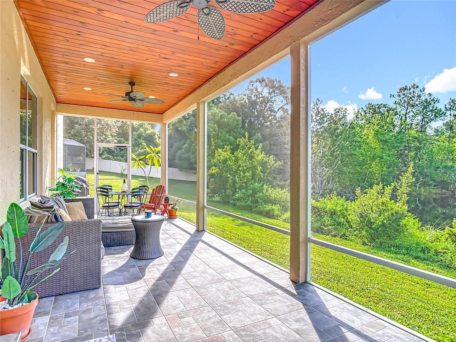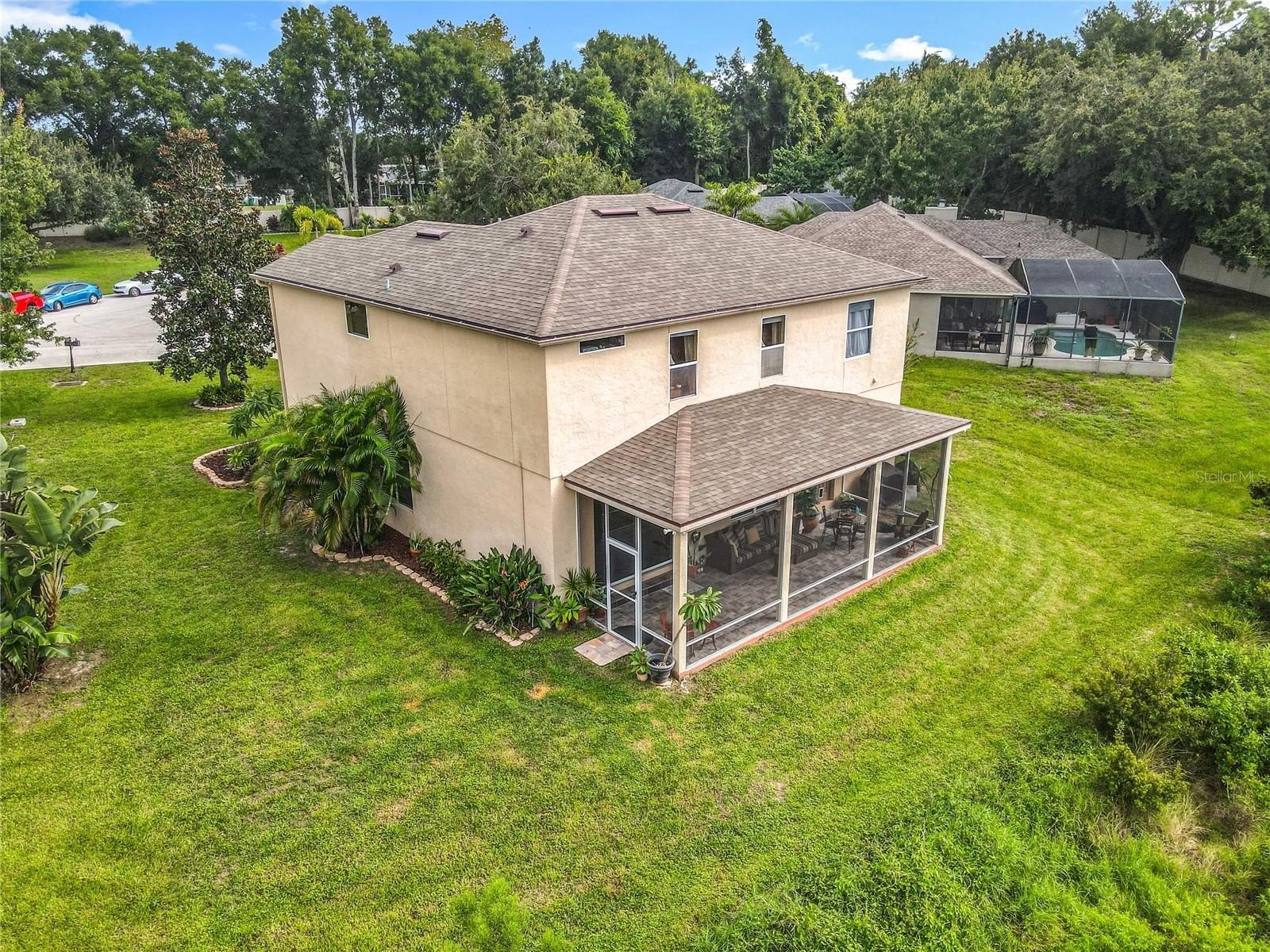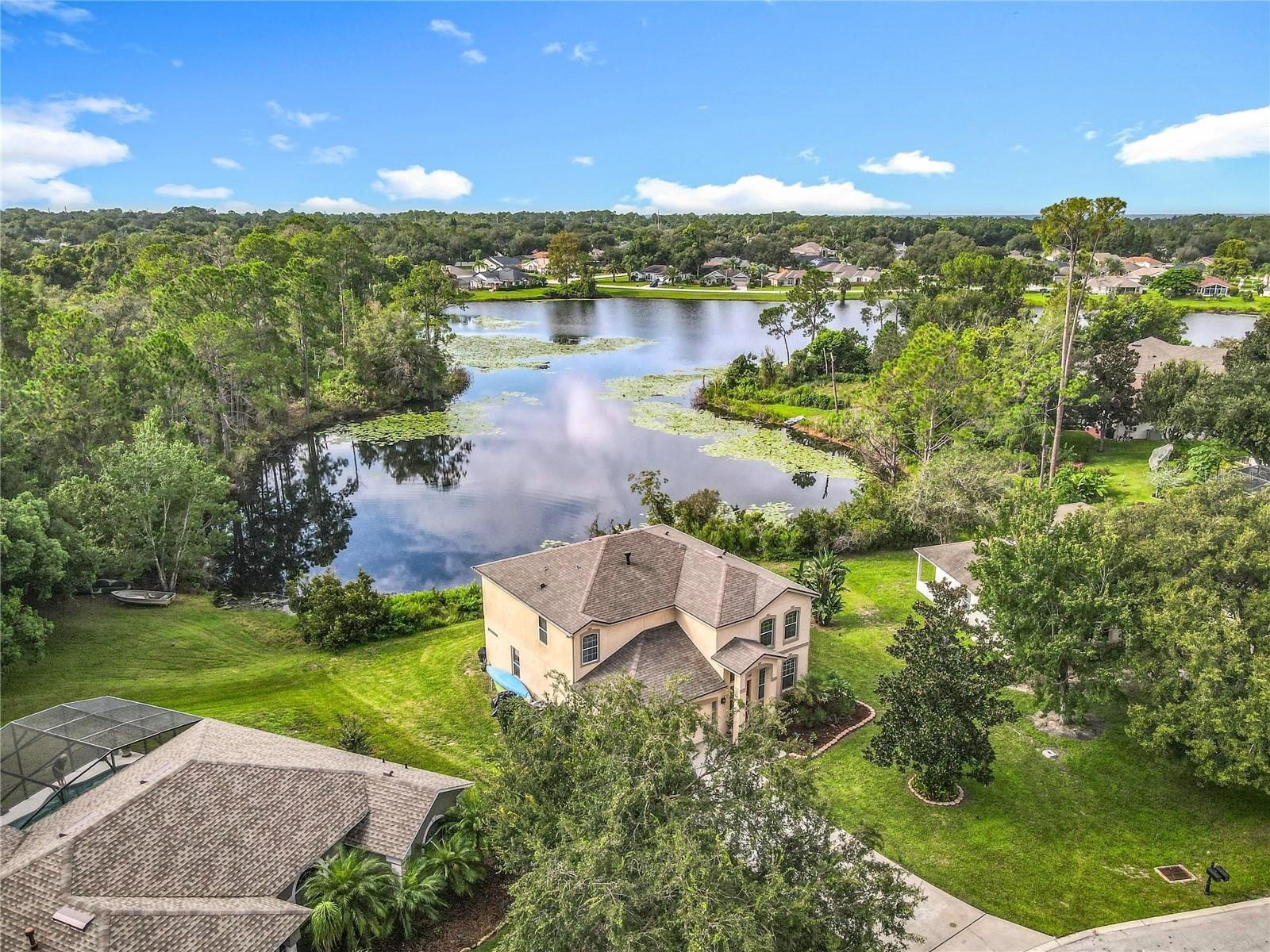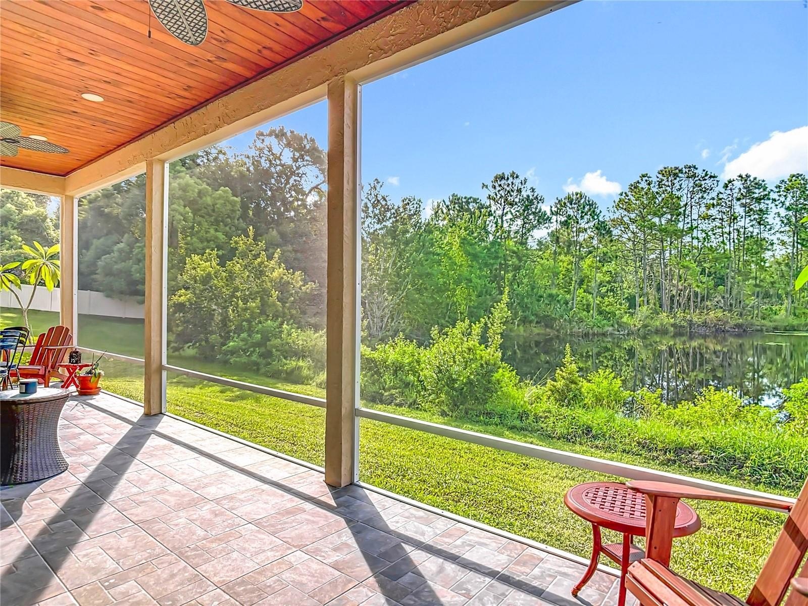 Lakefront Living – 4 Bedrooms + Office – Gated Community – Cul-de-Sac Lot tucked away on a quiet cul-de-sac in a gated neighborhood, this lakefront home offers incredible views and plenty of room to live and entertain. The large, landscaped lot provides wide side yards—perfect for everyone, pets, and outdoor fun. Step inside through the beautiful 8’ leaded-glass front door and into a bright living room with soaring 19’ ceilings and lots of windows. The main level features two separate living areas, a full bedroom and bath, a spacious kitchen and dining area, plus a private office/bonus room with elegant glass pocket doors. The heart of the home is the 540 SF open kitchen, family, and dining space. With a new gas range, dining bar, and direct access to the screened lanai, it’s an ideal gathering place. The lanai offers serene lake and nature preserve views, tile floors, ceiling fans, and a wood tongue-and-groove ceiling—true Florida living indoors and out.