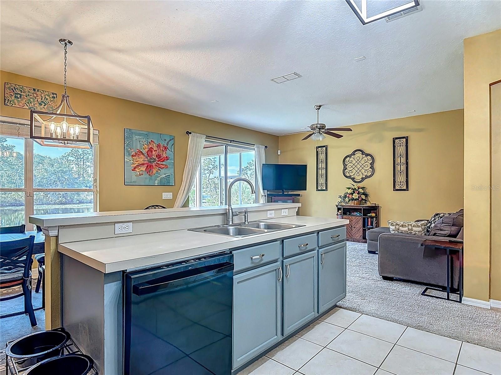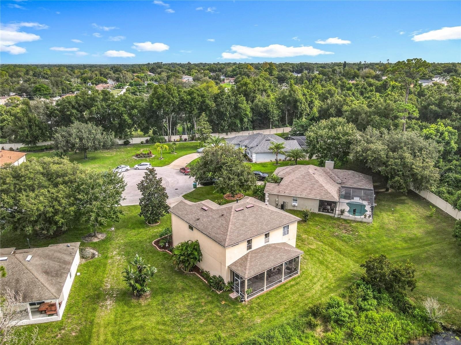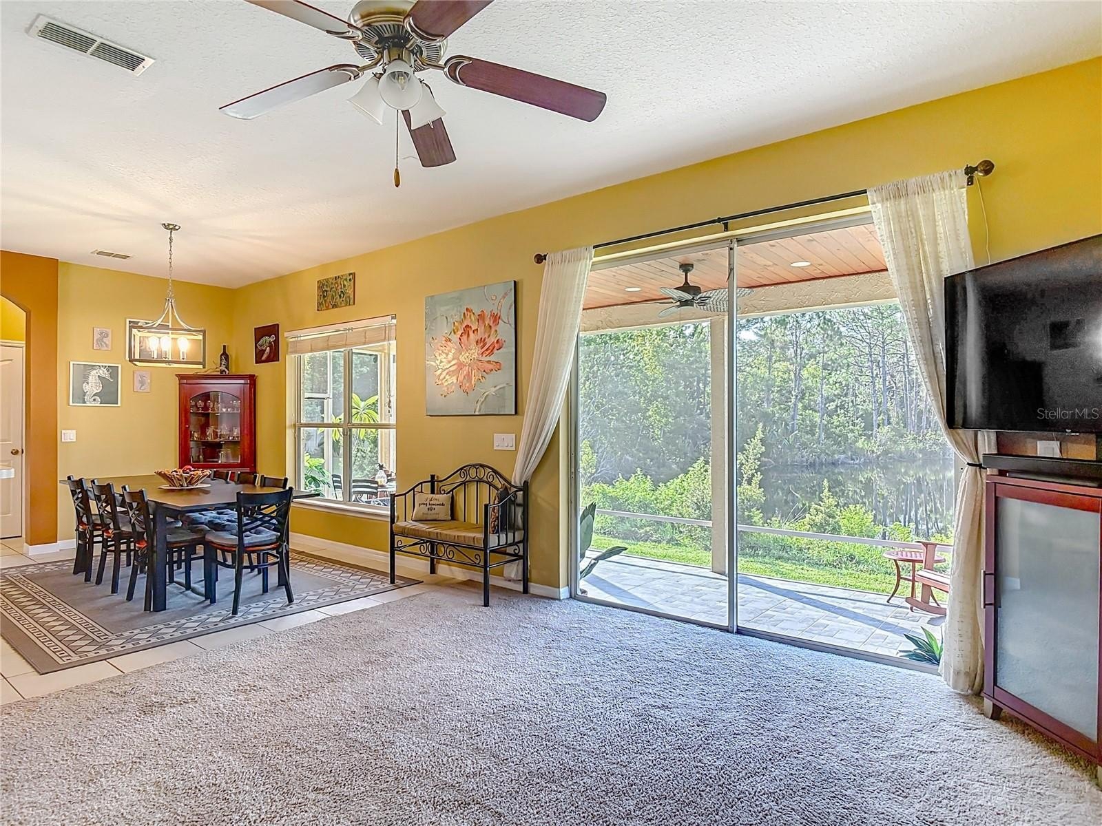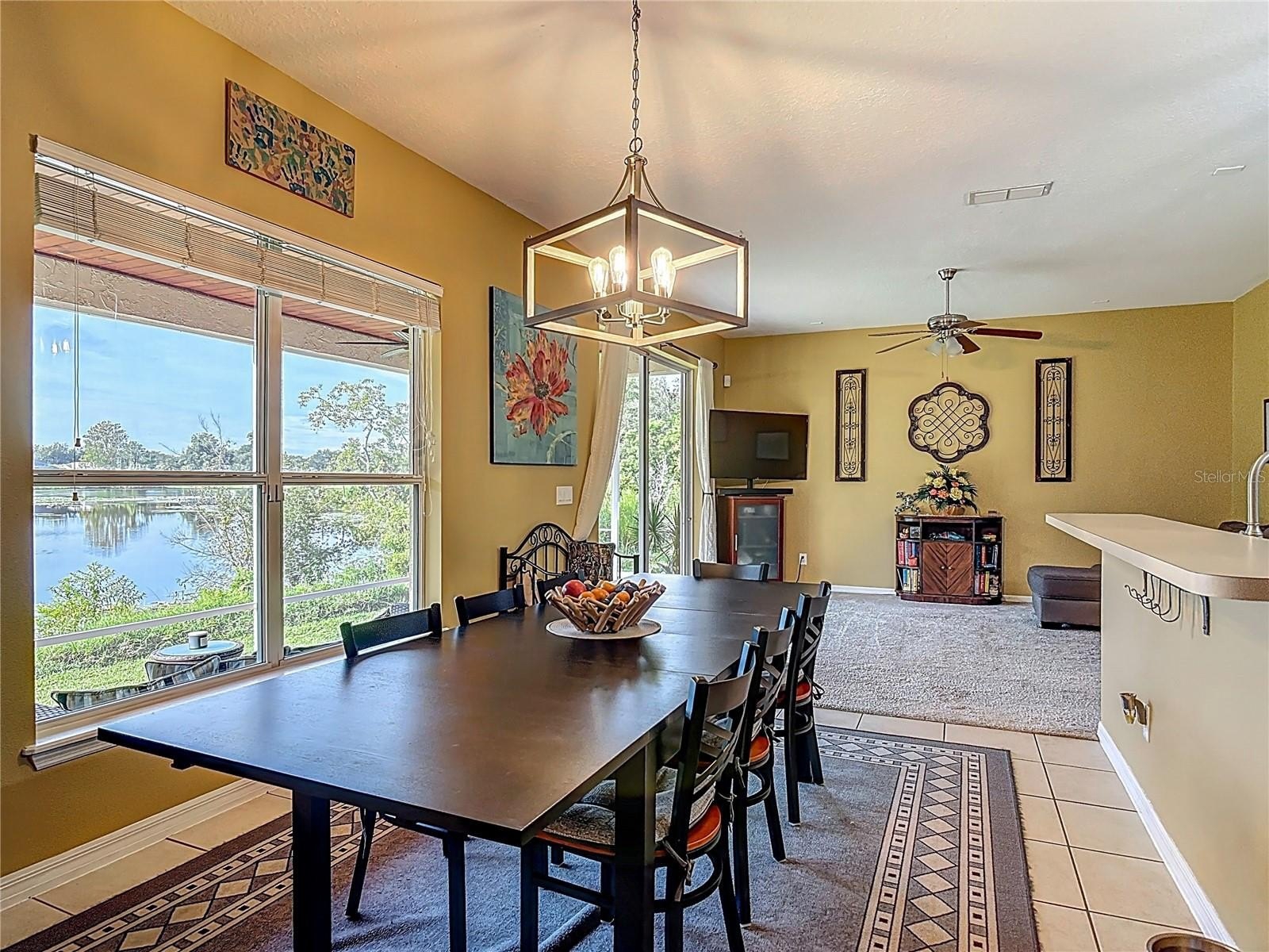 Lakefront Living – 4 Bedrooms + Office – Gated Community – Cul-de-Sac Lot tucked away on a quiet cul-de-sac in a gated neighborhood, this lakefront home offers incredible views and plenty of room to live and entertain. The large, landscaped lot provides wide side yards—perfect for everyone, pets, and outdoor fun. Step inside through the beautiful 8’ leaded-glass front door and into a bright living room with soaring 19’ ceilings and lots of windows. The main level features two separate living areas, a full bedroom and bath, a spacious kitchen and dining area, plus a private office/bonus room with elegant glass pocket doors. The heart of the home is the 540 SF open kitchen, family, and dining space. With a new gas range, dining bar, and direct access to the screened lanai, it’s an ideal gathering place. The lanai offers serene lake and nature preserve views, tile floors, ceiling fans, and a wood tongue-and-groove ceiling—true Florida living indoors and out.