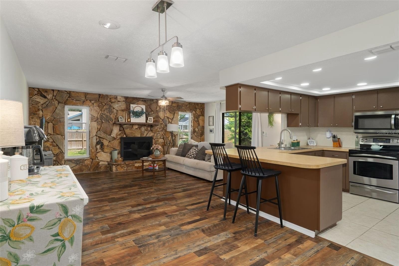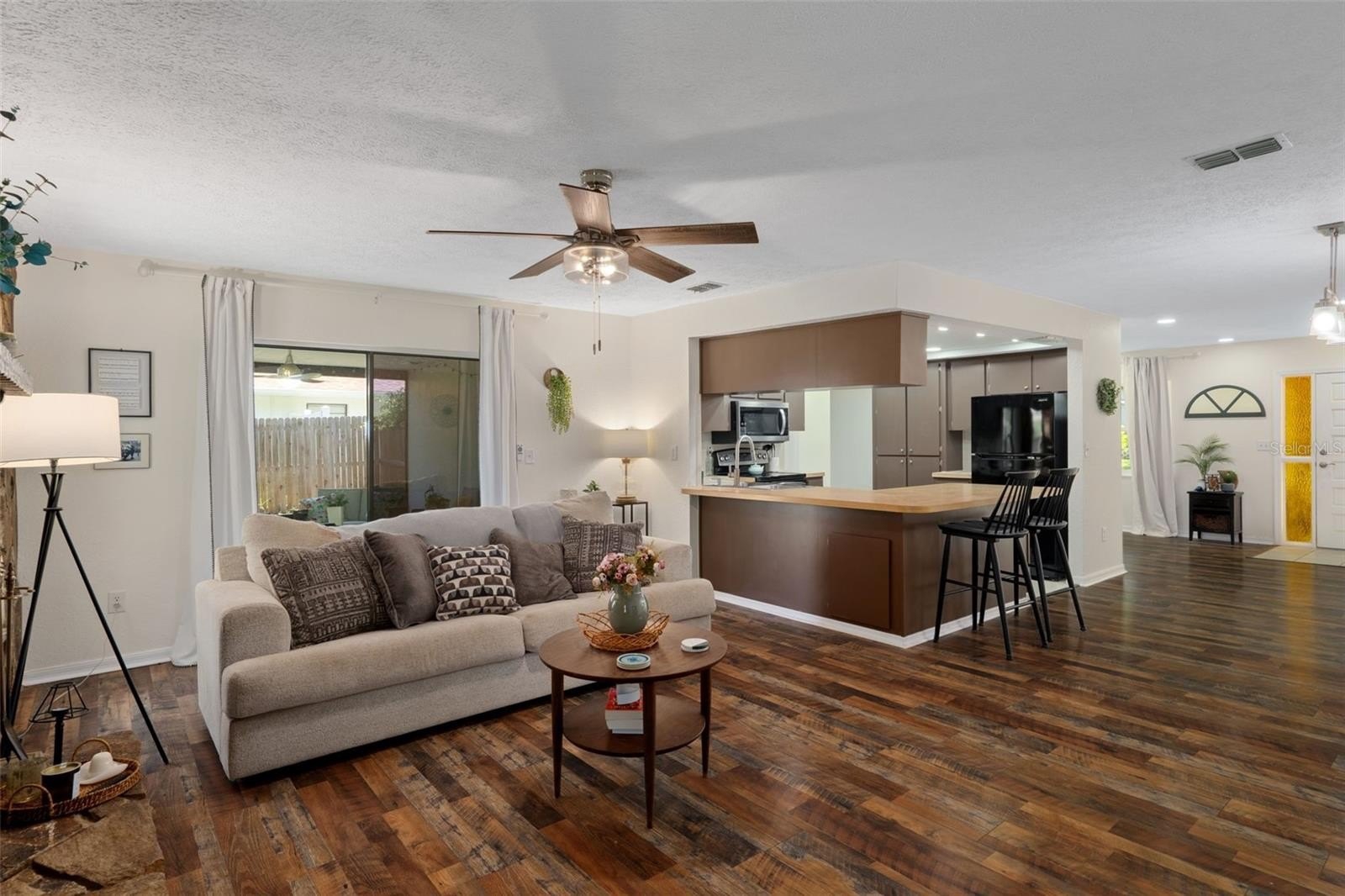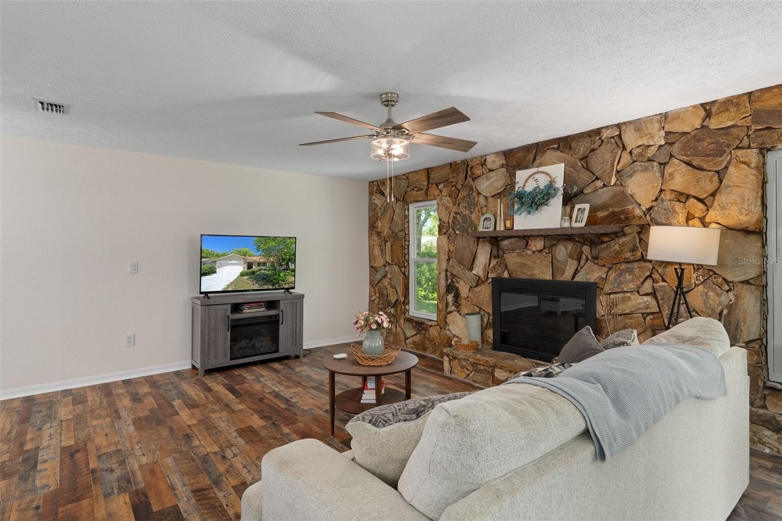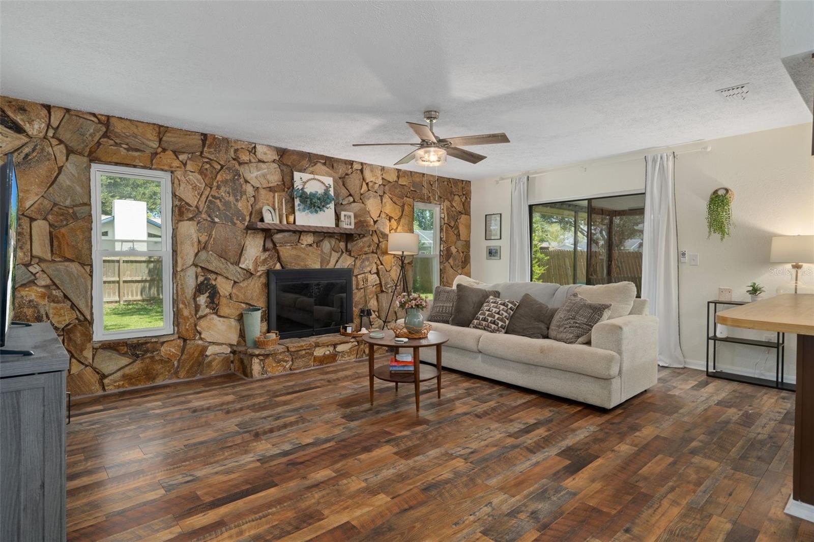 Come explore this charming home in the highly sought-after community of Lakeside Woodlands. Boasting 2 spacious bedrooms, 2 full bathrooms, and a 2-car garage, this home offers nearly 1,600 sq/ft of comfortable living space. ROOF (2019) Freshly painted inside and out (2023) As you step inside, you'll be greeted by beautiful vinyl flooring and a formal dining area that’s perfect for entertaining. The open-concept kitchen flows seamlessly into the large living room, where a striking fireplace creates a warm and inviting ambiance. The thoughtful split-bedroom layout ensures privacy. The guest bathroom has been completely remodeled with brand new tile, tub, vanity, lighting, and more! The master bedroom is spacious with a big Walk in Closet. Inside laundry room. Step outside to enjoy the expansive screened-in patio that overlooks the impressive, fully fenced backyard—ideal for gatherings, relaxation or those fur babies! Close to shopping, restaurants, and entertainment. Don't miss the chance to see this incredible home—schedule your tour today!