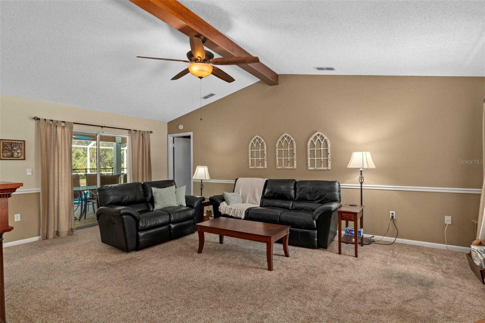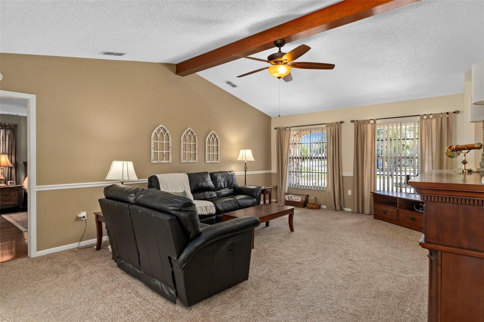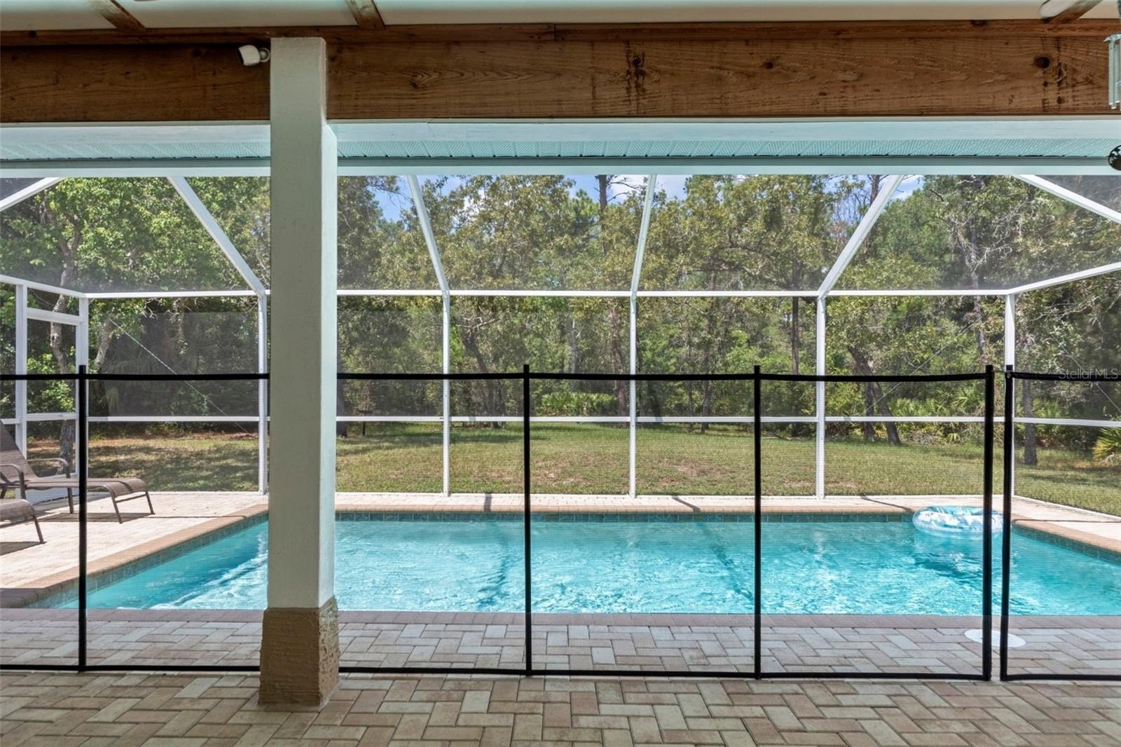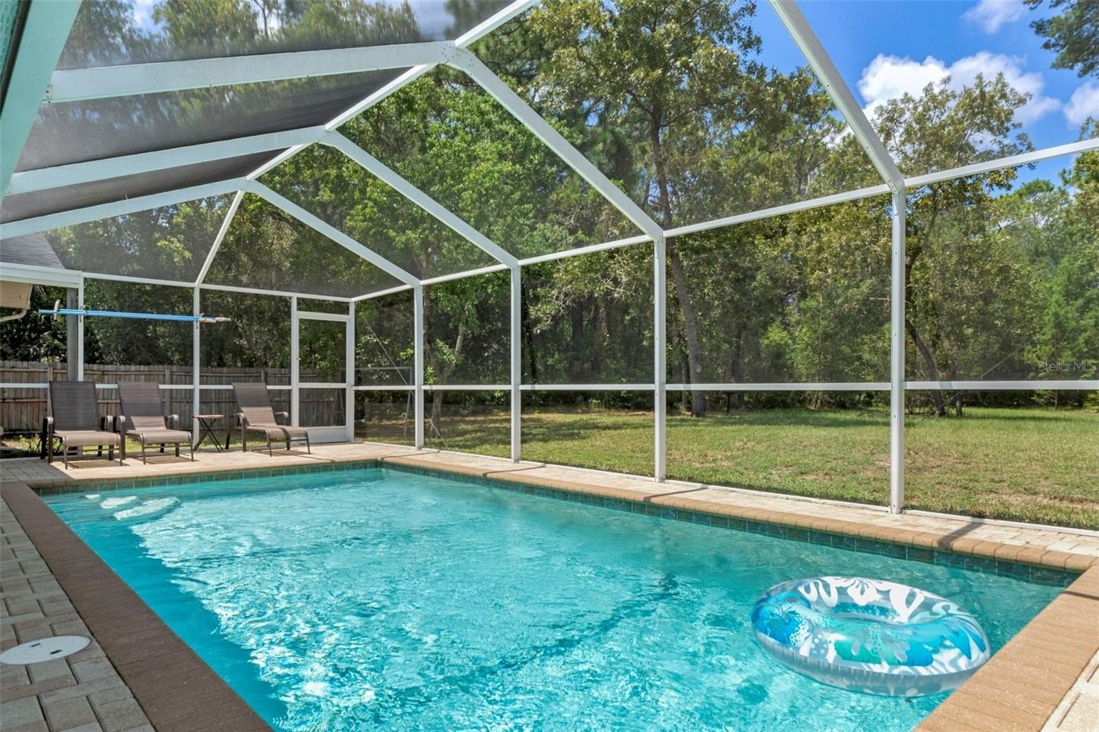 Step inside to the foyer leading into the spacious 21x14 living room, featuring a cathedral ceiling with real wood beams, fresh carpeting, chair rail accents, and pocket sliders opening to the rear lanai. The dining area boasts bay windows and additional sliders for seamless indoor-outdoor living, while the thoughtfully designed galley kitchen includes abundant cabinetry—some with glass fronts, and a 9-foot breakfast bar. A large inside laundry room features extra storage and a laundry tub.The primary suite is a true retreat, complete with crown molding, private lanai access, a 9x7 walk-in closet, and an en-suite bath with a tub/shower combo. Two oversized guest bedrooms (14x13 and 16x13) share a well-appointed guest bath with a tiled shower and abundant vanity space. Updated hardware throughout the home adds a modern touch.Step outside to enjoy Florida living at its best! Relax under the 26x11 covered lanai with pavers, or into the sparkling 24x12 saltwater pool with child safety fence, all under a 24x17 screened enclosure. The expansive backyard offers partial fencing, mature landscaping, and no build behind—preserving your privacy and the natural Nature Coast feel. Additional highlights include a side-entry screened 2-car garage with extra parking pad, an 8x10 detached storage shed, whole-home surge protection, and a transferable pest control contract.Conveniently located near schools, shopping, and all the charm Weeki Wachee has to offer, this home blends comfort, updates, and character in one perfect package. Don’t miss your chance to call this retreat your own!
