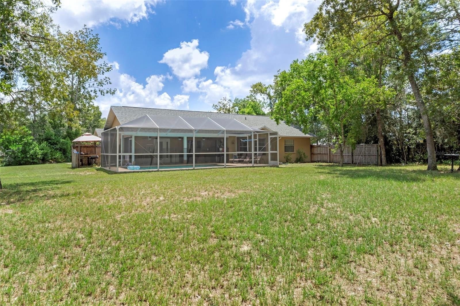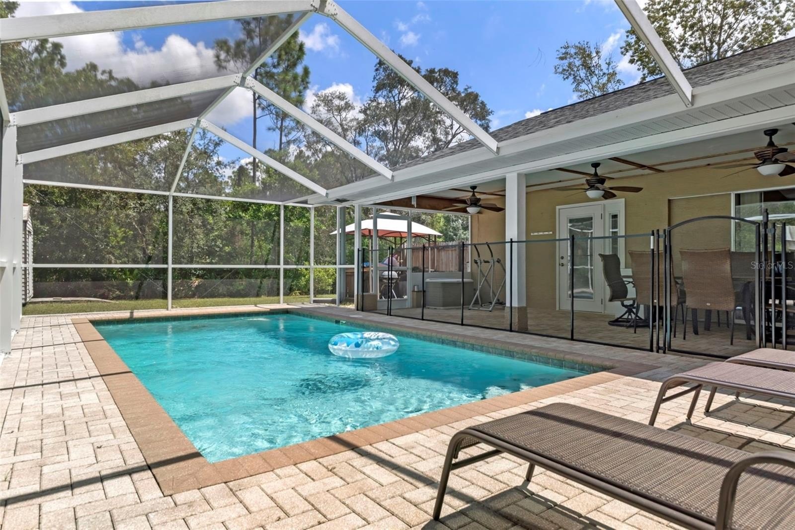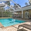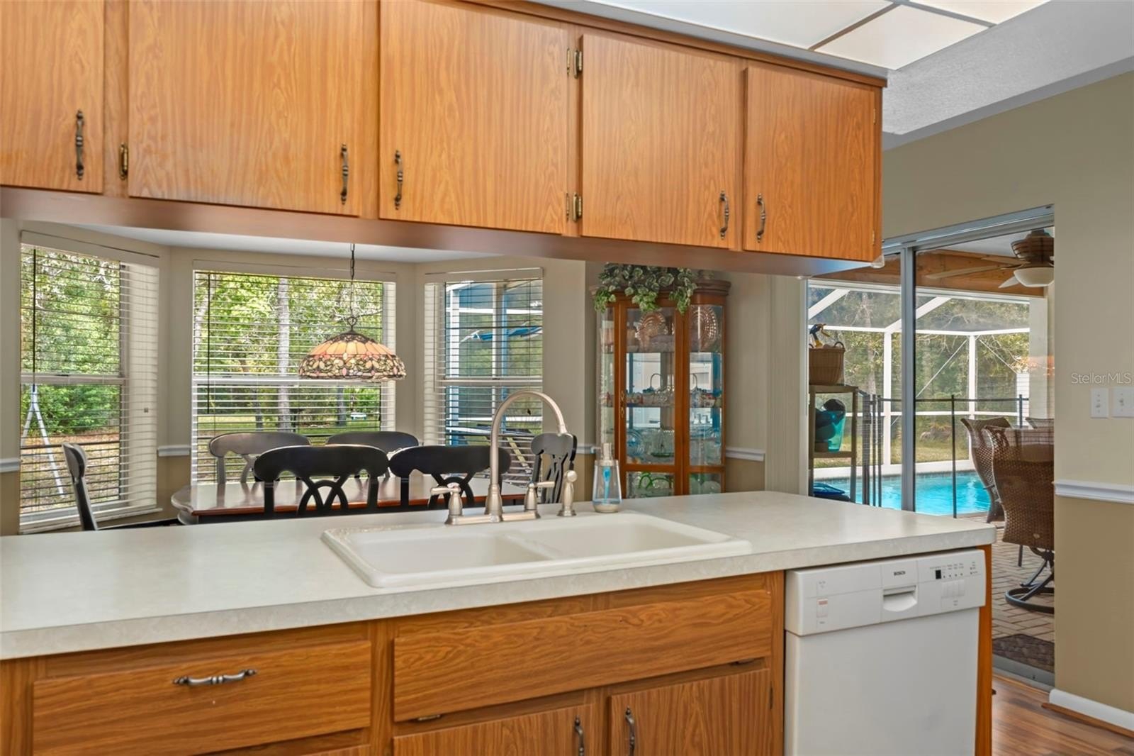 Step inside to the foyer leading into the spacious 21x14 living room, featuring a cathedral ceiling with real wood beams, fresh carpeting, chair rail accents, and pocket sliders opening to the rear lanai. The dining area boasts bay windows and additional sliders for seamless indoor-outdoor living, while the thoughtfully designed galley kitchen includes abundant cabinetry—some with glass fronts, and a 9-foot breakfast bar. A large inside laundry room features extra storage and a laundry tub.The primary suite is a true retreat, complete with crown molding, private lanai access, a 9x7 walk-in closet, and an en-suite bath with a tub/shower combo. Two oversized guest bedrooms (14x13 and 16x13) share a well-appointed guest bath with a tiled shower and abundant vanity space. Updated hardware throughout the home adds a modern touch.Step outside to enjoy Florida living at its best! Relax under the 26x11 covered lanai with pavers, or into the sparkling 24x12 saltwater pool with child safety fence, all under a 24x17 screened enclosure. The expansive backyard offers partial fencing, mature landscaping, and no build behind—preserving your privacy and the natural Nature Coast feel. Additional highlights include a side-entry screened 2-car garage with extra parking pad, an 8x10 detached storage shed, whole-home surge protection, and a transferable pest control contract.Conveniently located near schools, shopping, and all the charm Weeki Wachee has to offer, this home blends comfort, updates, and character in one perfect package. Don’t miss your chance to call this retreat your own!