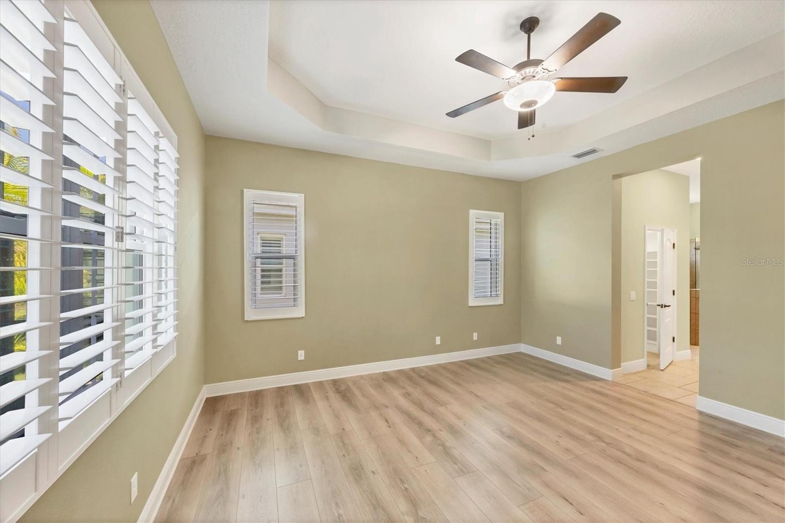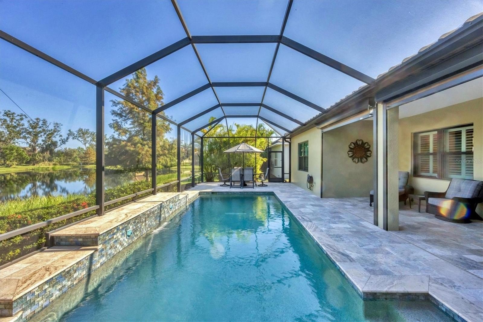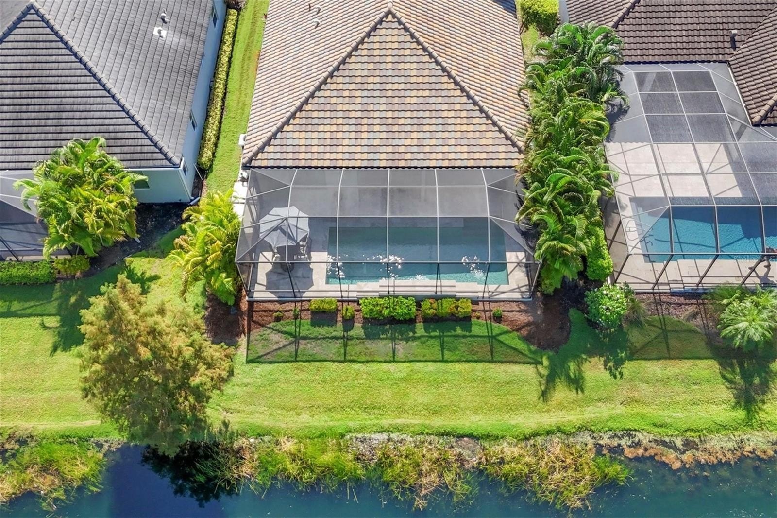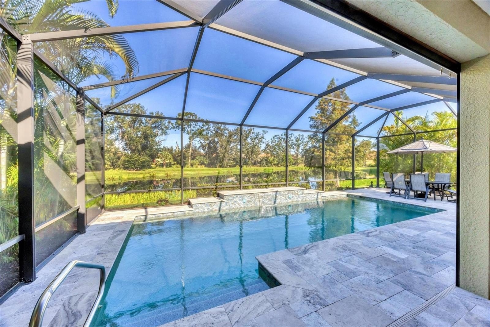 NO CDD fee for this home! This one of a kind ''Bright Meadows'' floorplan with heated pool boasts 3 bedrooms all containing generous sized walk-in closets with custom cabinetry, 2 full bathrooms, a large study/den, extended screened lanai, 3-car garage with epoxy flooring and overhead storage! This home is situated on a premium lake view with conservation area beyond the shimmering lake. With fresh exterior paint AND professionally installed landscaping, this house has it all! Rest assured your new home is built strong and safe with its HURRICANE IMPACT rated windows, motorized HURRICANE shades, block construction, concrete tile roof and is located in the desirable ''X'' floodzone! Throughout the home you will find plantation shutters for all windows, 5 1/4" deco baseboards, LED recessed lighting, BRAND NEW 16-seer rated TRANE HVAC, premium ceramic tile and much more! The kitchen boasts a large Island with breakfast bar, 4-burner natural gas stove, stainless steel appliances, and LED lighting underneath the premium cabinets that compliment the high level granite countertops. The great room with its expansive tray ceiling showcases a spacious environment with more than enough room to entertain guests. Open the large three paneled sliders and be amazed at not only the amount of room the extended lanai provides but your peaceful, mesmerizing lake AND conservation view. The upgraded travertine flooring complements the oversized 30' heated pool with water feature your new backyard oasis provides. Indigo is an active community that features a full time on-site manager as well as a full time activities director that manages an extensive calendar of activities for all ages. A-Rated Gullett Elementary AND Mona Jain Middle School are right outside our gates too! You can also expect sidewalks on both sides of the street, resort style heated community pool/spa at the clubhouse where you will find 5 cabanas with an abundance of seating, 4 pickleball courts, 2 bocce ball courts, 24-hour exercise gym, meeting room/banquet room and playground. Indigo is not only a community that takes care of all ground maintenance to include mowing, fertilizing, irrigation and shrubs but is right around the corner to a plethora of dining, banking, entertainment, public transportation and MORE!