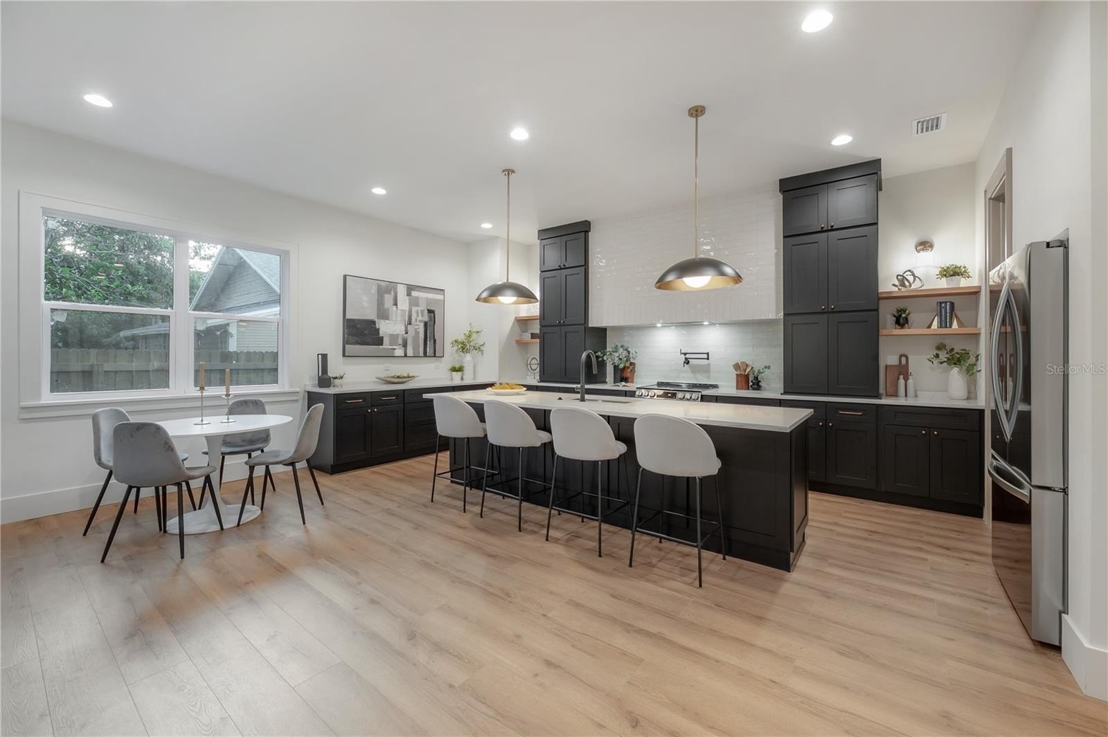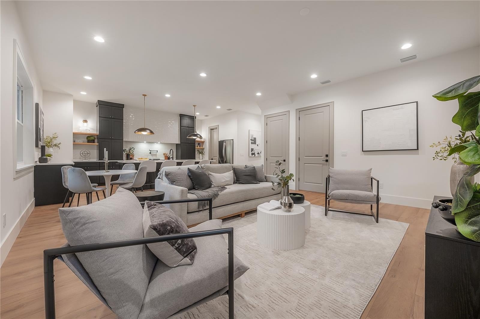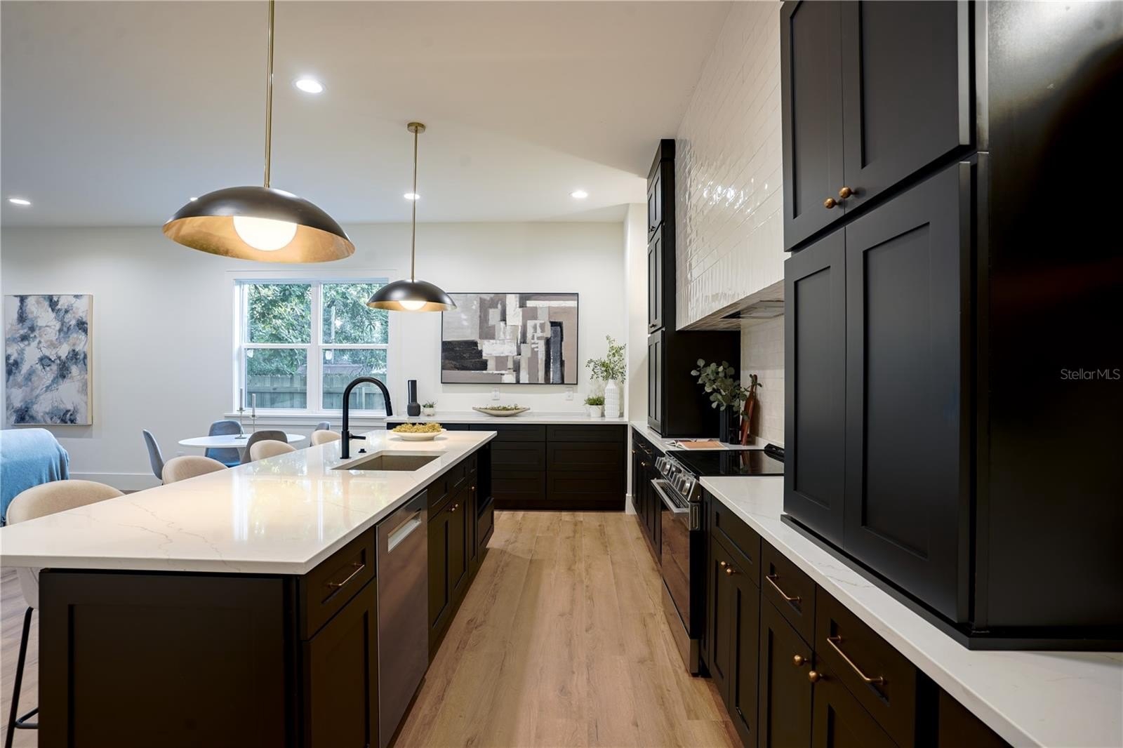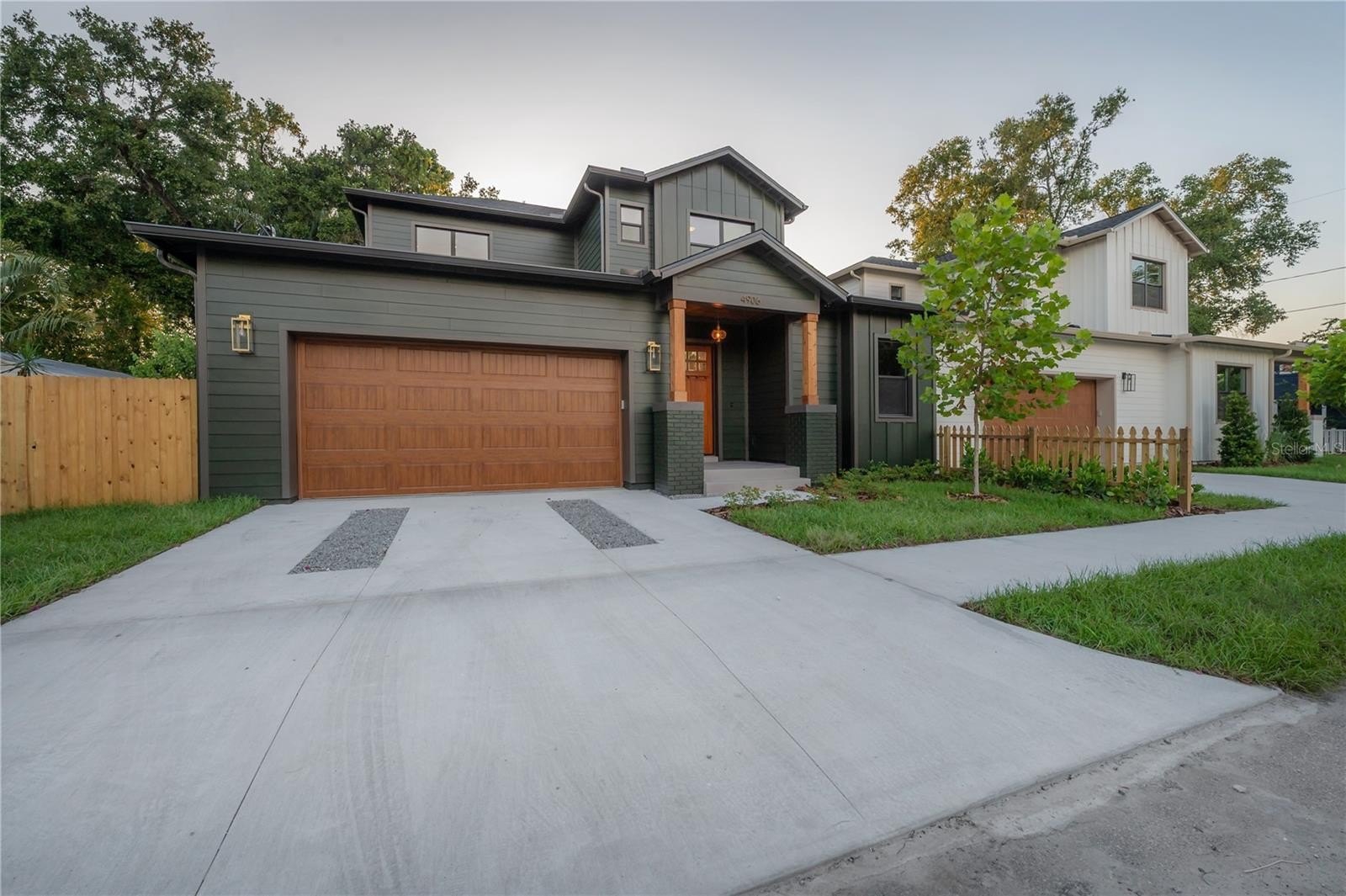 Located on a corner lot in Southeast Seminole Heights, this is the only home of its kind in the neighborhood—a semi detached single-family residence that feels private and spacious. Inside, you’ll find four bedrooms, three bathrooms, and more than 2,100 square feet of living space filled with thoughtful details like soaring 10-foot ceilings, 8-foot solid-core doors, custom tile accents, and high end designer lighting throughout. The chef’s kitchen is the heart of the home, offering white quartz countertops on an oversized island, large pantry, an upgraded appliance package, and a dramatic, tiled custom vent hood that is surrounded by sleek black storage towers with brass accents. The downstairs living areas are open and spacious, and also offers a full bathroom and bedroom (perfect for a home office). The upstairs layout offers a laundry room conveniently located between the bedrooms; 2 guest bedrooms with reach-in closets and a full bathroom, as well as a spacious primary suite. The primary bedroom include dual walk-in closets, and the most luxurious and tastefully designed en suite bathroom with pearl-finished vertical tiles, glass enclosed shower, green and polished brass accents, and a separate water closet. A rare attached two-car garage adds convenience, while the fully fenced backyard with a covered porch provides the perfect outdoor space for entertaining, relaxing, or enjoying the Florida sunshine.