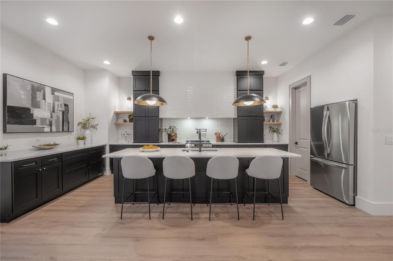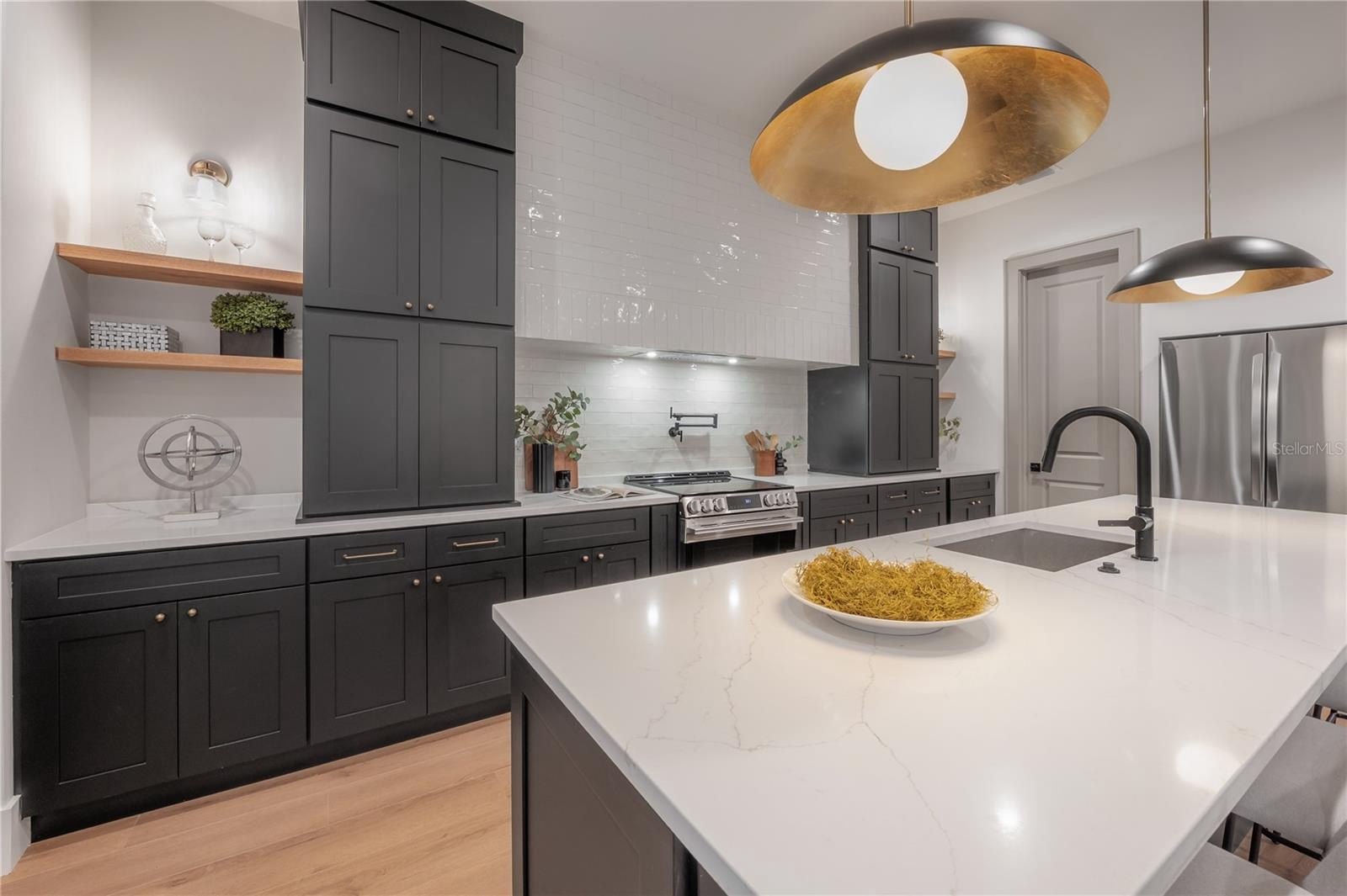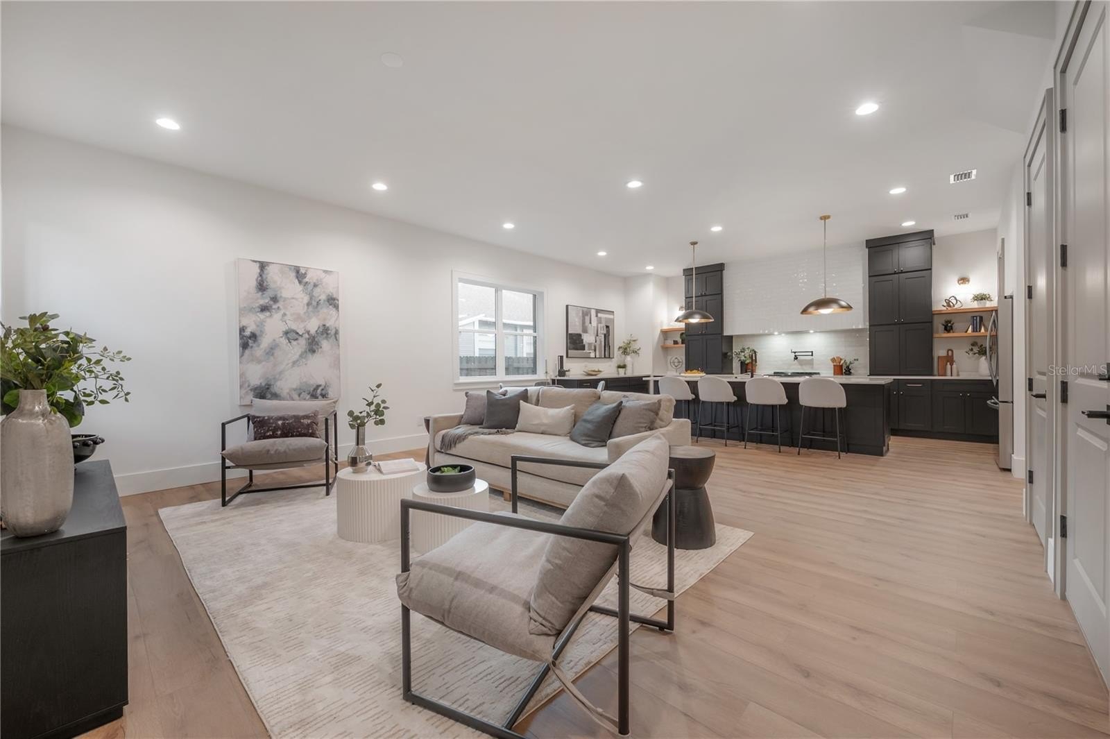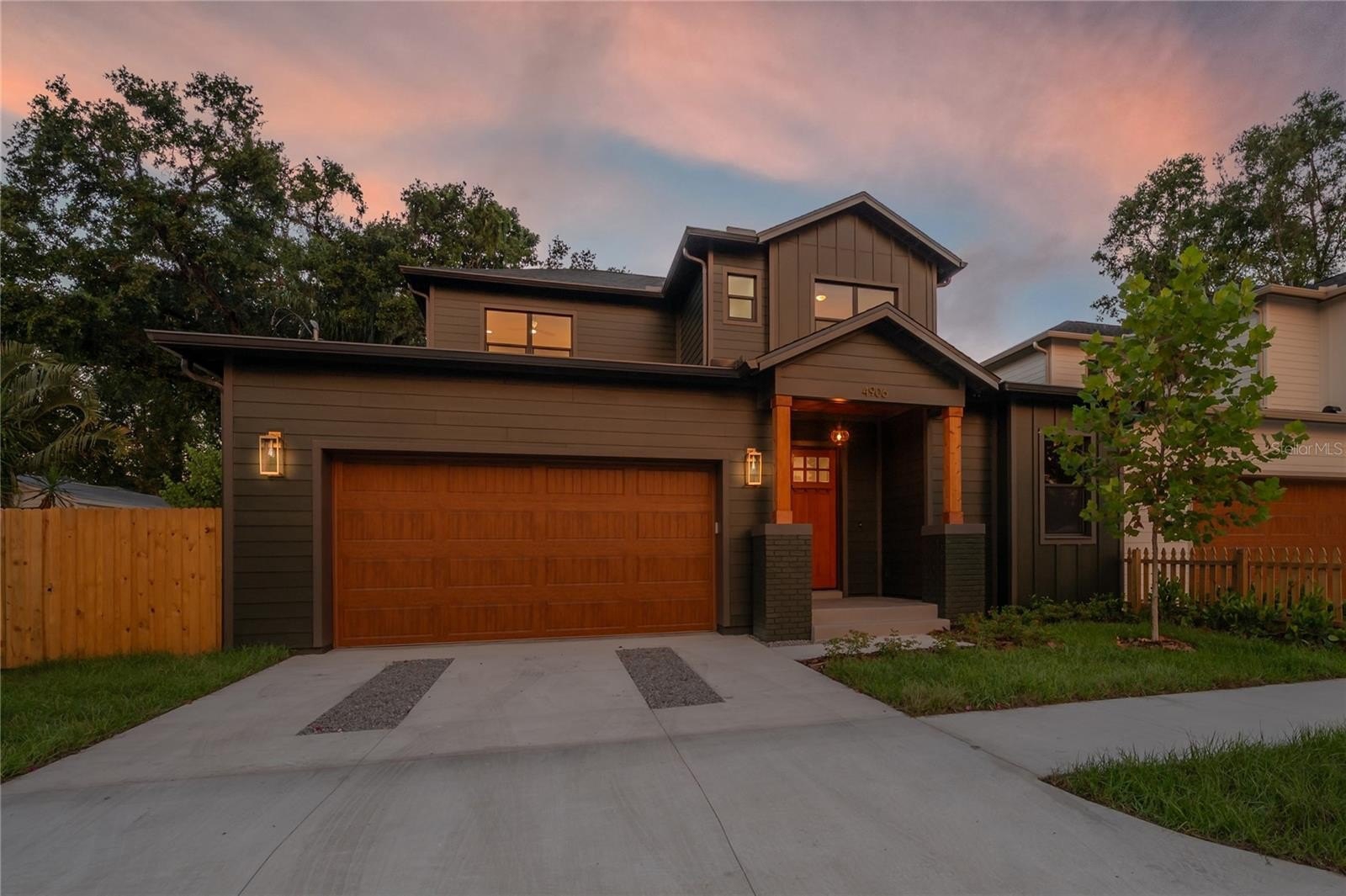 Located on a corner lot in Southeast Seminole Heights, this is the only home of its kind in the neighborhood—a semi detached single-family residence that feels private and spacious. Inside, you’ll find four bedrooms, three bathrooms, and more than 2,100 square feet of living space filled with thoughtful details like soaring 10-foot ceilings, 8-foot solid-core doors, custom tile accents, and high end designer lighting throughout. The chef’s kitchen is the heart of the home, offering white quartz countertops on an oversized island, large pantry, an upgraded appliance package, and a dramatic, tiled custom vent hood that is surrounded by sleek black storage towers with brass accents. The downstairs living areas are open and spacious, and also offers a full bathroom and bedroom (perfect for a home office). The upstairs layout offers a laundry room conveniently located between the bedrooms; 2 guest bedrooms with reach-in closets and a full bathroom, as well as a spacious primary suite. The primary bedroom include dual walk-in closets, and the most luxurious and tastefully designed en suite bathroom with pearl-finished vertical tiles, glass enclosed shower, green and polished brass accents, and a separate water closet. A rare attached two-car garage adds convenience, while the fully fenced backyard with a covered porch provides the perfect outdoor space for entertaining, relaxing, or enjoying the Florida sunshine.