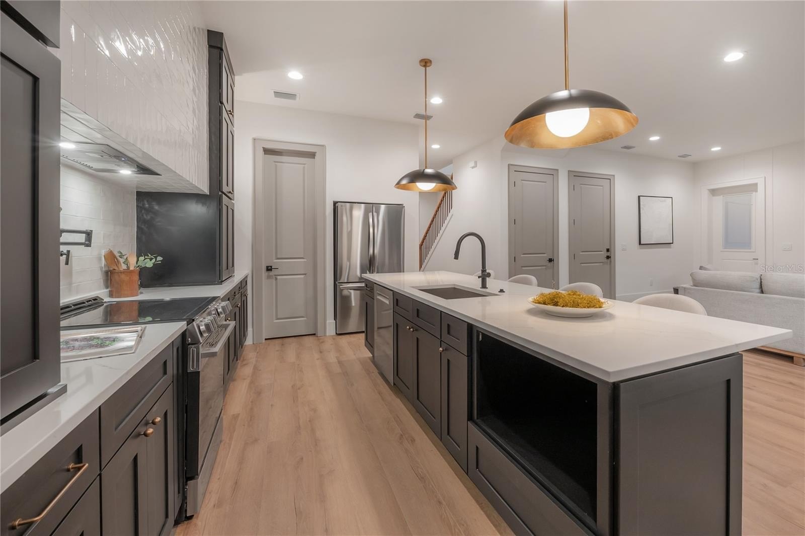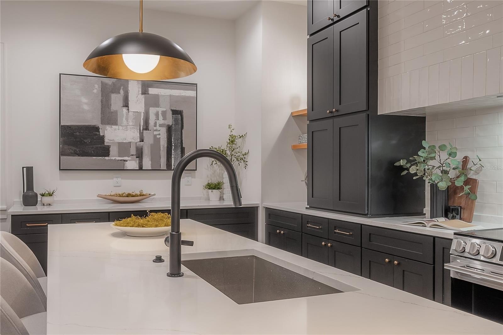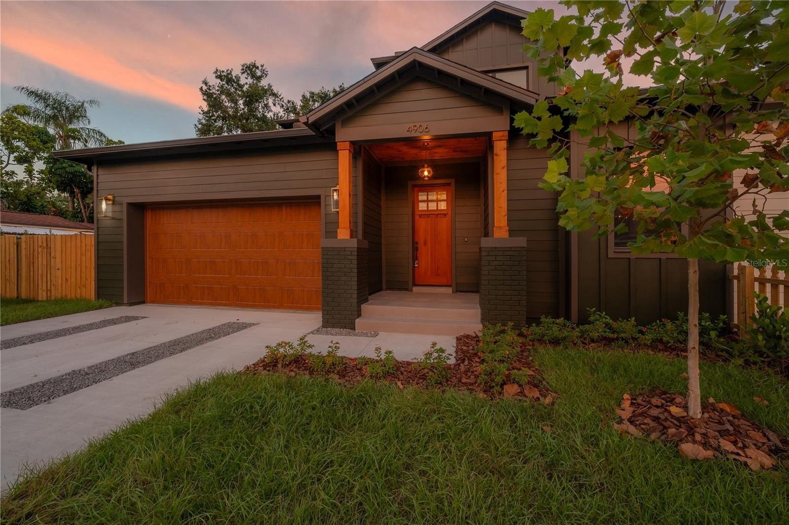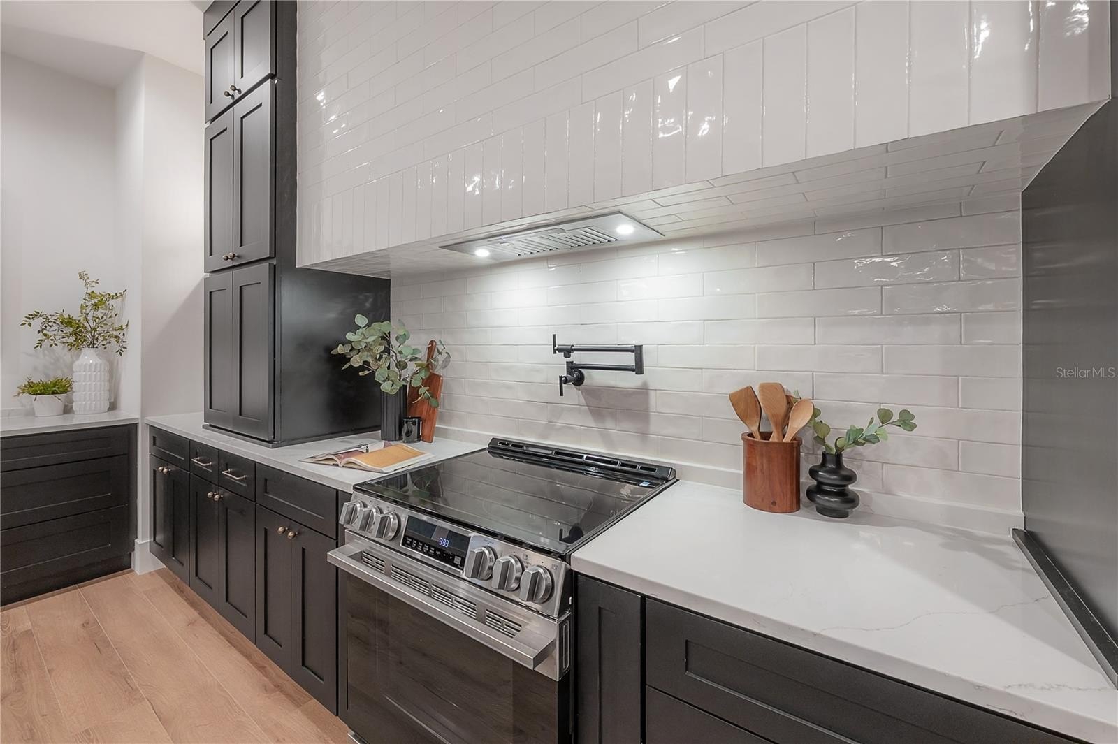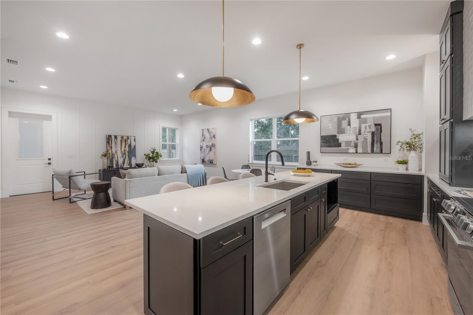 Located on a corner lot in Southeast Seminole Heights, this is the only home of its kind in the neighborhood—a semi detached single-family residence that feels private and spacious. Inside, you’ll find four bedrooms, three bathrooms, and more than 2,100 square feet of living space filled with thoughtful details like soaring 10-foot ceilings, 8-foot solid-core doors, custom tile accents, and high end designer lighting throughout. The chef’s kitchen is the heart of the home, offering white quartz countertops on an oversized island, large pantry, an upgraded appliance package, and a dramatic, tiled custom vent hood that is surrounded by sleek black storage towers with brass accents. The downstairs living areas are open and spacious, and also offers a full bathroom and bedroom (perfect for a home office). The upstairs layout offers a laundry room conveniently located between the bedrooms; 2 guest bedrooms with reach-in closets and a full bathroom, as well as a spacious primary suite. The primary bedroom include dual walk-in closets, and the most luxurious and tastefully designed en suite bathroom with pearl-finished vertical tiles, glass enclosed shower, green and polished brass accents, and a separate water closet. A rare attached two-car garage adds convenience, while the fully fenced backyard with a covered porch provides the perfect outdoor space for entertaining, relaxing, or enjoying the Florida sunshine.