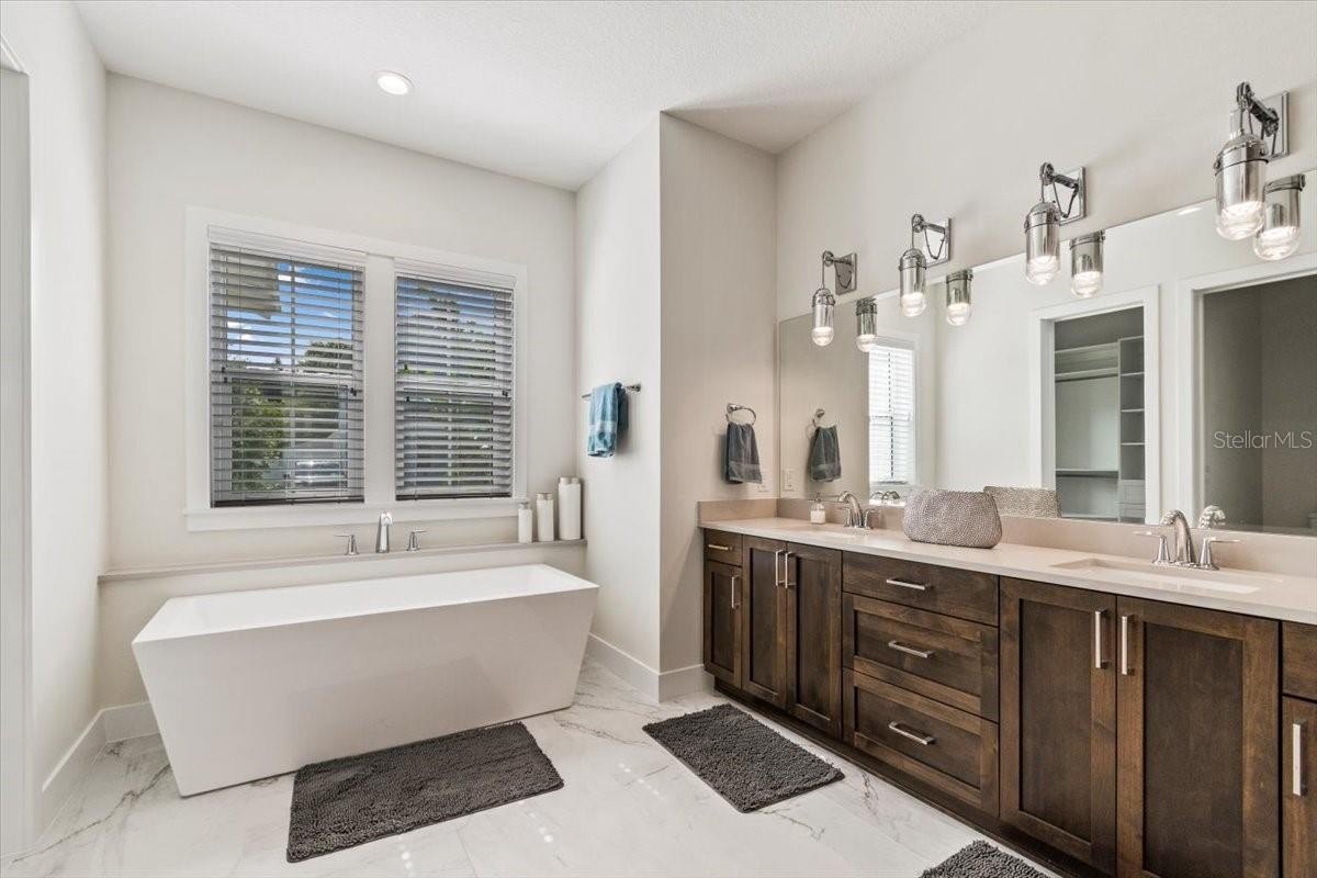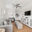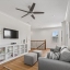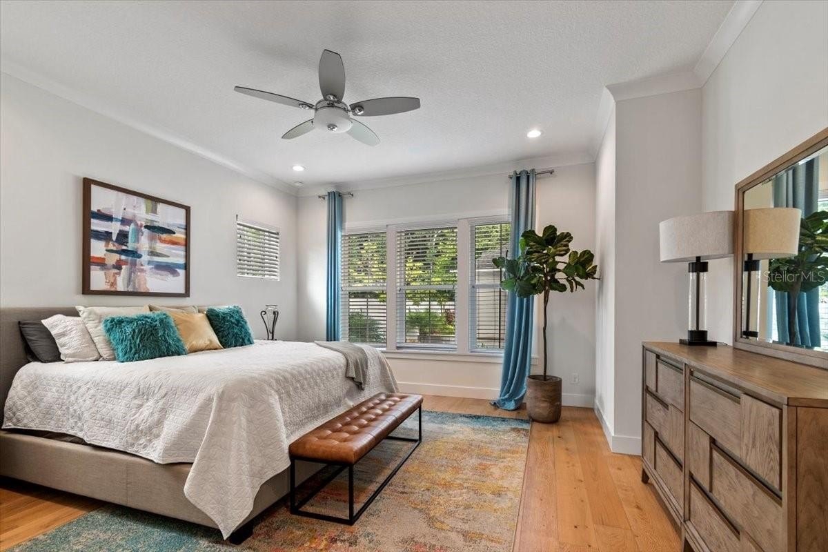 The first-floor owner’s suite is a true retreat, with hardwood floors, two generous walk-in closets, and a spa-inspired bath. Engineered hardwood flows through the main living areas, while the kitchen is designed for both gathering and everyday living—featuring a large island with seating, quartz countertops, ceiling-height wood cabinetry, and Bosch appliances, including a built-in refrigerator and gas cooktop. Ten-foot ceilings, custom wood beams, crown moulding, and an open stairwell give the home a bright, inviting feel.