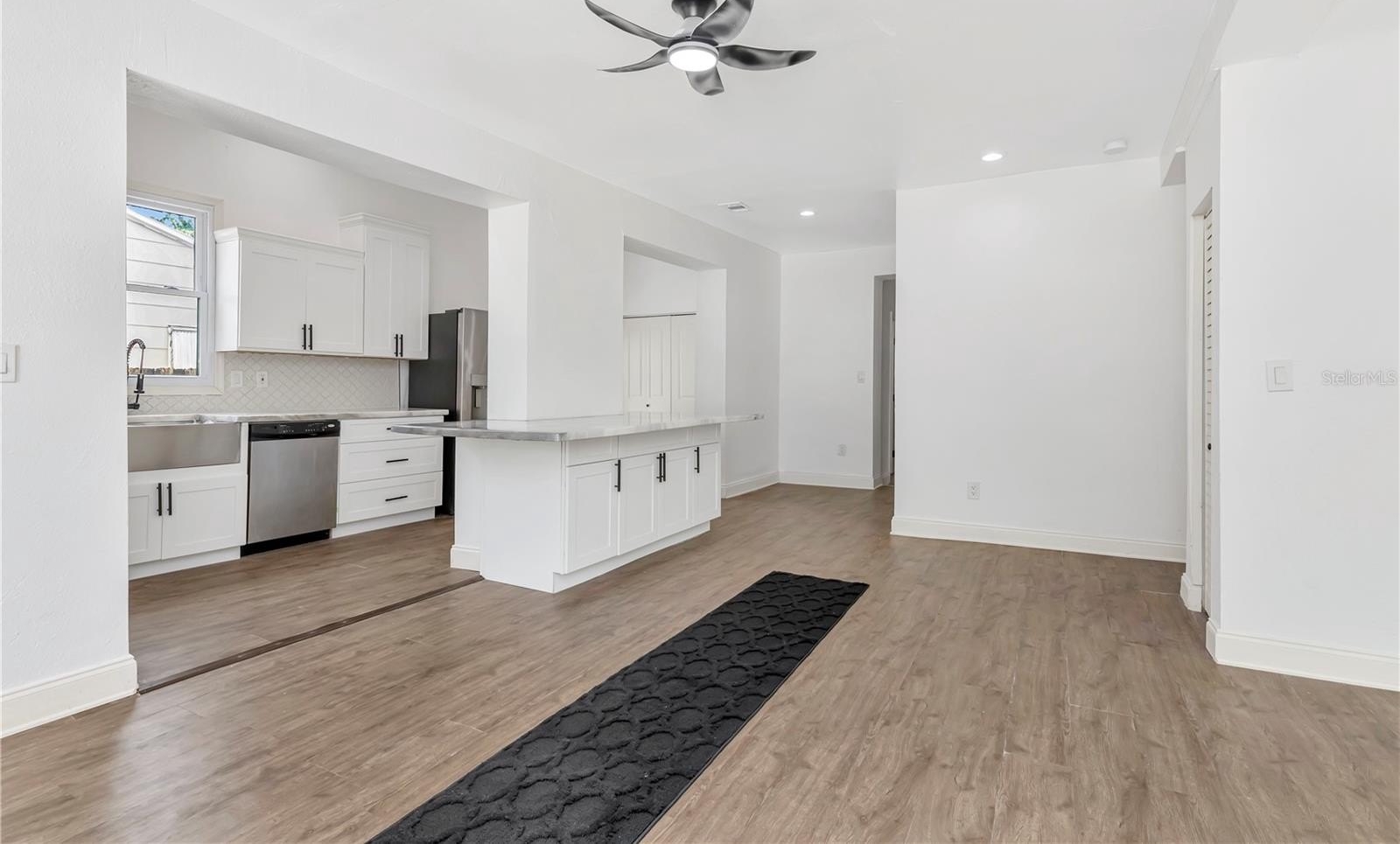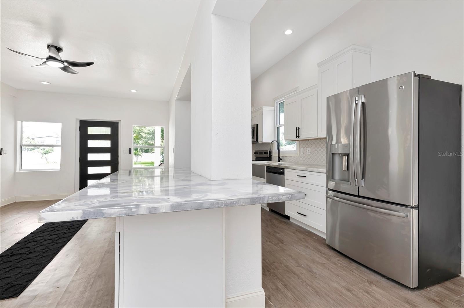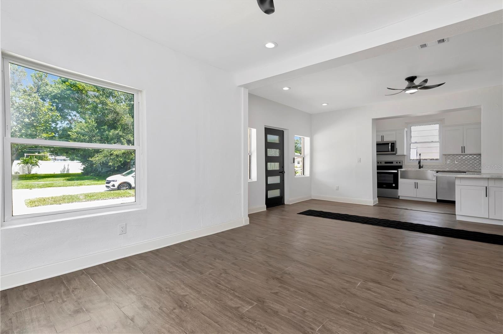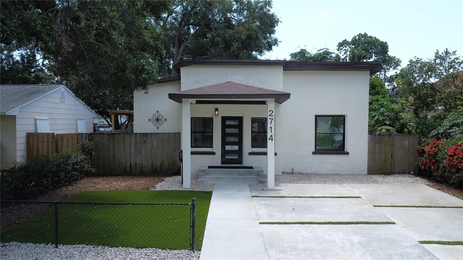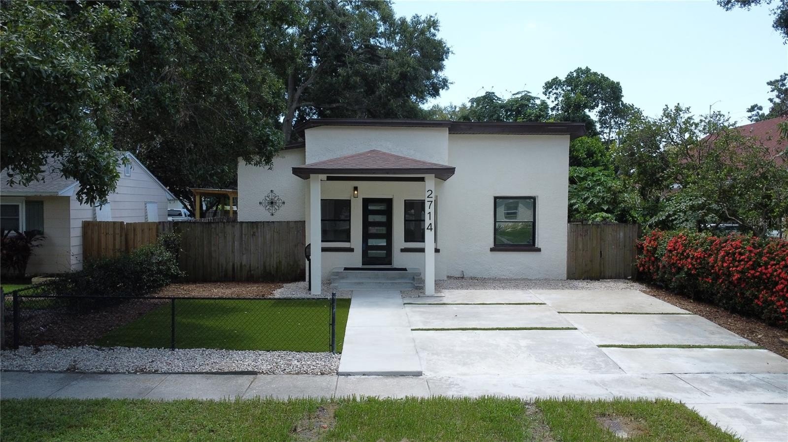 This approximately 1,800 square foot house features four bedrooms and three bathrooms. The property offers a spacious lot with lush landscaping, including a new patio, providing ample space for outdoor living and entertaining. The open floor plan allows for an abundance of natural light throughout. The bathrooms are spacious and feature ample counter space, sleek fixtures, and modern design. The exterior of the home boasts a calming aesthetic, featuring a covered entryway and ample parking on the newly poured driveway. The kitchen boasts modern appliances, a large counter for all your prep and entertaining. This property has been updated, adding the new primary suite, two new bathrooms, and a reimagined kitchen. An indoor laundry room adds convenience and functionality to the home.